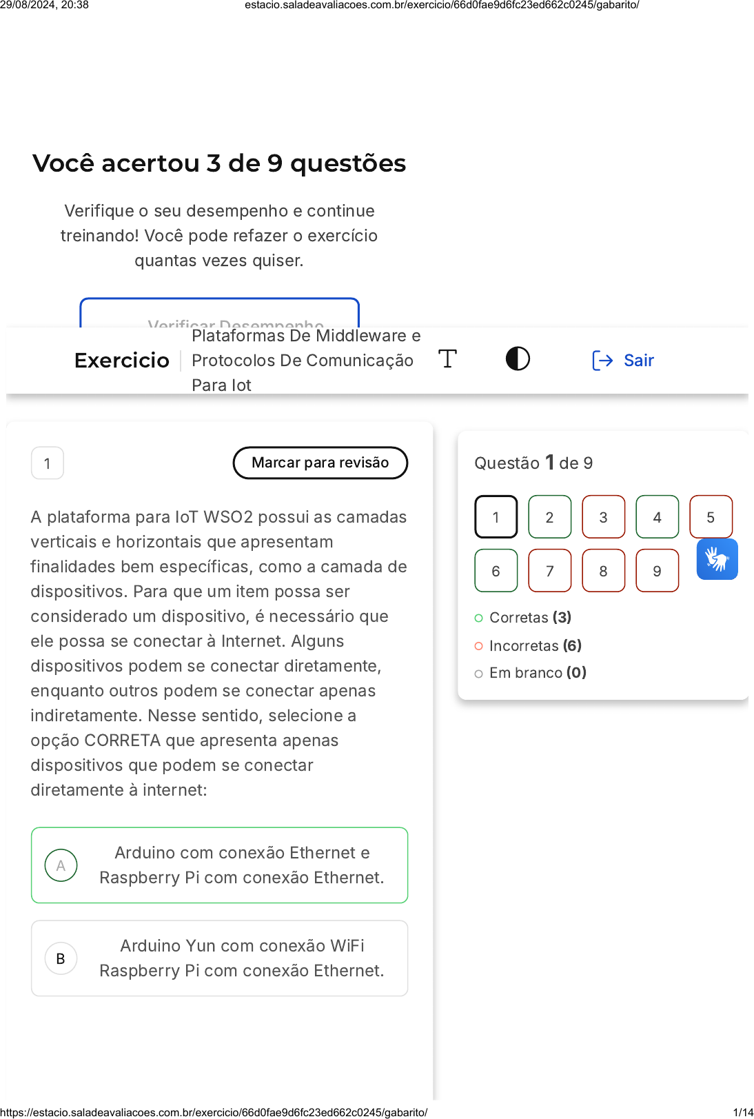 <p>Você acertou 3 de 9 questões</p><p>Verifique o seu desempenho e continue</p><p>treinando! Você pode refazer o exercício</p><p>quantas vezes quiser.</p><p>Verificar Desempenho</p><p>A</p><p>B</p><p>1 Marcar para revisão</p><p>A plataforma para IoT WSO2 possui as camadas</p><p>verticais e horizontais que apresentam</p><p>finalidades bem específicas, como a camada de</p><p>dispositivos. Para que um item possa ser</p><p>considerado um dispositivo, é necessário que</p><p>ele possa se conectar à Internet. Alguns</p><p>dispositivos podem se conectar diretamente,</p><p>enquanto outros podem se conectar apenas</p><p>indiretamente. Nesse sentido, selecione a</p><p>opção CORRETA que apresenta apenas</p><p>dispositivos que podem se conectar</p><p>diretamente à internet:</p><p>Arduino com conexão Ethernet e</p><p>Raspberry Pi com conexão Ethernet.</p><p>Arduino Yun com conexão WiFi</p><p>Raspberry Pi com conexão Ethernet.</p><p>Questão 1 de 9</p><p>Corretas �3�</p><p>Incorretas �6�</p><p>Em branco �0�</p><p>1 2 3 4 5</p><p>6 7 8 9</p><p>Exercicio</p><p>Plataformas De Middleware e</p><p>Protocolos De Comunicação</p><p>Para Iot</p><p>Sair</p><p>29/08/2024, 20:38 estacio.saladeavaliacoes.com.br/exercicio/66d0fae9d6fc23ed662c0245/gabarito/</p><p>https://estacio.saladeavaliacoes.com.br/exercicio/66d0fae9d6fc23ed662c0245/gabarito/ 1/14</p><p>C</p><p>D</p><p>E</p><p>Raspberry Pi com conexão Ethernet,</p><p>ou WiFi e dispositivos Bluetooth.</p><p>Intel Galileo com conexão Ethernet, ou</p><p>WiFi e dispositivos Bluetooth.</p><p>Arduino com conexão Ethernet e</p><p>dispositivos de comunicação via rádio</p><p>de baixa potência para um Raspberry</p><p>Pi.</p><p>Resposta incorreta</p><p>Opa! A alternativa correta é a letra</p><p>A. Confira o gabarito comentado!</p><p>Gabarito Comentado</p><p>A alternativa correta é a letra A� "Arduino</p><p>com conexão Ethernet e Raspberry Pi com</p><p>conexão Ethernet". Ambos os dispositivos,</p><p>Arduino e Raspberry Pi, quando equipados</p><p>com uma conexão Ethernet, são capazes</p><p>de se conectar diretamente à Internet. O</p><p>Arduino é uma plataforma de prototipagem</p><p>eletrônica de hardware livre e de placa</p><p>única, enquanto o Raspberry Pi é um</p><p>computador do tamanho de um cartão de</p><p>crédito que se conecta a um monitor de</p><p>computador ou TV e usa um teclado e um</p><p>mouse padrão. Ambos são muito utilizados</p><p>em projetos de Internet das Coisas �IoT)</p><p>devido à sua versatilidade e capacidade de</p><p>conexão à Internet.</p><p>2 Marcar para revisão</p><p>29/08/2024, 20:38 estacio.saladeavaliacoes.com.br/exercicio/66d0fae9d6fc23ed662c0245/gabarito/</p><p>https://estacio.saladeavaliacoes.com.br/exercicio/66d0fae9d6fc23ed662c0245/gabarito/ 2/14</p><p>A</p><p>B</p><p>C</p><p>D</p><p>E</p><p>Existem diversas plataformas para</p><p>desenvolvimento de projetos de IoT. Cada uma</p><p>dessas plataformas possui características que</p><p>vão desde o tempo de resposta a eventos,</p><p>gerenciamento de dados, segurança e custos,</p><p>que devem ser consideradas para a escolha de</p><p>uma plataforma específica. A ThingsBoard é</p><p>uma dessas plataformas que, entre outras</p><p>características, possui código aberto. Em</p><p>relação à plataforma ThingsBoard, selecione a</p><p>opção CORRETA�</p><p>É gratuita para uso pessoal, mas deve</p><p>ser paga quando o uso for comercial.</p><p>É disponível para a maioria das</p><p>distribuições do Linux, mas não para o</p><p>Windows.</p><p>É uma plataforma do lado do servidor</p><p>de código aberto que permite</p><p>monitorar e controlar seus dispositivos</p><p>IoT.</p><p>Utiliza os protocolos CoAP, XMPP,</p><p>HTTP.</p><p>Ela precisa de aplicações de terceiros</p><p>para fazer a integração entre</p><p>dispositivos e aplicações WEB.</p><p>Resposta correta</p><p>Parabéns, você selecionou a</p><p>alternativa correta. Confira o</p><p>gabarito comentado!</p><p>Gabarito Comentado</p><p>29/08/2024, 20:38 estacio.saladeavaliacoes.com.br/exercicio/66d0fae9d6fc23ed662c0245/gabarito/</p><p>https://estacio.saladeavaliacoes.com.br/exercicio/66d0fae9d6fc23ed662c0245/gabarito/ 3/14</p><p>A</p><p>B</p><p>A alternativa correta é a C. A ThingsBoard</p><p>é uma plataforma de código aberto do lado</p><p>do servidor que permite monitorar e</p><p>controlar dispositivos IoT. Isso significa que</p><p>ela fornece uma infraestrutura para</p><p>gerenciar a conectividade, a coleta de</p><p>dados, o processamento e a visualização</p><p>de informações provenientes de</p><p>dispositivos IoT. Portanto, a ThingsBoard</p><p>não é apenas gratuita para uso pessoal ou</p><p>disponível apenas para algumas</p><p>distribuições do Linux, nem precisa de</p><p>aplicações de terceiros para a integração</p><p>entre dispositivos e aplicações WEB, como</p><p>sugerem as outras alternativas.</p><p>3 Marcar para revisão</p><p>O XMPP é um protocolo aberto que é baseado</p><p>em XML, desenvolvido originalmente para</p><p>mensagens instantâneas e informação de</p><p>presença formalizado pelo IETF. A unidade mais</p><p>básica de comunicação do XMPP é chamada de</p><p>stanza. A respeito dos tipos de stanza do</p><p>XMPP, selecione a opção correta:</p><p>< mensage / >: é um mecanismo que</p><p>trata do conteúdo da mensagem</p><p>garantindo a proteção através de</p><p>algoritmos de criptografia.</p><p>< presence / >: é um mecanismo</p><p>usado pelas entidades que se</p><p>inscreveram a uma determinada</p><p>entidade para receber informações</p><p>sobre ela.</p><p>29/08/2024, 20:38 estacio.saladeavaliacoes.com.br/exercicio/66d0fae9d6fc23ed662c0245/gabarito/</p><p>https://estacio.saladeavaliacoes.com.br/exercicio/66d0fae9d6fc23ed662c0245/gabarito/ 4/14</p><p>C</p><p>D</p><p>E</p><p>< iq / > : é um mecanismo do tipo</p><p>publicação-assinatura semelhante em</p><p>alguns aspectos ao HTTP.</p><p>< req / >: é um mecanismo</p><p>responsável p