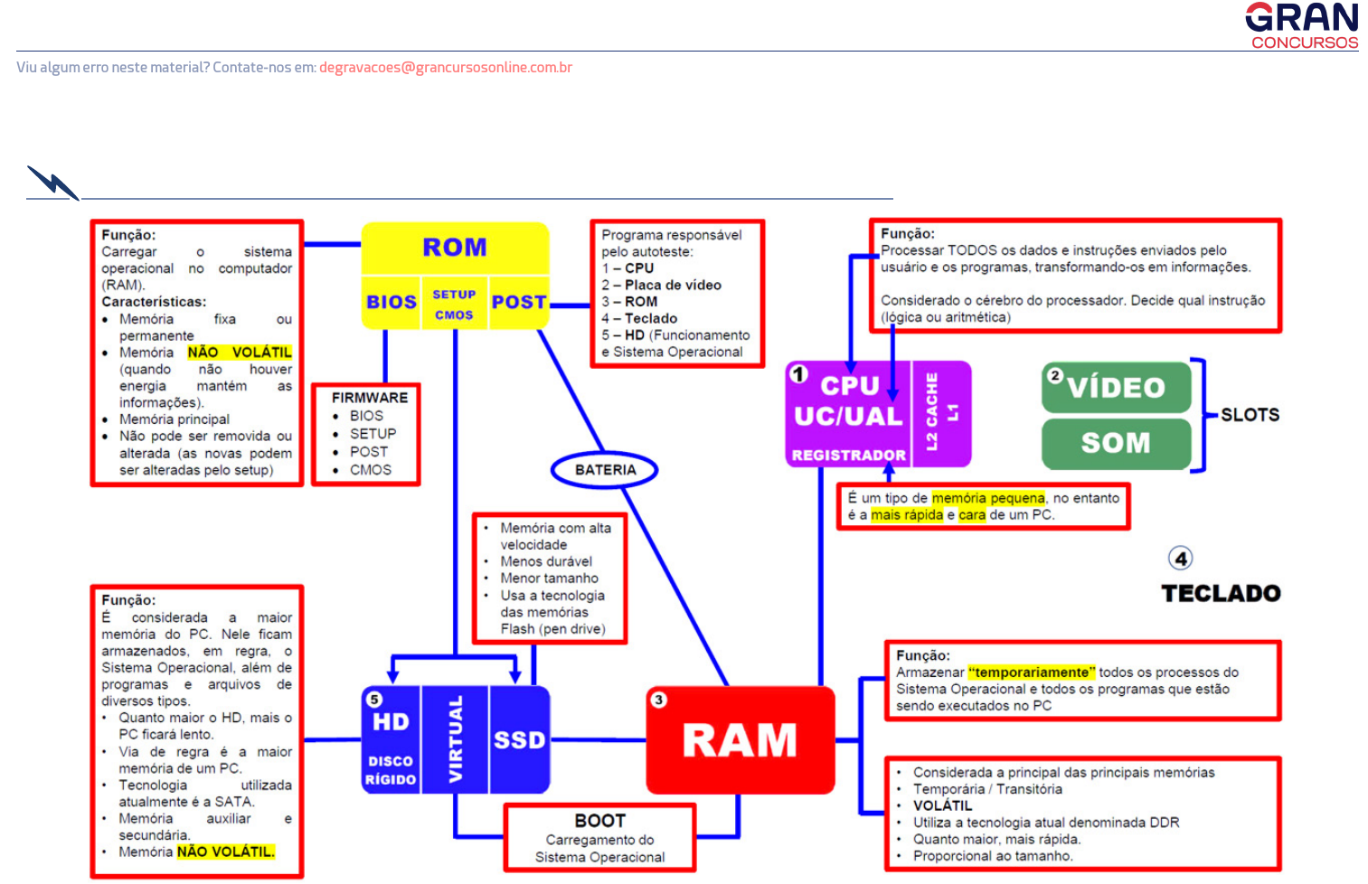 <p>1www.grancursosonline.com.br</p><p>Viu algum erro neste material? Contate-nos em: degravacoes@grancursosonline.com.br</p><p>Hardware VI</p><p>INFORMÁTICA</p><p>HARDWARE VI</p><p>RELEMBRANDO</p><p>www.grancursosonline.com.br</p><p>2www.grancursosonline.com.br</p><p>Viu algum erro neste material? Contate-nos em: degravacoes@grancursosonline.com.br</p><p>A</p><p>N</p><p>O</p><p>TA</p><p>ÇÕ</p><p>E</p><p>S</p><p>Hardware VI</p><p>INFORMÁTICA</p><p>Como já estudado, a memória RAM é limitada, por exemplo, por 4 GB. Ela não é a maior,</p><p>nem a menor memória do computador. Isso significa, nesse casso, que há 4GB disponíveis</p><p>para executar programas.</p><p>Embora a memória RAM seja limitada, muitas vezes, os usuários requisitam tarefas que</p><p>excedem esse limite, fazendo com que ocasione a lentidão da máquina ou mesmo a ocor-</p><p>rência da popular “tela azul”.</p><p>MEMÓRIA VIRTUAL</p><p>Para que o sistema operacional controle essas tarefas e evite a “tela azul”, o estouro de</p><p>memória, criou-se a memória virtual, presente no disco rígido.</p><p>Trata-se de uma memória criada na instalação do sistema operacional, seja ele Linux,</p><p>Windows etc. Ela tem um espaço variável, a depender do tamanho do disco rígido.</p><p>Quando a execução da RAM ocasionará o estouro de memória, o sistema desvia os</p><p>programas à memória virtual, atuando ela como reserva da memória RAM. Porém, com a</p><p>memória virtual funcionando principalmente no HD, ocorre uma grande lentidão no sistema.</p><p>Ela também é chamada de page-file, paginação, paginada, swap ou memória de troca.</p><p>DIRETO DO CONCURSO</p><p>37. (QUADRIX/CREFITO 6/TÉCNICO/2022) A memória em que o conjunto de endereços</p><p>da memória principal disponíveis para um ou mais programas passa a ser maior que a</p><p>quantidade real de endereços dessa memória principal e que pode ser implementada</p><p>pelos mecanismos paginação e segmentação é a memória</p><p>a. virtual.</p><p>b. cache.</p><p>c. externa.</p><p>d. flash.</p><p>e. ROM.</p><p>COMENTÁRIO</p><p>A memória principal mencionada no enunciado se trata da memória RAM.</p><p>5m</p><p>www.grancursosonline.com.br</p><p>3www.grancursosonline.com.br</p><p>Viu algum erro neste material? Contate-nos em: degravacoes@grancursosonline.com.br</p><p>A</p><p>N</p><p>O</p><p>TA</p><p>ÇÕ</p><p>E</p><p>S</p><p>Hardware VI</p><p>INFORMÁTICA</p><p>38. (CEBRASPE/DPF/ESCRIVÃO/2018) A técnica de swapping consiste em transferir tem-</p><p>porariamente um processo da memória para o disco do computador e depois carregá-lo</p><p>novamente em memória.</p><p>COMENTÁRIO</p><p>“Swapping” significa a ocorrência de uma troca, e a memória mencionada no enunciado se</p><p>trata da memória RAM</p><p>PIRÂMIDE DE CUSTO, CAPACIDADE E VELOCIDADE DE MEMÓRIAS</p><p>Há questões que realizam comparações entre as memórias, logo esta pirâmide pode ser</p><p>bastante útil nesse sentido:</p><p>Obs.: embora disco e magnético e SSD se encontrem na mesma seção da pirâmide, se</p><p>comparados entre si, o SSD está acima do disco magnético nos critérios adotados.</p><p>10m</p><p>www.grancursosonline.com.br</p><p>4www.grancursosonline.com.br</p><p>Viu algum erro neste material? Contate-nos em: degravacoes@grancursosonline.com.br</p><p>A</p><p>N</p><p>O</p><p>TA</p><p>ÇÕ</p><p>E</p><p>S</p><p>Hardware VI</p><p>INFORMÁTICA</p><p>É possível fazer uma analogia também com pilotos de Fórmula 1, associando da mais</p><p>alta para a mais baixa seção da pirâmide, Registrador, Cache, Memória Principal (RAM) e</p><p>Disco Magnético ou SSD com, respectivamente, Ayrton Senna, Hamilton, Felipe Massa e</p><p>Rubens Barrichello.</p><p>DIRETO DO CONCURSO</p><p>39. (FGV/SEFAZ/BA/AGENTES DE TRIBUTOS ESTADUAIS/ADMINISTRAÇÃO E FINAN-</p><p>ÇAS/2022) Os notebooks possuem diversos tipos de memória que possuem diferentes</p><p>finalidades, capacidades de armazenamento e velocidades de funcionamento. Assinale</p><p>a opção que indica a hierarquia da memória, em termos de crescimento de velocidades</p><p>de acesso.</p><p>a. Memória secundária – memória principal – memória cache e registradores.</p><p>b. Memória principal – memória secundária – memória cache e registradores.</p><p>c. Memória cache – memória principal – memória secundária e registradores.</p><p>d. Memória cache – memória secundária – memória principal e registradores.</p><p>e. Registradores – memória cache – memória principal e memória secundária.</p><p>40. (FGV/CÂMARA/ARACAJU/SE/TÉCNICO/2021) Com relação aos dispositivos de arma-</p><p>zenamento de dados: Hard Disk (HD), Solid State Drive (SSD) e Blu-ray Drive, a opção</p><p>em que estão ordenados conforme sua velocidade de acesso aleatório aos dados ar-</p><p>mazenados, do mais lento para o mais rápido, é:</p><p>a. SSD → HD → Blu-ray Drive;</p><p>b. HD → Blu-ray Drive → SSD;</p><p>c. Blu-ray Drive → HD → SSD;</p><p>d. HD → SSD → Blu-ray Drive;</p><p>e. Blu-ray Drive → SSD → HD.</p><p>15m</p><p>www.grancursosonline.com.br</p><p>5www.grancursosonline.com.br</p><p>Viu algum erro neste material? Contate-nos em: degravacoes@grancursosonline.com.br</p><p>Hardware VI</p><p>INFORMÁTICA</p><p>A</p><p>N</p><p>O</p><p>TA</p><p>ÇÕ</p><p>E</p><p>S</p><p>DISPOSITIVOS PERIFÉRICOS</p><p>Os dispositivos periféricos podem ser de entrada, saída e entrada e saída. Trata-se de</p><p>dispositivos externos ao computador, embora alguns possam se localizar no gabinete, mas</p><p>servem para interagir com a máquina ou executar tarefas externas a ela.</p><p>Os periféricos de entrada são aqueles dispositivos que enviam dados para o processa-</p><p>dor, ou seja, dados que “entram” no processador. Teclado, mouse e webcam, por exemplo,</p><p>são periféricos de entrada. Além desses, também o há scanner.</p><p>Obs.: é importante lembrar que a carcaça do computado