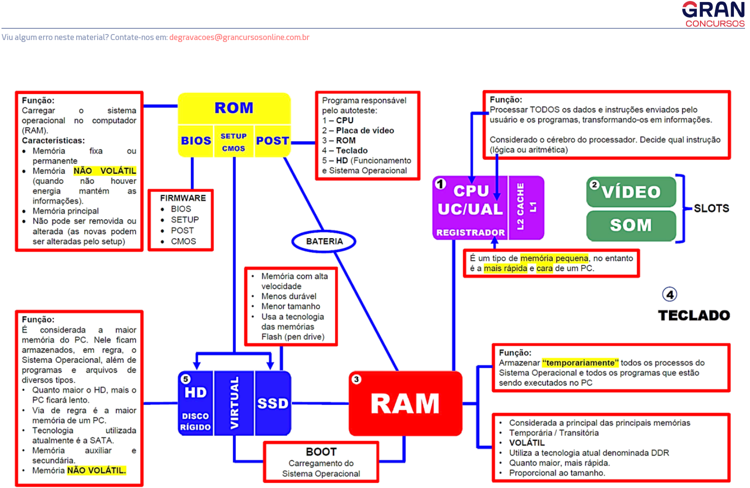1www.grancursosonline.com.br Viu algum erro neste material? Contate-nos em: degravacoes@grancursosonline.com.br Hardware II INFORMÁTICA HARDWARE II 2www.grancursosonline.com.br Viu algum erro neste material? Contate-nos em: degravacoes@grancursosonline.com.br A N O TA ÇÕ E S Hardware II INFORMÁTICA MEMÓRIA ROM (MEMÓRIA SOMENTE LEITURA) Trata-se de um chip que já vem de fábrica com informações gravadas (programação embarcada – Firmware). Obs.: programação embarcada é uma memória que já vem de fábrica com dados gravados. • Função: Carregar o sistema operacional no computador (RAM). Boot. • Características: – Memória fixa ou permanente; – Memória NÃO VOLÁTIL (quando não houver energia mantém as informações); – Memória principal; – Não pode ser removida ou alterada (as novas podem ser alteradas pelo setup); • Tecnologia atual: FlashROM. (tecnologia dos pendrives). Obs.: atualmente pode ser alterada através de softwares. • Post: Programa responsável pelo autoteste: 1 – CPU 2 – Placa de Vídeo 3 – ROM 4 – Teclado 5 – HD (Funcionamento e Sistema Operacional) Quando o computador é ligado, a memória ROM – por meio da BIOS – manda instruções para a CPU. Essa vai operar o restante do computador. 3www.grancursosonline.com.br Viu algum erro neste material? Contate-nos em: degravacoes@grancursosonline.com.br A N O TA ÇÕ E S Hardware II INFORMÁTICA CPU (UNIDADE CENTRAL DE PROCESSAMENTO) • Função: processar TODOS os dados e instruções enviados pelo usuário e os progra- mas, transformando-os em informações. • UC/UAL: considerado o cérebro do processador. Decide qual será a instrução (lógica ou aritmética). • Registrador: é um tipo de memória pequena, no entanto é a mais rápida e cara de um computador. Após testar a Unidade Central de Processamento (CPU) a memória ROM testa a placa de vídeo (momento em que a tela do computador é ligada). O próximo passo da memória ROM será testar a memória RAM (Memória de Acesso Ale- atório) do computador. RAM (MEMÓRIA DE ACESSO ALEATÓRIO) • Função: Armazenar “temporariamente” todos os processos do Sistema Operacional e todos os programas que estão sendo executados no computador. • Características: – Considerada a memória principal; – Temporária/Transitória; – Volátil; – Utiliza a tecnologia atual denominada DDR; – Quanto maior, mais rápida; – Proporcional ao tamanho. Após testar a memória RAM, a memória ROM testa o teclado (momento em que as luzes do teclado são acesas). Obs.: Nos computadores atuais o teclado deixou de ser um dispositivo obrigatório. Portan- to, o não funcionamento dele não impede o funcionamento do computador. O último passo da memória ROM será testar o HD (disco rígido) do computador. 5m 4www.grancursosonline.com.br Viu algum erro neste material? Contate-nos em: degravacoes@grancursosonline.com.br A N O TA ÇÕ E S Hardware II INFORMÁTICA HD (HARD DISK – DISCO RÍGIDO) • Função: é considerada a maior memória do computador. Nele ficam armazenados, em regra, o Sistema Operacional, além de programas e arquivos de diversos tipos. • Características: – Quanto maior o HD, mais o computador ficará lento; – É a maior memória do computador. – A tecnologia utilizada atualmente é a SATA. – Memória auxiliar e secundária; – Memória não volátil. • Virtual: BOOT (carregamento do Sistema Operacional) • SSD (Unidade em Estado Sólido): – Memória com alta velocidade; – Menos durável; – Menor tamanho; – Usa a tecnologia das memórias Flash (pendrive); No momento em que o Disco Rígido é ativado, ocorre o BOOT (carregamento do Sis- tema Operacional realizado pela memória RAM). Ou seja, a memória ROM envia o comando para o Disco Rígido realizar o BOOT (carregamento do Sistema Operacional) por meio da memória RAM. A memória ROM consegue realizar o teste das demais partes do computador por meio dos firmwares (conjunto de três programas). 5www.grancursosonline.com.br Viu algum erro neste material? Contate-nos em: degravacoes@grancursosonline.com.br A N O TA ÇÕ E S Hardware II INFORMÁTICA FIRMWARES • BIOS (Basic Input Output System): Sistema Básico de Entrada e Saída, que é respon- sável por “ensinar” ao processador da máquina a operar com dispositivos básicos, como a unidade de disquete, o disco rígido e o vídeo em modo texto. As instruções da BIOS são de fábrica (definidas de acordo com o modelo de processador da placa-mãe). Obs.: algumas instruções da BIOS podem ser alteradas, como a data e a hora do compu- tador. Além disso, a ordem do boot também pode ser alterada (ao invés da memória RAM consultar o HD ela pode consultar um pendrive ou um cd). • Setup (configuração): é o programa responsável por alterar os parâmetros armaze- nados na memória de configuração (CMOS). Obs.: por meio do setup é possível realizar as alterações de parâmetros da BIOS. Ele pode ser acessado ao pressionar a tecla “delete” durante a inicialização do computador. 10m 6www.grancursosonline.com.br Viu algum erro neste material? Contate-nos em: degravacoes@grancursosonline.com.br A N O TA ÇÕ E S Hardware II INFORMÁTICA DIRETO DO CONCURSO 1. (FGV/CÂMARA/ARACAJU/SE/TÉCNICO/2021) A configuração de software básico (BIOS, UEFI), conhecida como SETUP, permite determinar certos aspectos da opera- ção do computador. Analise as afirmativas a seguir a respeito do SETUP, considerando V para a(s) afirmativa(s) verdadeira(s) e F para a(s) falsa(s). ( ) � Permite definir a data e a hora do relógio interno. ( ) � Deve ser acessado após a carga do sistema operacional. ( ) � Permite a mudança da ordem de boot dos dispositivos de armazenamento. A sequência correta é: a. V, F, V; b. F, V, F; c. V, V, F; d. F, V, V; e. V, F, F. 7www.grancursosonline.com.br Viu algum erro neste material? Contate-nos em: degravacoes@grancursosonline.com.br A N O TA ÇÕ E S H