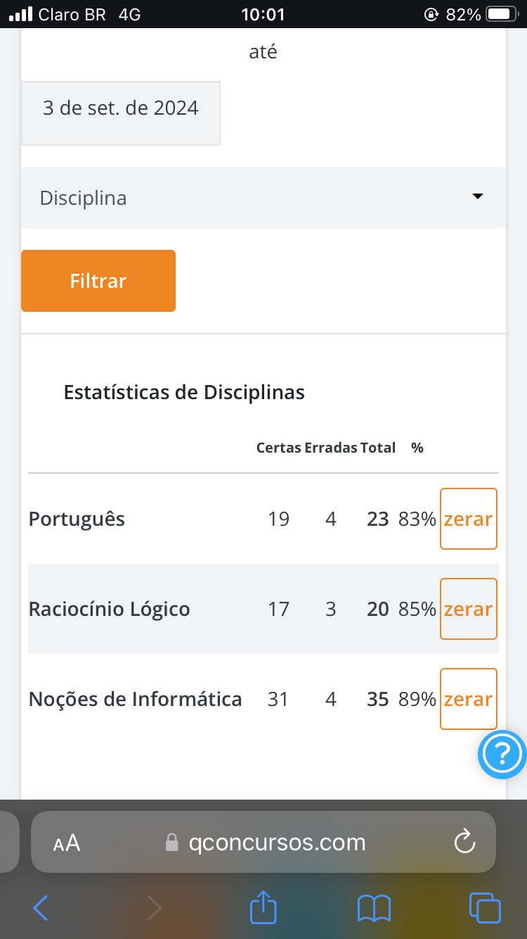 <p>Claro BR 4G 10:01 82% até 3 de set. de 2024 Disciplina Filtrar Estatísticas de Disciplinas Certas Erradas Total % Português 19 4 23 83% zerar Raciocínio Lógico 17 3 20 85% zerar Noções de Informática 31 4 35 89% zerar ? AA qconcursos.com</p>