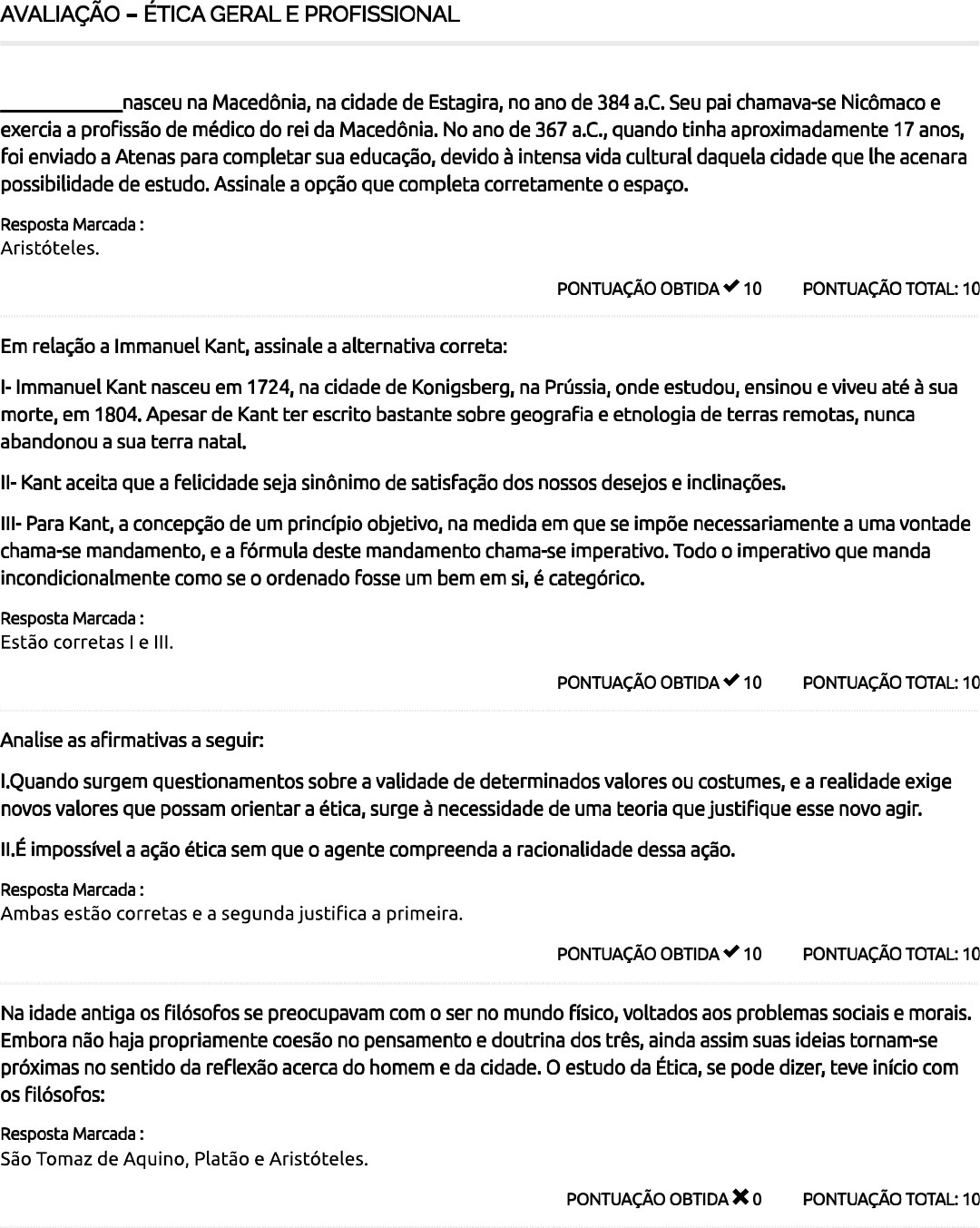 <p>AVALIAÇÃO ÉTICA GERAL E PROFISSIONAL nasceu na Macedônia, na cidade de Estagira, no ano de 384 a.C. Seu pai chamava-se Nicômaco e exercia a profissão de médico do rei da Macedônia. No ano de 367 a.C., quando tinha aproximadamente 17 anos, foi enviado a Atenas para completar sua educação, devido à intensa vida cultural daquela cidade que lhe acenara possibilidade de estudo. Assinale a opção que completa corretamente o espaço. Resposta Marcada Aristóteles. PONTUAÇÃO OBTIDA 10 PONTUAÇÃO TOTAL: 10 Em relação a Immanuel Kant, assinale a alternativa correta: I- Immanuel Kant nasceu em 1724, na cidade de Konigsberg, na Prússia, onde estudou, ensinou e viveu até à sua morte, em 1804. Apesar de Kant ter escrito bastante sobre geografia e etnologia de terras remotas, nunca abandonou a sua terra natal. II- Kant aceita que a felicidade seja sinônimo de satisfação dos nossos desejos e inclinações. III- Para Kant, a concepção de um princípio objetivo, na medida em que se impõe necessariamente a uma vontade chama-se mandamento, e a fórmula deste mandamento chama-se imperativo. Todo o imperativo que manda incondicionalmente como se o ordenado fosse um bem em si, é categórico. Resposta Marcada Estão corretas e III. PONTUAÇÃO OBTIDA 10 PONTUAÇÃO TOTAL: 10 Analise as afirmativas a seguir: surgem questionamentos sobre a validade de determinados valores costumes, e a realidade exige novos valores que possam orientar a ética, surge à necessidade de uma teoria que justifique esse novo impossível a ação ética sem que o agente compreenda a racionalidade dessa ação. Resposta Marcada : Ambas estão corretas e a segunda justifica a primeira. PONTUAÇÃO OBTIDA 10 PONTUAÇÃO TOTAL: 10 Na idade antiga os filósofos se preocupavam com o ser no mundo físico, voltados aos problemas sociais e morais. Embora não haja propriamente coesão no pensamento e doutrina dos três, ainda assim suas ideias tornam-se próximas no sentido da reflexão acerca do homem e da cidade. o estudo da Ética, se pode dizer, teve início com os filósofos: Resposta Marcada São Tomaz de Aquino, Platão e Aristóteles. PONTUAÇÃO OBTIDA 0 PONTUAÇÃO TOTAL: 10</p><p>Sobre a etimologia da palavra ética. Assinale a alternativa correta: Resposta Marcada : A palavra ética é de origem grega, derivada de ethos, que diz respeito ao costume ou mesmo aos hábitos dos homens. PONTUAÇÃO OBTIDA 10 PONTUAÇÃO TOTAL: 10 É o estudo dos costumes de uma determinada sociedade numa determinada época e lugar. Assinale a alternativa correta: Resposta Marcada Moral. PONTUAÇÃO OBTIDA 10 PONTUAÇÃO TOTAL: 10 Para o dia a dia da organização e ao ambiente do trabalho no sentido ético que buscam melhor e maior aproveitamento do profissional, podem ser citados aqui alguns pontos importantes, sendo eles, EXCETO : Resposta Marcada : Menor nível de produção na empresa. PONTUAÇÃO OBTIDA 10 PONTUAÇÃO TOTAL: 10 Sobre ética protestante e o espírito do capitalismo: I Nos anos de 1904 e 1905 o sociólogo Karl Emil Maximilian Weber (1864-1920) produziu para a revista alemã "Arquivos de Ciências Sociais e Política Social", os textos que deram origem a sua obra "A Ética Protestante e o Espírito do Capitalismo" (no original em alemão Die protestantische Ethik und der 'Geist' des Kapitalismu). II- o cerne da reflexão weberiana é apreender o fenômeno observado na transição do século XVI para o XVII, caracterizado pelo protestantismo relacio-nado diretamente ao desenvolvimento do sistema econômico capitalista. III- Weber foi responsável por relacionar o papel do protestantismo cristão à formação do comportamento típico do capitalismo moderno. E através de seus estudos foram descobertos que os valores do protestantismo (a disciplina ascética, a poupança, a austeridade, a vocação, o dever e a valorização do trabalho como instrumento de salvação da ética protestante) promoveram o surgimento do capitalismo. Resposta Marcada Estão corretas e III. PONTUAÇÃO OBTIDA 10 PONTUAÇÃO TOTAL: 10</p><p>De quem era o questionamento/problema "Qual a origem do mal?" Resposta Marcada : Santo Agostinho. PONTUAÇÃO OBTIDA 10 PONTUAÇÃO TOTAL: 10 Vem do grego que quer dizer o obrigatório, o justo, o adequado. A palavra lógos pode ser interpretada como sendo palavra, discurso, doutrina tratado; então, deontologia significa doutrina, tratado ou ciência do dever ou dos deveres, quer dizer, a doutrina, o tratado ou a ciência do que se deve fazer Quanto ao exposto, assinale a alternativa correta: Resposta Marcada : Deodontologia. PONTUAÇÃO OBTIDA 10 PONTUAÇÃO TOTAL: 10 Total 90 / 100</p>