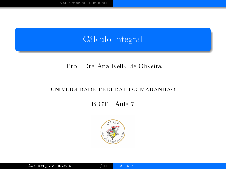 <p>Valor máximo e mínimo</p><p>Cálculo Integral</p><p>Prof. Dra Ana Kelly de Oliveira</p><p>UNIVERSIDADE FEDERAL DO MARANHÃO</p><p>BICT - Aula 7</p><p>Ana Kelly de Oliveira 1 / 12 Aula 7</p><p>Valor máximo e mínimo</p><p>Tópicos da aula de hoje</p><p>1 Valor máximo e mínimo</p><p>Ana Kelly de Oliveira 2 / 12 Aula 7</p><p>Valor máximo e mínimo</p><p>Valor máximo e mínimo</p><p>De�nição</p><p>Uma função de duas variáveis tem um máximo local em (a, b) se</p><p>f(x, y) ≤ f(a, b) quando (x, y) está próximo de (a, b). O número</p><p>f(a, b) é chamado valor máximo local.</p><p>De�nição</p><p>Se f(x, y) ≥ f(a, b) quando (x, y) está próximo de (a, b), então f</p><p>tem um mínimo local em (a, b) e f(a, b) é um valor mínimo</p><p>local.</p><p>Se as inequações da de�nição valerem para todos os pontos (x, y)</p><p>do domínio de f , então f tem um máximo absoluto (ou mínimo</p><p>absoluto) em (a, b).</p><p>Ana Kelly de Oliveira 3 / 12 Aula 7</p><p>Valor máximo e mínimo</p><p>Valor máximo e mínimo</p><p>Ana Kelly de Oliveira 4 / 12 Aula 7</p><p>Valor máximo e mínimo</p><p>Valor máximo e mínimo</p><p>Teorema</p><p>Se f tem um máximo ou mínimo local em (a, b) e as derivadas</p><p>parciais de primeira ordem de f existem nesses pontos, então</p><p>fx(a, b) = 0 e fy(a, b) = 0.</p><p>De�nição</p><p>Um ponto (a, b) é dito ser um ponto crítico (ou ponto estacioná-</p><p>rio) de f se fx(a, b) = 0 e fy(a, b) = 0, ou se uma das derivadas</p><p>parciais não existir.</p><p>Ana Kelly de Oliveira 5 / 12 Aula 7</p><p>Valor máximo e mínimo</p><p>Exemplos</p><p>Exemplo</p><p>Determine os valores extremos de</p><p>f(x, y) = y2 − x2 − 2x− 6y + 14.</p><p>Exemplo</p><p>Determine os valores extremos de f(x, y) = y2 − x2.</p><p>Ana Kelly de Oliveira 6 / 12 Aula 7</p><p>Valor máximo e mínimo</p><p>Testes da segunda derivada</p><p>Suponha que as segundas derivadas parciais de f sejam contí-</p><p>nuas em uma bola aberta com centro em (a, b), e suponha que</p><p>fx(a, b) = 0 e fy(a, b) = 0, ou seja, (a, b) é um ponto crítico de f .</p><p>Seja</p><p>D = D(a, b) = fxx(a, b)fyy(a, b)− [fxy(a, b)]</p><p>2</p><p>(a) Se D > 0 e fxx(a, b) > 0, então f(a, b) é um mínimo local.</p><p>(b) Se D > 0 e fxx(a, b) < 0, então f(a, b) é um máximo local.</p><p>(c) Se D < 0, então f(a, b) não é um mínimo local nem um</p><p>máximo local. Nesse caso, (a, b) é chamado ponto de sela</p><p>de f .</p><p>Ana Kelly de Oliveira 7 / 12 Aula 7</p><p>Valor máximo e mínimo</p><p>Exemplo</p><p>Exemplo</p><p>Determine os valores máximos e mínimos locais e os pontos de</p><p>sela de</p><p>f(x, y) = x4 + y4 − 4xy + 1.</p><p>Ana Kelly de Oliveira 8 / 12 Aula 7</p><p>Valor máximo e mínimo</p><p>Conjuntos fechados de R2</p><p>De�nição</p><p>Considere um conjunto A ⊂ R2. Dizemos que A é um conjunto</p><p>fechado de R2 se ele contém todos os seus pontos da sua</p><p>fronteira.</p><p>Ana Kelly de Oliveira 9 / 12 Aula 7</p><p>Valor máximo e mínimo</p><p>Conjuntos limitados de R2</p><p>De�nição</p><p>Um conjunto limitado em R2 é aquele que está contido em</p><p>algum disco. Em outras palavras, ele é �nito em extensão.</p><p>Teorema (do valor extremo para as funções de duas variáveis)</p><p>Se f for contínua em um conjunto fechado e limitado D de R2,</p><p>então f assume um valor máximo absoluto f(x1, y1) e um valor</p><p>mínimo absoluto f(x2, y2) em alguns pontos (x1, y1) e (x2, y2) de</p><p>D.</p><p>Ana Kelly de Oliveira 10 / 12 Aula 7</p><p>Valor máximo e mínimo</p><p>Como determinar pontos críticos</p><p>Para determinar os valores máximo e mínimo absolutos de uma</p><p>função contínua f em um conjunto fechado e limitado D:</p><p>1 Determine os valores de f nos pontos críticos de f em D.</p><p>2 Determine os valores extremos de f na fronteira de D.</p><p>3 O maior dos valores dos passos 1 e 2 é o valor máximo</p><p>absoluto; o menor desses valores é o valor mínimo absoluto.</p><p>Ana Kelly de Oliveira 11 / 12 Aula 7</p><p>Valor máximo e mínimo</p><p>Exemplo</p><p>Exemplo</p><p>Determine os valores máximo e mínimo absolutos da função</p><p>f(x, y) = x2 − 2xy + 2y</p><p>no retângulo</p><p>D = {(x, y)|0 ≤ x ≤ 3, 0 ≤ y ≤ 2}.</p><p>Ana Kelly de Oliveira 12 / 12 Aula 7</p><p>Valor máximo e mínimo</p>