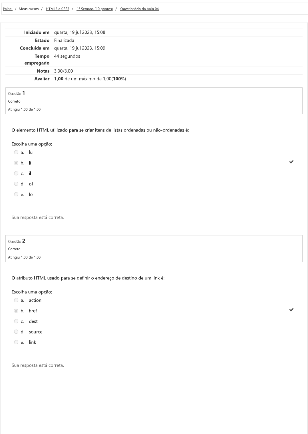 <p>Painel / Meus cursos / HTML5 e CSS3 / Semana (10 pontos) / Questionário da Aula 04 Iniciado em quarta, 19 jul 2023, 15:08 Estado Finalizada Concluída em quarta, 19 jul 2023, 15:09 Tempo 44 segundos empregado Notas 3,00/3,00 Avaliar 1,00 de um máximo de 1,00(100%) Questão 1 Correto Atingiu 1,00 de 1,00 elemento HTML utilizado para se criar itens de listas ordenadas ou não-ordenadas é: Escolha uma opção: a. lu b. li C. il d. ol e. lo Sua resposta está correta. Questão 2 Correto Atingiu 1,00 de 1,00 atributo HTML usado para se definir o endereço de destino de um link é: Escolha uma opção: a. action b. C. dest d. source e. link Sua resposta está correta.</p><p>Questão 3 Correto Atingiu 1,00 de 1,00 elemento HTML que possui a função criação de links é: Escolha uma opção: a. in b. C. a d. t e. b Sua resposta está correta. Aula 04 :: Elementos HTML Básicos para Exibição de Textos (cap. 03 e início do cap. 04 da apostila) Seguir para... Práticas Sugeridas da Aula 04</p>