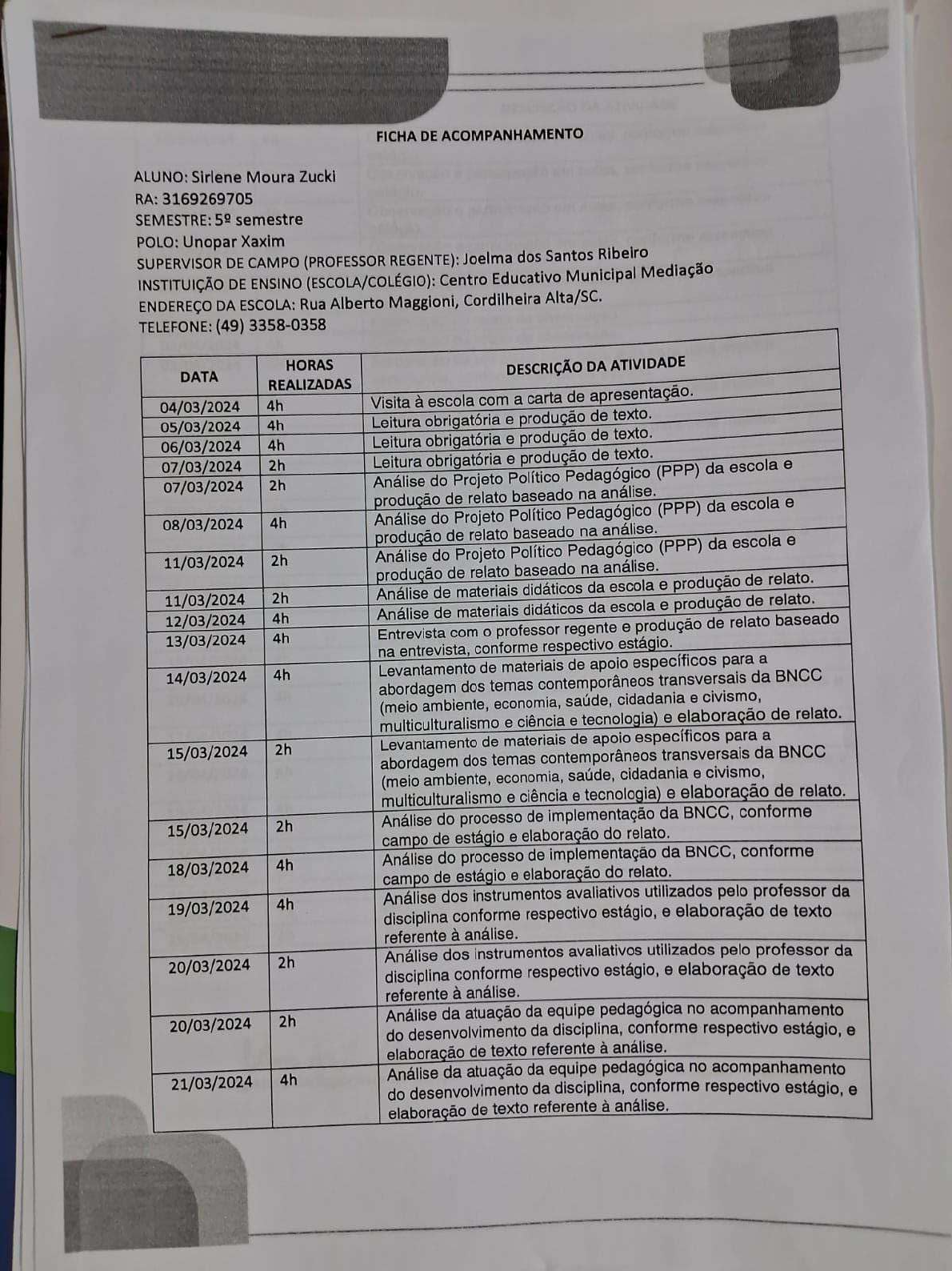 <p>FICHA DE ACOMPANHAMENTO ALUNO: Sirlene Moura Zucki RA: 3169269705 SEMESTRE: semestre POLO: Unopar Xaxim SUPERVISOR DE CAMPO (PROFESSOR REGENTE): Joelma dos Santos Ribeiro INSTITUIÇÃO DE ENSINO (ESCOLA/COLÉGIO): Centro Educativo Municipal Mediação ENDEREÇO DA ESCOLA: Rua Alberto Maggioni, Cordilheira Alta/SC. TELEFONE: (49) 3358-0358 HORAS DATA DESCRIÇÃO DA ATIVIDADE REALIZADAS 04/03/2024 4h Visita à escola com a carta de apresentação. 05/03/2024 4h Leitura obrigatória e produção de texto. 06/03/2024 4h Leitura obrigatória e produção de texto. 07/03/2024 2h Leitura obrigatória e produção de texto. 07/03/2024 2h Análise do Projeto Político Pedagógico (PPP) da escola e produção de relato baseado na análise. 08/03/2024 4h Análise do Projeto Político Pedagógico (PPP) da escola e produção de relato baseado na análise. 11/03/2024 2h Análise do Projeto Político Pedagógico (PPP) da escola e produção de relato baseado na análise. 11/03/2024 2h Análise de materiais didáticos da escola e produção de relato. 12/03/2024 4h Análise de materiais didáticos da escola e produção de relato. 13/03/2024 4h Entrevista com o professor regente e produção de relato baseado na entrevista, conforme respectivo estágio. 14/03/2024 4h Levantamento de materiais de apoio específicos para a abordagem dos temas contemporâneos transversais da BNCC (meio ambiente, economia, saúde, cidadania e civismo, multiculturalismo e ciência e tecnologia) e elaboração de relato. 15/03/2024 2h Levantamento de materiais de apoio específicos para a abordagem dos temas contemporâneos transversais da BNCC (meio ambiente, economia, saúde, cidadania e civismo, multiculturalismo e ciência e tecnologia) e elaboração de relato. 15/03/2024 2h Análise do processo de implementação da BNCC, conforme campo de estágio e elaboração do relato. 18/03/2024 4h Análise do processo de implementação da BNCC, conforme campo de estágio e elaboração do relato. 4h Análise dos instrumentos avaliativos utilizados pelo professor da 19/03/2024 disciplina conforme respectivo estágio, e elaboração de texto referente à análise. 2h Análise dos instrumentos avaliativos utilizados pelo professor da 20/03/2024 disciplina conforme respectivo estágio, e elaboração de texto referente à análise. 20/03/2024 2h Análise da atuação da equipe pedagógica no acompanhamento do desenvolvimento da disciplina, conforme respectivo estágio, e elaboração de texto referente à análise. 21/03/2024 4h Análise da atuação da equipe pedagógica no acompanhamento do desenvolvimento da disciplina, conforme respectivo estágio, e elaboração de texto referente à análise.</p><p>DATA HORAS REALIZADAS DESCRIÇÃO DA ATIVIDADE 22/03/2024 4h Observação e participação em aulas, conforme respectivo estágio. 25/03/2024 4h Observação e participação em aulas, conforme respectivo estágio. 26/03/2024 4h Observação e participação em aulas, conforme respectivo estágio. 27/03/2024 4h Observação e participação em aulas, conforme respectivo estágio. 28/03/2024 4h Observação e participação em aulas, conforme respectivo estágio. 01/04/2024 4h Elaboração do relato da observação. 02/04/2024 4h Elaboração do relato da observação. 03/04/2024 4h Elaboração de um plano para cada aula para uma mesma série/turma, conforme campo de estágio. 04/04/2024 4h Elaboração de um plano para cada aula para uma mesma série/turma, conforme campo de estágio. 05/04/2024 4h Elaboração de um plano para cada aula para uma mesma série/turma, conforme campo de estágio. 08/04/2024 4h Elaboração de um plano para cada aula para uma mesma série/turma, conforme campo de estágio. 09/04/2024 4h Apresentação dos planos de aula para o professor regente e elaboração do relato. 10/04/2024 2h Apresentação dos planos de aula para o professor regente e elaboração do relato. 11/04/2024 4h Regência (em uma das turmas em que realizou as observações e participações), conforme respectivo estágio. 12/04/2024 4h Regência (em uma das turmas em que realizou as observações e participações), conforme respectivo estágio. 15/04/2024 4h Regência (em uma das turmas em que realizou as observações e participações), conforme respectivo estágio. 16/04/2024 4h Regência (em uma das turmas em que realizou as observações e participações), conforme respectivo estágio. 17/04/2024 4h Regência (em uma das turmas em que realizou as observações e participações), conforme respectivo estágio. 18/04/2024 4h Regência (em uma das turmas em que realizou as observações e participações), conforme respectivo estágio. 19/04/2024 4h Relato da regência. 22/04/2024 4h Relato da regência. 23/04/2024 2h Relato da regência. 23/04/2024 2h Produção do Relatório de Estágio. 24/04/2024 4h Produção do Relatório de Estágio. 25/04/2024 2h Produção do Relatório de Estágio. 25/04/2024 2h Validação do Relatório do Estágio. UNOPAR (49) Assinatura do Supervisor de Campo Assinatura Polo de Apoio Presencial</p>