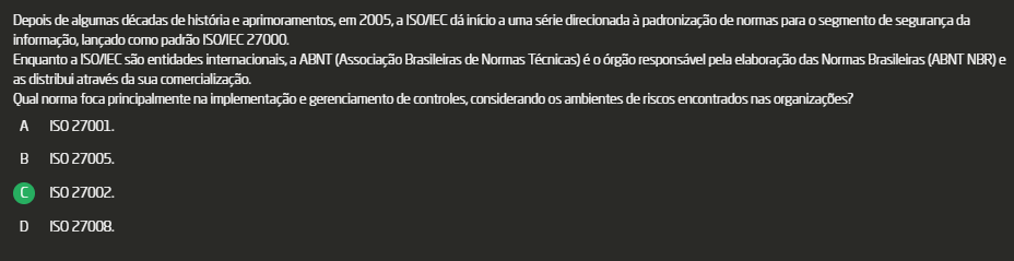 <p>Depois de algumas décadas de história e aprimoramentos, em 2005, a ISO/IEC dá início a uma série direcionada à padronização de normas para segmento de segurança da informação, lançado como padrão ISO/IEC 27000. Enquanto a ISO/IEC são entidades internacionais, a ABNT (Associação Brasileiras de Normas Técnicas) é órgão responsável pela elaboração das Normas Brasileiras (ABNT NBR) e as distribui através da sua comercialização. Qual norma foca principalmente na implementação e gerenciamento de controles, considerando os ambientes de riscos encontrados nas organizações? A ISO 27001. B ISO 27005. ISO 27002. D ISO 27008.</p>