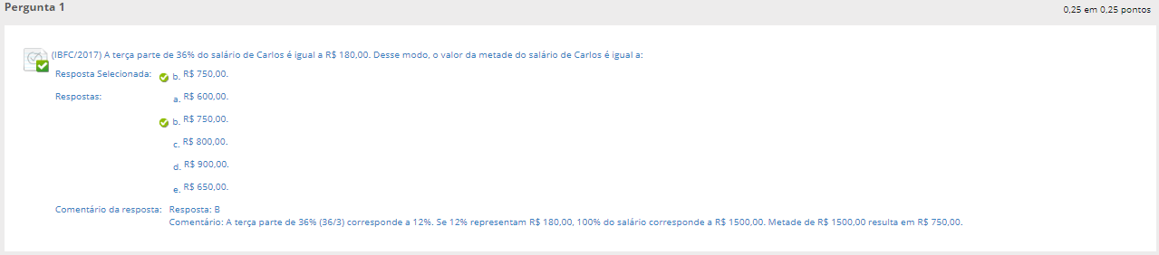<p>(IBFC/2017) A terça parte de 36% do salário de Carlos é igual a Desse modo, valor da metade do salário de Carlos é igual a: Resposta Selecionada: R$ Respostas: a. R$ 600.00 c. R$ d. e. Comentário da resposta: Resposta: B Comentário: A terça parte de 36% (36/3) corresponde a 12% Se 12% representam R$ 100% do salário corresponde a R$ Metade de R$ 1500.00 result</p>
