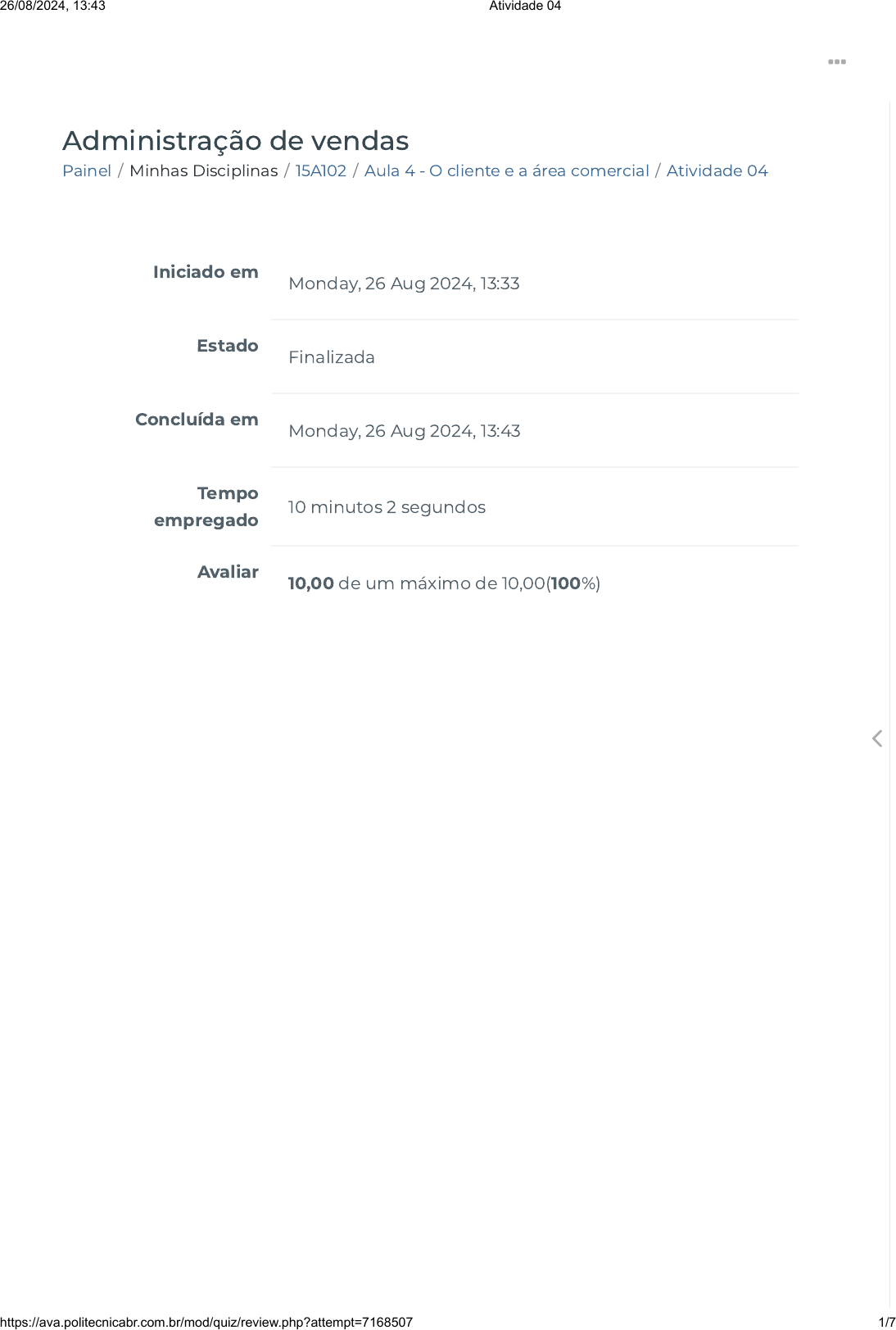 <p>Painel / Minhas Disciplinas / 15A102 / Aula 4 - O cliente e a área comercial / Atividade 04</p><p>Administração de vendas</p><p>Iniciado em</p><p>Monday, 26 Aug 2024, 13:33</p><p>Estado</p><p>Finalizada</p><p>Concluída em</p><p>Monday, 26 Aug 2024, 13:43</p><p>Tempo</p><p>empregado</p><p>10 minutos 2 segundos</p><p>Avaliar</p><p>10,00 de um máximo de 10,00(100%)</p><p></p><p></p><p>26/08/2024, 13:43 Atividade 04</p><p>https://ava.politecnicabr.com.br/mod/quiz/review.php?attempt=7168507 1/7</p><p>https://ava.politecnicabr.com.br/my/</p><p>https://ava.politecnicabr.com.br/my/</p><p>https://ava.politecnicabr.com.br/course/view.php?id=861</p><p>https://ava.politecnicabr.com.br/course/view.php?id=861#section-5</p><p>https://ava.politecnicabr.com.br/mod/quiz/view.php?id=22904</p><p>https://ava.politecnicabr.com.br/</p><p>Questão 1</p><p>Correto</p><p>Atingiu 1,00 de 1,00</p><p>Segundo Engel, Blackwell e Miniard (2000), o consumidor �nal que</p><p>pode ser pessoa física ou jurídica, pode passar por cinco etapas na</p><p>compra de um produto ou serviço. Quais das alternativas abaixo</p><p>não faz parte destas etapas?</p><p>Escolha uma opção:</p><p>Questão 2</p><p>Correto</p><p>Atingiu 1,00 de 1,00</p><p>É correto a�rmar que uma das etapas de compra é o</p><p>“reconhecimento do problema”, que consiste na percepção da</p><p>necessidade em relação a determinado produto ou serviço.</p><p>Escolha uma opção:</p><p>a. Comportamento pós-compra.</p><p>b. Avaliação de alternativas.</p><p>c. Busca de informações.</p><p>d. Veri�cação do produto/serviço. </p><p>e. Decisão de compras.</p><p>Verdadeiro </p><p>Falso</p><p></p><p></p><p>26/08/2024, 13:43 Atividade 04</p><p>https://ava.politecnicabr.com.br/mod/quiz/review.php?attempt=7168507 2/7</p><p>https://ava.politecnicabr.com.br/</p><p>Questão 3</p><p>Correto</p><p>Atingiu 1,00 de 1,00</p><p>Compra pro�ssional ocorre em organizações é desempenhado</p><p>principalmente por pro�ssionais treinados para trabalhar nas</p><p>atividades de compra e de consumo, é mais racional do que o</p><p>processo de decisão individual e familiar.</p><p>Escolha uma opção:</p><p>Questão 4</p><p>Correto</p><p>Atingiu 1,00 de 1,00</p><p>Moreira (2000) apresentam algumas situações de compra</p><p>organizacional que são:</p><p>Escolha uma opção:</p><p>Verdadeiro </p><p>Falso</p><p>a. recompra indireta, recompra modi�cada, e compra velha</p><p>b. recompra direta, recompra modi�cada, e compra nova </p><p>c. recompra direta, recompra nova, e compra velha</p><p>d. recompra velha, recompra modi�cada, e compra nova</p><p></p><p></p><p>26/08/2024, 13:43 Atividade 04</p><p>https://ava.politecnicabr.com.br/mod/quiz/review.php?attempt=7168507 3/7</p><p>https://ava.politecnicabr.com.br/</p><p>Questão 5</p><p>Correto</p><p>Atingiu 1,00 de 1,00</p><p>A recompra direta necessita de uma busca intensa de informações</p><p>e um processo de decisão mais cuidadoso e demorado (não</p><p>rotineiro).</p><p>Escolha uma opção:</p><p>Questão 6</p><p>Correto</p><p>Atingiu 1,00 de 1,00</p><p>O marketing de relacionamento de�nido como um processo de</p><p>engajamento que estabelece, desenvolve e mantém</p><p>relacionamentos cooperativos a longo prazo mutuamente</p><p>bené�cos entre a empresa e seus públicos, principalmente</p><p>clientes.</p><p>Escolha uma opção:</p><p>Verdadeiro</p><p>Falso </p><p>Verdadeiro </p><p>Falso</p><p></p><p></p><p>26/08/2024, 13:43 Atividade 04</p><p>https://ava.politecnicabr.com.br/mod/quiz/review.php?attempt=7168507 4/7</p><p>https://ava.politecnicabr.com.br/</p><p>Questão 7</p><p>Correto</p><p>Atingiu 1,50 de 1,50</p><p>Para se obter durabilidade dos relacionamentos através de</p><p>compromissos mútuos, de demonstrações de con�ança mútua e</p><p>de compreensão recíproca, Hunt, Arnett eMadhavaram (2006)</p><p>estabelecem algumas estratégias baseadas em relacionamentos.</p><p>Das opções abaixo marque o fator que não faz parte destas</p><p>estratégias.</p><p>Escolha uma opção:</p><p>a. Fatores relacionais</p><p>b. Fatores relativos às políticas públicas e legislação</p><p>c. Fatores geográ�cos </p><p>d. Fatores relacionados às ofertas do mercado</p><p>e. Fatores relacionados ao uso de recursos das partes </p><p></p><p>26/08/2024, 13:43 Atividade 04</p><p>https://ava.politecnicabr.com.br/mod/quiz/review.php?attempt=7168507 5/7</p><p>https://ava.politecnicabr.com.br/</p><p>Questão 8</p><p>Correto</p><p>Atingiu 1,00 de 1,00</p><p>Em relação aos fatores relacionados às ofertas do mercado,</p><p>podemos a�rmar que consistem em qualidade, inovação,</p><p>customização das ofertas, valor da marca, valor do cliente e valor</p><p>para o cliente.</p><p>Escolha uma opção:</p><p>Questão 9</p><p>Correto</p><p>Atingiu 1,50 de 1,50</p><p>Qual das alternativas não faz parte dos direitos básicos do</p><p>consumidor?</p><p>Escolha uma opção:</p><p>Verdadeiro </p><p>Falso</p><p>a. Proteção da vida e da saúde</p><p>b. Proteção contra insatisfação </p><p>c. Educação para o consumo</p><p>d. Liberdade de escolha de produtos e serviços</p><p>e. Informação</p><p></p><p></p><p>26/08/2024, 13:43 Atividade 04</p><p>https://ava.politecnicabr.com.br/mod/quiz/review.php?attempt=7168507 6/7</p><p>https://ava.politecnicabr.com.br/</p><p>© 2022 - Escola Politécnica Brasileira</p><p>Entre em Contato</p><p>https://www.politecnicabr.com.br</p><p>0800 084 2627</p><p>0800 084 2627</p><p></p><p></p><p></p><p></p><p>Links Úteis</p><p>Dicas da nossa Diretora Acadêmica</p><p>Planner de Estudos</p><p>Declaração de Matrícula</p><p>Orientações do AVA</p><p>Abertura de Ticket</p><p>Fale com o Tutor</p><p>Cronograma de Estudos</p><p>Manual de Estágio</p><p>Manual de Competência</p><p>Siga-nos nas redes sociais</p><p> </p><p></p><p></p><p>26/08/2024, 13:43 Atividade 04</p><p>https://ava.politecnicabr.com.br/mod/quiz/review.php?attempt=7168507 7/7</p><p>https://ava.politecnicabr.com.br