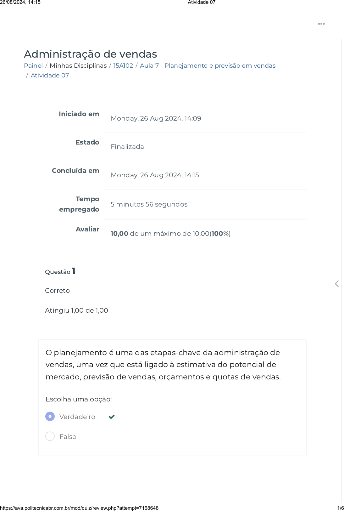 <p>Painel / Minhas Disciplinas / 15A102 / Aula 7 - Planejamento e previsão em vendas</p><p>/ Atividade 07</p><p>Administração de vendas</p><p>Iniciado em</p><p>Monday, 26 Aug 2024, 14:09</p><p>Estado</p><p>Finalizada</p><p>Concluída em</p><p>Monday, 26 Aug 2024, 14:15</p><p>Tempo</p><p>empregado</p><p>5 minutos 56 segundos</p><p>Avaliar</p><p>10,00 de um máximo de 10,00(100%)</p><p>Questão 1</p><p>Correto</p><p>Atingiu 1,00 de 1,00</p><p>O planejamento é uma das etapas-chave da administração de</p><p>vendas, uma vez que está ligado à estimativa do potencial de</p><p>mercado, previsão de vendas, orçamentos e quotas de vendas.</p><p>Escolha uma opção:</p><p>Verdadeiro </p><p>Falso</p><p></p><p></p><p>26/08/2024, 14:15 Atividade 07</p><p>https://ava.politecnicabr.com.br/mod/quiz/review.php?attempt=7168648 1/6</p><p>https://ava.politecnicabr.com.br/my/</p><p>https://ava.politecnicabr.com.br/my/</p><p>https://ava.politecnicabr.com.br/course/view.php?id=861</p><p>https://ava.politecnicabr.com.br/course/view.php?id=861#section-8</p><p>https://ava.politecnicabr.com.br/mod/quiz/view.php?id=22913</p><p>https://ava.politecnicabr.com.br/</p><p>Questão 2</p><p>Correto</p><p>Atingiu 1,50 de 1,50</p><p>Qual das alternativas abaixo não faz parte das bases do processo</p><p>de planejamento de venda?</p><p>Escolha uma opção:</p><p>Questão 3</p><p>Correto</p><p>Atingiu 1,00 de 1,00</p><p>Podemos a�rmar que A avaliação das oportunidades de mercado</p><p>deve considerar a missão da empresa.</p><p>Escolha uma opção:</p><p>a. Segmentação de mercado.</p><p>b. Previsão do pós-venda. </p><p>c. Estimativa do potencial de mercado.</p><p>d. Distribuição e logística.</p><p>e. Avaliação das oportunidades de mercado.</p><p>Verdadeiro </p><p>Falso</p><p></p><p></p><p>26/08/2024, 14:15 Atividade 07</p><p>https://ava.politecnicabr.com.br/mod/quiz/review.php?attempt=7168648 2/6</p><p>https://ava.politecnicabr.com.br/</p><p>Questão 4</p><p>Correto</p><p>Atingiu 1,00 de 1,00</p><p>A distribuição e logística não são responsáveis pelo escoamento</p><p>mais adequado do produto ou serviço.</p><p>Escolha uma opção:</p><p>Questão 5</p><p>Correto</p><p>Atingiu 1,50 de 1,50</p><p>Documento que identi�ca o mercado-alvo, que determina os</p><p>objetivos de vendas (de toda a empresa e de cada pro�ssional de</p><p>vendas), detalha ações, orçamentos e sequência de atividades</p><p>necessárias para atingir esses objetivos. Esta a�rmativas refere-se</p><p>a:</p><p>Escolha uma opção:</p><p>Verdadeiro</p><p>Falso </p><p>a. Orçamento</p><p>b. Plano de vendas </p><p>c. Planejamento de Compras</p><p>d. Documento pós-venda</p><p></p><p></p><p>26/08/2024, 14:15 Atividade 07</p><p>https://ava.politecnicabr.com.br/mod/quiz/review.php?attempt=7168648 3/6</p><p>https://ava.politecnicabr.com.br/</p><p>Questão 6</p><p>Correto</p><p>Atingiu 1,00 de 1,00</p><p>A atividade principal da área de vendas é efetuar as transações</p><p>comerciais com os clientes da empresa.</p><p>Escolha uma opção:</p><p>Questão 7</p><p>Correto</p><p>Atingiu 1,00 de 1,00</p><p>Projeção numérica das expectativas da organização retratada num</p><p>determinado momento pelas opiniões e análises de seus</p><p>pro�ssionais do que poderá acontecer no futuro dentro do mercado-alvo de</p><p>atuação. Esta a�rmativa se trata da:</p><p>Escolha uma opção:</p><p>Verdadeiro </p><p>Falso</p><p>a. Previsão de vendas </p><p>b. Previsão de serviço</p><p>c. Previsão do Orçamento</p><p>d. Previsão da pré-venda</p><p></p><p></p><p>26/08/2024, 14:15 Atividade 07</p><p>https://ava.politecnicabr.com.br/mod/quiz/review.php?attempt=7168648 4/6</p><p>https://ava.politecnicabr.com.br/</p><p>Questão 8</p><p>Correto</p><p>Atingiu 1,00 de 1,00</p><p>Instabilidade econômica que afeta a capacidade de previsões por</p><p>não se saber bem o que pode ocorrer, é uma das di�culdades</p><p>relacionadas a previsão de vendas.</p><p>Escolha uma opção:</p><p>Questão 9</p><p>Correto</p><p>Atingiu 1,00 de 1,00</p><p>Em relação aos métodos de previsão de vendas, segundo Moreira</p><p>(2000), Stanton e Spiro (2000) e Futrell (2003), esses podem ser</p><p>classi�cados em três tipos. Qual das alternativas não corresponde a</p><p>estes tipos de métodos?</p><p>Escolha uma opção:</p><p>Verdadeiro </p><p>Falso</p><p>a. Métodos matemáticos.</p><p>b. Métodos operacionais.</p><p>c. Métodos tecnológicos. </p><p>d. Métodos de pesquisa.</p><p></p><p></p><p>26/08/2024, 14:15 Atividade 07</p><p>https://ava.politecnicabr.com.br/mod/quiz/review.php?attempt=7168648 5/6</p><p>https://ava.politecnicabr.com.br/</p><p>© 2022 - Escola Politécnica Brasileira</p><p>Entre em Contato</p><p>https://www.politecnicabr.com.br</p><p>0800 084 2627</p><p>0800 084 2627</p><p></p><p></p><p></p><p></p><p>Links Úteis</p><p>Dicas da nossa Diretora Acadêmica</p><p>Planner de Estudos</p><p>Declaração de Matrícula</p><p>Orientações do AVA</p><p>Abertura de Ticket</p><p>Fale com o Tutor</p><p>Cronograma de Estudos</p><p>Manual de Estágio</p><p>Manual de Competência</p><p>Siga-nos nas redes sociais</p><p> </p><p></p><p></p><p>26/08/2024, 14:15 Atividade 07</p><p>https://ava.politecnicabr.com.br/mod/quiz/review.php?attempt=7168648 6/6</p><p>https://ava.politecnicabr.com.br/mod/quiz/0</p><p>https://ava.politecnicabr.com.br/mod/quiz/0</p><p>https://www.politecnicabr.com.br/</p><p>https://soundcloud.com/user-501638417/sets/escola-politecnica-brasileira</p><p>https://soundcloud.com/user-501638417/sets/escola-politecnica-brasileira</p><p>https://storage.googleapis.com/sirius-pubstore/semestre_plannerdeestudo%20poli.pdf</p><p>https://storage.googleapis.com/sirius-pubstore/semestre_plannerdeestudo%20poli.pdf</p><p>https://storage.googleapis.com/sirius-pubstore/declaracao_matricula.pdf</p><p>https://storage.googleapis.com/sirius-pubstore/declaracao_matricula.pdf</p><p>https://storage.googleapis.com/sirius-pubstore/orientacoes_ava.pdf</p><p>https: