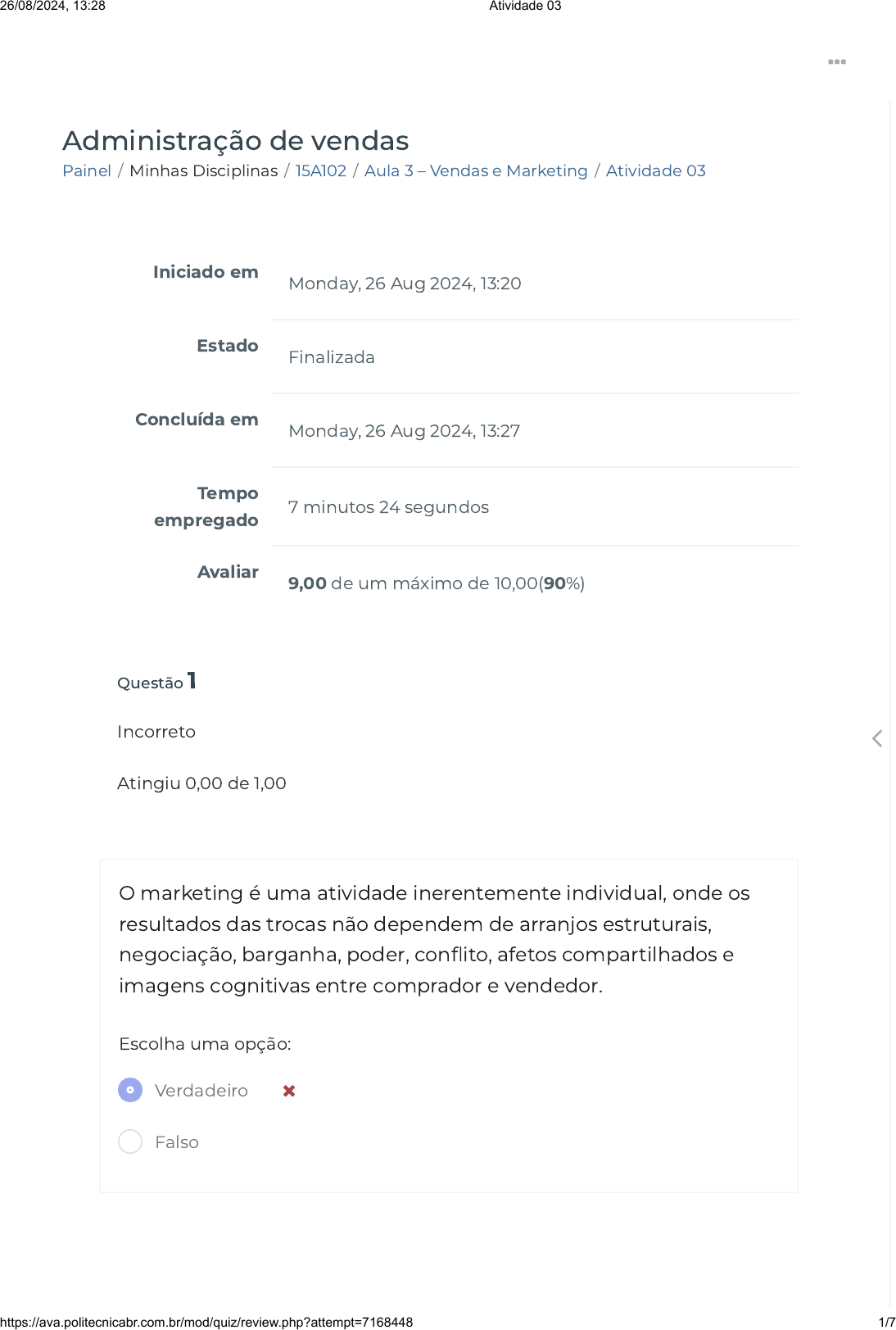<p>Painel / Minhas Disciplinas / 15A102 / Aula 3 – Vendas e Marketing / Atividade 03</p><p>Administração de vendas</p><p>Iniciado em</p><p>Monday, 26 Aug 2024, 13:20</p><p>Estado</p><p>Finalizada</p><p>Concluída em</p><p>Monday, 26 Aug 2024, 13:27</p><p>Tempo</p><p>empregado</p><p>7 minutos 24 segundos</p><p>Avaliar</p><p>9,00 de um máximo de 10,00(90%)</p><p>Questão 1</p><p>Incorreto</p><p>Atingiu 0,00 de 1,00</p><p>O marketing é uma atividade inerentemente individual, onde os</p><p>resultados das trocas não dependem de arranjos estruturais,</p><p>negociação, barganha, poder, con�ito, afetos compartilhados e</p><p>imagens cognitivas entre comprador e vendedor.</p><p>Escolha uma opção:</p><p>Verdadeiro </p><p>Falso</p><p></p><p></p><p>26/08/2024, 13:28 Atividade 03</p><p>https://ava.politecnicabr.com.br/mod/quiz/review.php?attempt=7168448 1/7</p><p>https://ava.politecnicabr.com.br/my/</p><p>https://ava.politecnicabr.com.br/my/</p><p>https://ava.politecnicabr.com.br/course/view.php?id=861</p><p>https://ava.politecnicabr.com.br/course/view.php?id=861#section-4</p><p>https://ava.politecnicabr.com.br/mod/quiz/view.php?id=22901</p><p>https://ava.politecnicabr.com.br/</p><p>Questão 2</p><p>Correto</p><p>Atingiu 1,00 de 1,00</p><p>O que é marketing na de�nição de AMA (2008)?</p><p>Escolha uma opção:</p><p>a. Marketing é a atividade de persuadir, iludir, entregar e trocar</p><p>ofertas que tenham valor para clientes, parceiros e a sociedade</p><p>em geral.</p><p>b. Marketing é uma importante atividade, cujos os processos</p><p>principais são criar e trocar ofertas com o objetivo de tornar a</p><p>venda em segundo plano.</p><p>c. Marketing é a atividade, conjunto de instituições e processos</p><p>para criar, comunicar, entregar e trocar ofertas que tenham valor</p><p>para clientes, parceiros e a sociedade em geral.</p><p></p><p>d. Marketing é a atividade especializada no processos de</p><p>entender o mercado para criar falsas ofertas. </p><p></p><p>26/08/2024, 13:28 Atividade 03</p><p>https://ava.politecnicabr.com.br/mod/quiz/review.php?attempt=7168448 2/7</p><p>https://ava.politecnicabr.com.br/</p><p>Questão 3</p><p>Correto</p><p>Atingiu 1,00 de 1,00</p><p>O planejamento de marketing, segundo Kotler e Keller (2006),</p><p>envolve a análise das oportunidades e ameaças do ambiente,</p><p>assim como as capacidades organizacionais, em que se</p><p>pesquisam, de�nem-se os mercados e se delineiam estratégias,</p><p>através de planos de segmentação e posicionamento.</p><p>Escolha uma opção:</p><p>Questão 4</p><p>Correto</p><p>Atingiu 1,50 de 1,50</p><p>O que representa a segmentação de mercado?</p><p>Escolha uma opção:</p><p>Verdadeiro </p><p>Falso</p><p>a. Atividades de ligação</p><p>b. Uma grande área de marketing.</p><p>c. Um esforço para o aumento de precisão de alvo de uma</p><p>empresa.</p><p></p><p>d. Representa uma organização empresarial.</p><p></p><p></p><p>26/08/2024, 13:28 Atividade 03</p><p>https://ava.politecnicabr.com.br/mod/quiz/review.php?attempt=7168448 3/7</p><p>https://ava.politecnicabr.com.br/</p><p>Questão 5</p><p>Correto</p><p>Atingiu 1,00 de 1,00</p><p>O que se deve fazer para segmentar o mercado?</p><p>I - Avalia que critérios serão utilizados para dividir os mercados em</p><p>segmentos.</p><p>II - De�nir a sua atratividade.</p><p>III - Avaliar o campo mercadológico.</p><p>Escolha uma opção:</p><p>a. Somente a III está correta</p><p>b. Nenhumas das a�rmativas estão corretas.</p><p>c. As a�rmativas I e III estão corretas</p><p>d. As a�rmativas I e II estão corretas </p><p></p><p></p><p>26/08/2024, 13:28 Atividade 03</p><p>https://ava.politecnicabr.com.br/mod/quiz/review.php?attempt=7168448 4/7</p><p>https://ava.politecnicabr.com.br/</p><p>Questão 6</p><p>Correto</p><p>Atingiu 1,50 de 1,50</p><p>O que signi�ca a expressão SIM?</p><p>Escolha uma opção:</p><p>Questão 7</p><p>Correto</p><p>Atingiu 1,00 de 1,00</p><p>Quais das alternativas abaixo não faz parte de uma função do SIM?</p><p>Escolha uma opção:</p><p>a. Sistema de Informações de Marketing </p><p>b. Sistema de Inovação de Marketing</p><p>c. Sistema de Interação Mercadológica</p><p>d. Sistema de Intercessão e Mídia</p><p>a. Totalidade </p><p>b. Análise</p><p>c. Processamento</p><p>d. Armazenagem e recuperação</p><p>e. Levantamento</p><p></p><p></p><p>26/08/2024, 13:28 Atividade 03</p><p>https://ava.politecnicabr.com.br/mod/quiz/review.php?attempt=7168448 5/7</p><p>https://ava.politecnicabr.com.br/</p><p>Questão 8</p><p>Correto</p><p>Atingiu 1,00 de 1,00</p><p>Podemos a�rmar que um dos 4 subsistemas do SIM é o</p><p>Subsistema de registros internos que consiste nos dados que a</p><p>empresa possui disponíveis a partir de suas atividades, como</p><p>relatórios sobre pedidos, vendas, preços, níveis de estoque, contas</p><p>a receber, contas a pagar, entre outros. São informações sobre</p><p>resultados da empresa.</p><p>Escolha uma opção:</p><p>Questão 9</p><p>Correto</p><p>Atingiu 1,00 de 1,00</p><p>O composto de marketing, segundo Churchill Jr. e Peter (2000), é a</p><p>combinação de ações e ferramentas estratégicas usadas para criar</p><p>valor para os clientes e alcançar os objetivos da organização.</p><p>Escolha uma opção:</p><p>Verdadeiro </p><p>Falso</p><p>Verdadeiro </p><p>Falso</p><p></p><p></p><p>26/08/2024, 13:28 Atividade 03</p><p>https://ava.politecnicabr.com.br/mod/quiz/review.php?attempt=7168448 6/7</p><p>https://ava.politecnicabr.com.br/</p><p>© 2022 - Escola Politécnica Brasileira</p><p>Entre em Contato</p><p>https://www.politecnicabr.com.br</p><p>0800 084 2627</p><p>0800 084 2627</p><p></p><p></p><p></p><p></p><p>Links Úteis</p><p>Dicas da nossa Diretora Acadêmica</p><p>Planner de Estudos</p><p>Declaração de Matrícula</p><p>Orientações do AVA</p><p>Abertura de Ticket</p><p>Fale com o Tutor</p><p>Cronograma de Estudos</p><p>Manual de Estágio</p><p>Manual de Competência</p><p>Siga-no