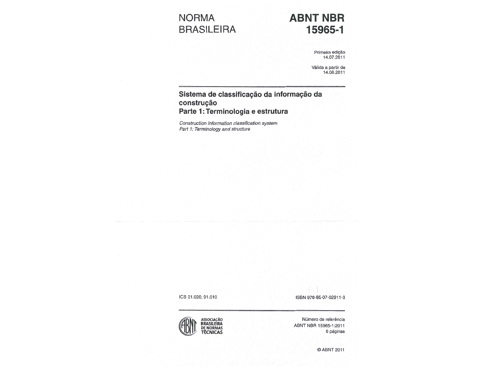 <p>NORMA ABNT NBR BRASILEIRA 15965-1 Primeira edição 14.07.2011 Válida a partir de 14.08.2011 Sistema de classificação da informação da construção Parte 1: Terminologia e estrutura Construction information classification system Part 1: Terminology and structure ICS 01.020; 91.010 ISBN 978-85-07-02911-3 ASSOCIAÇÃO Número de referência BRASILEIRA ABNT NBR 15965-1:2011 DE NORMAS TÉCNICAS 6 páginas ABNT 2011</p><p>ABNT NBR 15965-1:2011 Sumário Página Prefácio iv Introdução V 1 Escopo 1 2 Referência normativa 1 3 Termos e definições 1 4 Objetivos do sistema de classificação 3 5 Princípios do sistema de classificação - Metodologia 3 6 Estrutura do sistema de classificação 5 Tabelas Tabela 1 - Estrutura de classes 5 Tabela 2 - Estrutura de identificadores 6 Tabela 3 - Exemplo de proposta de classificação 6 ABNT 2011 Todos os direitos reservados iii</p><p>ABNT NBR 15965-1:2011 Introdução Esta Norma tem por objetivo estabelecer a terminologia e estrutura de classificação para a tecnologia de modelagem da informação da construção em plena adoção pela indústria brasileira de Arquitetura, Engenharia e Construção (AEC). Esse instrumento serve para nortear métodos de avaliação, escopos de trabalho, padrões técnicos e outros parâmetros que envolvam a modelagem da informação da construção. ABNT 2011 Todos os direitos reservados V</p><p>NORMA BRASILEIRA ABNT NBR 15965-1:2011 Sistema de classificação da informação da construção Parte 1: Terminologia e estrutura 1 Escopo 1.1 Esta Norma define a terminologia, os princípios do sistema de classificação e os grupos de classificação para o planejamento, projeto, gerenciamento, obra, operação e manutenção de empre- endimentos da construção civil. 1.2 Esta Norma aplica-se à elaboração de outras normas que porventura venham a reger e aplicar conceitos pertinentes à Modelagem da Informação da Construção. 1.3 Esta Norma apresenta uma proposta de sistema de classificação que indica tabelas que, seguin- do um padrão de referência de classes e princípios de especialização, ordenam e operacionalizam o referido sistema. 2 Referência normativa documento relacionado a seguir é indispensável à aplicação deste documento. Para referências datadas, aplicam-se somente as edições citadas. Para referências não datadas, aplicam-se as edições mais recentes do referido documento (incluindo emendas). ABNT NBR ISO 12006-2, Construção de edificação Organização de informação da construção Parte 2: Estrutura para classificação de informação 3 Termos e definições Para os efeitos deste documento, aplicam-se os seguintes termos e definições. 3.1 objeto da construção objeto relevante para a indústria da construção (ver ABNT NBR ISO 12006-2) 3.2 processo da construção processo que transforma recursos da construção em resultados da construção (ver ABNT NBR ISO 12006-2) 3.3 recurso da construção objeto da construção usado em um processo da construção para a obtenção de um resultado da cons- trução (ver ABNT NBR ISO 12006-2) 3.4 resultado da construção objeto da construção que é formado ou tem seu estado modificado como resultado de um ou mais processos da construção que utilizem um ou mais recursos da construção (ver ABNT NBR ISO 12006-2) ABNT 2011 Todos os direitos reservados 1</p><p>ABNT NBR 15965-1:2011 3.16 resultado de serviço de construção resultado da construção obtido na etapa de produção ou através de processos subsequentes de alte- ração, manutenção ou demolição (ver ABNT NBR ISO 12006-2) 3.17 unidade de construção resultado da construção, material e independente, de escala significativa, servindo a pelo menos uma atividade ou função do usuário (ver ABNT NBR ISO 12006-2) 3.18 espaço resultado da construção, material e tridimensional, contido em, ou associado a, edifício ou outra uni- dade de construção (ver ABNT NBR ISO 12006-2) 4 Objetivos do sistema de classificação A tecnologia de Modelagem da Informação da Construção necessita de um sistema normalizado de classificação que possa embasar os projetos de empreendimentos na indústria brasileira de Arquite- tura, Engenharia e Construção (AEC), sob os seguintes aspectos: a) terminologias e parâmetros unificados e aplicados por todos os envolvidos na indústria da cons- trução civil; b) ampliação da cooperação e comunicação entre os agentes da cadeia produtiva da construção civil, sob aspectos padronizados; c) facilitação da interoperabilidade entre os diversos sistemas de dados utilizados pela indústria da construção civil; d) aumento da produtividade e qualidade e serviços listados pelo novo sistema; e) maior facilidade na gestão e operação da logística da construção. 5 Princípios do sistema de classificação - Metodologia A partir da análise dos sistemas de classificação adotados internacionalmente e considerando os regionalismos e peculiaridades da indústria de construção em todo o território brasileiro, tomou-se como base a ABNT NBR ISO 12006-2 para dar o suporte teórico à nova norma referente aos sistemas de classificação que suportam a tecnologia da modelagem da informação da construção. A partir de um esquema organizacional publicado na ABNT NBR ISO 12006-2, que apresenta as seis grandes classes da construção (espaços, resultados, processos, recursos, propriedades/características e informações) e as relações gerais entre elas (ver Figura 2 da ABNT NBR ISO 12006-2:2010), como participantes do ciclo de vida de um empreendimento, elaborou-se um quadro de classes que agrupa, em cada grande grupo identificado, os princípios de especialização constantes para cada um desses grupos. ABNT 2011 Todos os direitos reservados 3</p><p>ABNT NBR 15965-1:2011 Tabela 1 - Estrutura de classes Identificador Tema Assunto Identificador Classificação de grupo do assunto Materiais M OM 0 Características dos objetos Pr