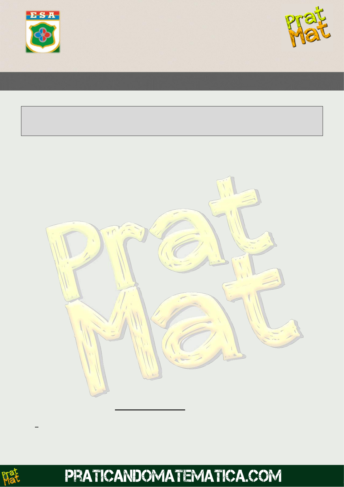 <p>ESCOLA DE SARGENTO DAS ARMAS</p><p>Simulado</p><p>ESA</p><p>MATEMÁTICA</p><p>14 – Questões – valor de 0,000 (zero) a 10,000 (dez)</p><p>01. (Mackenzie) O conjunto das letras da palavra MACK tem um número de sub-</p><p>conjuntos igual a</p><p>A) 0</p><p>B) 2</p><p>C) 4</p><p>D) 8</p><p>E) 16</p><p>02. (Puccamp Direito) Em um restaurante, o cliente deve montar seu prato esco-</p><p>lhendo um tipo de grelhado, entre carne, frango ou peixe, e dois ingredientes de</p><p>salada, entre alface, tomate, pepino e cenoura. A sobremesa também compõe o</p><p>prato e é sempre uma salada de frutas, exceto se o cliente escolher alface entre</p><p>os ingredientes de salada. Nesse caso, para a sobremesa, ele pode escolher entre</p><p>salada de frutas ou sorvete. O número de diferentes pratos que podem ser monta-</p><p>dos é:</p><p>A) 27</p><p>B) 24</p><p>C) 21</p><p>D) 18</p><p>E) 30</p><p>03. (Efomm) O valor de</p><p>𝑠𝑒𝑐2(5)+𝑐𝑜𝑠𝑠𝑒𝑐2(5)</p><p>𝑐𝑜𝑠𝑠𝑒𝑐2(10)</p><p>é igual a:</p><p>A)</p><p>1</p><p>2</p><p>B) 1</p><p>C) 2</p><p>Prof: Lucas Moura - lucasgondemoura@gmail.com - IP: 189.25.46.14Licenciado para: Pedro Jackson de Sousa Alves Junior | adgineruiva@gmail.com | 07646036390 | Protegido por AlpaClass.com #7cVazpt9JN</p><p>D)</p><p>5</p><p>2</p><p>E) 4</p><p>04. (Unicamp indígenas) A função quadrática 𝑓(𝑥) = 𝑎𝑥2 + 𝑏𝑥 + 𝑐 tem seu grá-</p><p>fico representado abaixo. Considerando o gráfico e sabendo que 𝛥 = 𝑏2 − 4𝑎𝑐, é</p><p>verdadeiro afirmar que.</p><p>A) 𝛥 > 0 e 𝑎 < 0.</p><p>B) 𝛥 < 0 e 𝑎 > 0.</p><p>C) 𝛥 > 0 e 𝑎 > 0.</p><p>D) 𝛥 < 0 e 𝑎 < 0.</p><p>E) 𝛥 < 0 e 𝑎 = 0.</p><p>05. (Uemg) Seja 𝑝(𝑥) um polinômio do 2º grau, satisfazendo as seguintes condi-</p><p>ções:</p><p>• −1 e 4 são raízes de 𝑝(𝑥).</p><p>• 𝑝(5) = −12.</p><p>O maior valor de 𝑥 para o qual 𝑝(𝑥) = 8 é</p><p>A) 0.</p><p>B) 3.</p><p>C) 6.</p><p>D) 12.</p><p>E) 13.</p><p>06. (Uea) As circunferências de raios R e r, medidos em cm, são concêntricas e a</p><p>coroa circular determinada por elas tem área de 80𝜋𝑐𝑚2, como mostra a figura:</p><p>Sabendo que a soma das medidas de R e r é igual a 20 cm, conclui-se que o raio</p><p>maior excede o menor em</p><p>a) 2 cm.</p><p>b) 3 cm.</p><p>c) 5 cm.</p><p>d) 4 cm.</p><p>e) 1 cm.</p><p>Prof: Lucas Moura - lucasgondemoura@gmail.com - IP: 189.25.46.14Licenciado para: Pedro Jackson de Sousa Alves Junior | adgineruiva@gmail.com | 07646036390 | Protegido por AlpaClass.com #7cVazpt9JN</p><p>07. (Fmj) Em um triângulo retângulo JKL, o ponto M é médio do lado JL e é a</p><p>extremidade do setor circular MN de uma circunferência de centro L, conforme</p><p>mostra a figura.</p><p>Sabendo que K, L e N são colineares, a área do setor circular MN é</p><p>a) 12𝜋𝑐𝑚2.</p><p>b) 9𝜋𝑐𝑚2.</p><p>c) 6𝜋𝑐𝑚2.</p><p>d) 3𝜋𝑐𝑚2.</p><p>e) 15𝜋𝑐𝑚2.</p><p>08. (Uece) Se a e b são números reais positivos, 𝑎 ≠ 1, 𝑏 ≠ 1 e se 4 ⋅ 𝑙𝑜𝑔𝑢 𝑏 + 2 ⋅</p><p>𝑙𝑜𝑔𝑣 𝑏</p><p>2 = 18, onde 𝑢 =𝑎</p><p>2</p><p>3 e 𝑣 = 𝑎2, então, o valor de 𝑙𝑜𝑔𝑎 𝑏 é igual a</p><p>A)</p><p>9</p><p>4</p><p>.</p><p>B)</p><p>3</p><p>6</p><p>.</p><p>C)</p><p>7</p><p>4</p><p>.</p><p>D)</p><p>7</p><p>6</p><p>.</p><p>E)</p><p>5</p><p>6</p><p>.</p><p>09. (Uea) Considere as equações I, II e III.</p><p>I. 𝑥 + 𝑦 + 3 = 0</p><p>II. 𝑥2 + 2𝑦 + 2 = 0</p><p>III. 𝑥2 + 𝑦2 − 5 = 0</p><p>No plano cartesiano, as representações gráficas das equações I, II e III correspon-</p><p>dem, respectivamente, a</p><p>A) circunferência, parábola e reta.</p><p>B) parábola, reta e circunferência.</p><p>C) reta, circunferência e parábola.</p><p>D) circunferência, reta e parábola.</p><p>E) reta, parábola e circunferência.</p><p>10. (Fmj) Em um hexágono regular foram traçadas duas diagonais e um segmento</p><p>de reta, cujas extremidades são um ponto sobre um dos lados e um ponto sobre</p><p>uma das diagonais traçadas, conforme mostra a figura.</p><p>Prof: Lucas Moura - lucasgondemoura@gmail.com - IP: 189.25.46.14Licenciado para: Pedro Jackson de Sousa Alves Junior | adgineruiva@gmail.com | 07646036390 | Protegido por AlpaClass.com #7cVazpt9JN</p><p>O valor de 𝛼 + 𝛽 é igual a</p><p>a) 230°</p><p>b) 220°</p><p>c) 235°</p><p>d) 225°</p><p>e) 215°</p><p>11. (Albert Einstein - Medicina) O sistema de equações {</p><p>(𝑚 − 1)𝑥 − 3𝑦 = 2</p><p>2𝑥 + 5𝑦 = −1</p><p>, com</p><p>m sendo um número real, tem um par de retas paralelas distintas como represen-</p><p>tação gráfica no sistema cartesiano de eixos ortogonais OXY quando m é igual a</p><p>A) −</p><p>1</p><p>2</p><p>B) −</p><p>2</p><p>5</p><p>C) −</p><p>3</p><p>5</p><p>D) −</p><p>1</p><p>5</p><p>E) −</p><p>4</p><p>5</p><p>12. (Fmj) Um grupo de 8 turistas é formado por 4 homens e 4 mulheres. Sorteando-</p><p>se 3 pessoas desse grupo, a probabilidade de exatamente um homem ser sorteado</p><p>é</p><p>A)</p><p>3</p><p>14</p><p>B)</p><p>9</p><p>14</p><p>C)</p><p>9</p><p>28</p><p>D)</p><p>15</p><p>28</p><p>E)</p><p>3</p><p>7</p><p>13. (Pucpr Medicina) Sobre as raízes do polinômio 𝑝( 𝑥) = 2𝑥4 − 7𝑥3 + 7𝑥2 −</p><p>7𝑥 + 5, é CORRETO afirmar que</p><p>A) nenhuma delas é um número real.</p><p>B) apenas uma delas é um número racional.</p><p>C) apenas duas delas são números reais.</p><p>D) apenas duas delas são números complexos.</p><p>E) todas elas são números reais.</p><p>Prof: Lucas Moura - lucasgondemoura@gmail.com - IP: 189.25.46.14Licenciado para: Pedro Jackson de Sousa Alves Junior | adgineruiva@gmail.com | 07646036390 | Protegido por AlpaClass.com #7cVazpt9JN</p><p>14. (Espm) Numa PA, sabe-se que o n-ésimo termo vale m e que o m-ésimo termo</p><p>vale n. O valor do (n + m)-ésimo termo é igual a:</p><p>A) m + n</p><p>B) 2n</p><p>C) 2m</p><p>D) m – 
