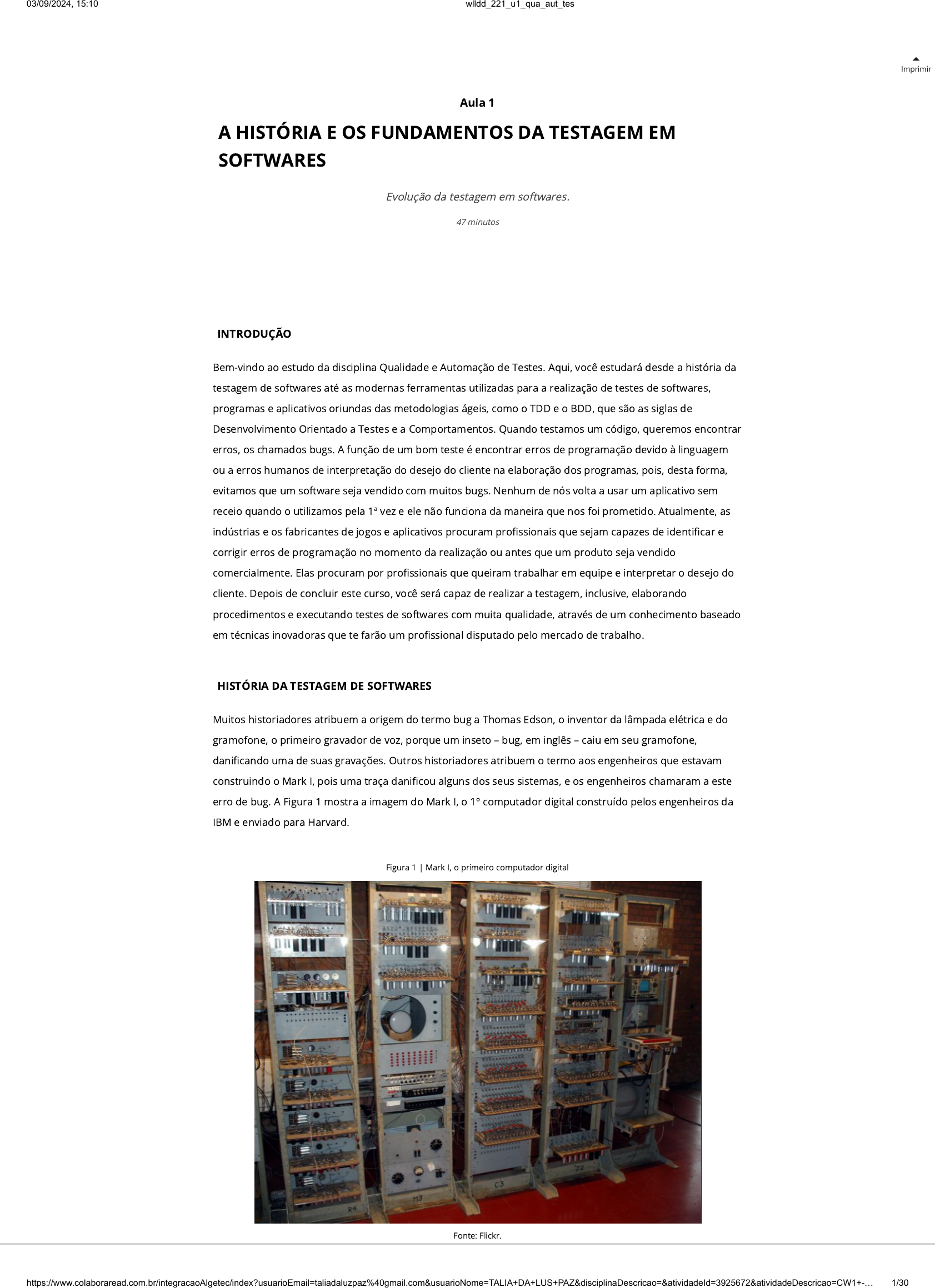 <p>Imprimir</p><p>INTRODUÇÃO</p><p>Bem-vindo ao estudo da disciplina Qualidade e Automação de Testes. Aqui, você estudará desde a história da</p><p>testagem de softwares até as modernas ferramentas utilizadas para a realização de testes de softwares,</p><p>programas e aplicativos oriundas das metodologias ágeis, como o TDD e o BDD, que são as siglas de</p><p>Desenvolvimento Orientado a Testes e a Comportamentos. Quando testamos um código, queremos encontrar</p><p>erros, os chamados bugs. A função de um bom teste é encontrar erros de programação devido à linguagem</p><p>ou a erros humanos de interpretação do desejo do cliente na elaboração dos programas, pois, desta forma,</p><p>evitamos que um software seja vendido com muitos bugs. Nenhum de nós volta a usar um aplicativo sem</p><p>receio quando o utilizamos pela 1ª vez e ele não funciona da maneira que nos foi prometido. Atualmente, as</p><p>indústrias e os fabricantes de jogos e aplicativos procuram pro�ssionais que sejam capazes de identi�car e</p><p>corrigir erros de programação no momento da realização ou antes que um produto seja vendido</p><p>comercialmente. Elas procuram por pro�ssionais que queiram trabalhar em equipe e interpretar o desejo do</p><p>cliente. Depois de concluir este curso, você será capaz de realizar a testagem, inclusive, elaborando</p><p>procedimentos e executando testes de softwares com muita qualidade, através de um conhecimento baseado</p><p>em técnicas inovadoras que te farão um pro�ssional disputado pelo mercado de trabalho.</p><p>HISTÓRIA DA TESTAGEM DE SOFTWARES</p><p>Muitos historiadores atribuem a origem do termo bug a Thomas Edson, o inventor da lâmpada elétrica e do</p><p>gramofone, o primeiro gravador de voz, porque um inseto – bug, em inglês – caiu em seu gramofone,</p><p>dani�cando uma de suas gravações. Outros historiadores atribuem o termo aos engenheiros que estavam</p><p>construindo o Mark I, pois uma traça dani�cou alguns dos seus sistemas, e os engenheiros chamaram a este</p><p>erro de bug. A Figura 1 mostra a imagem do Mark I, o 1º computador digital construído pelos engenheiros da</p><p>IBM e enviado para Harvard.</p><p>Figura 1 | Mark I, o primeiro computador digital</p><p>Fonte: Flickr.</p><p>Aula 1</p><p>A HISTÓRIA E OS FUNDAMENTOS DA TESTAGEM EM</p><p>SOFTWARES</p><p>Evolução da testagem em softwares.</p><p>47 minutos</p><p>03/09/2024, 15:10 wlldd_221_u1_qua_aut_tes</p><p>https://www.colaboraread.com.br/integracaoAlgetec/index?usuarioEmail=taliadaluzpaz%40gmail.com&usuarioNome=TALIA+DA+LUS+PAZ&disciplinaDescricao=&atividadeId=3925672&atividadeDescricao=CW1+-… 1/30</p><p>O certo é que, quando qualquer problema de programação ou de sistema aparece, dizemos que o software</p><p>“bugou”, ou seja, apresenta um erro que torna sua execução falha. No começo do desenvolvimento de</p><p>softwares e programas, os desenvolvedores não se atentavam para a importância da testagem antes do</p><p>término do processo, tanto que alguns programas e softwares chegaram a ir para o mercado sem sequer</p><p>terem sido testados. Com isso, o número de falhas de programação aumentou signi�cativamente a ponto de a</p><p>testagem começar a ser considerada um item essencial no desenvolvimento de softwares e programas. O</p><p>primeiro livro que abordou este tema, com um capítulo inteiro dedicado ao assunto, foi Computer</p><p>Programming Fundamentals, e o primeiro autor a escrever um livro totalmente dedicado a este assunto foi</p><p>Glenford Mayers, com seu livro A arte do teste de software. A partir daí, os órgãos regulamentadores, como o</p><p>IEEE (lemos I3E) e o IEC (lemos I E C, cada letra separadamente), passaram a desenvolver parâmetros para a</p><p>testagem de softwares. Estes métodos e procedimentos garantiam que um software fosse testado antes de</p><p>ser lançado no mercado, diminuindo o índice de falhas em programas de forma drástica.</p><p>No início dos anos 2000, foi publicado o livro Teste de Software, de Emerson Rios e Trayahú Moreira,</p><p>referência sobre o assunto no Brasil. A partir disso, várias empresas lançaram produtos para ajudar os</p><p>desenvolvedores e programadores a realizar a testagem automática dos seus programas e softwares,</p><p>tornando o trabalho mais con�ável e rápido. Um dos primeiros softwares de testagem, o Selenium®, que</p><p>automatiza ferramentas web para a realização de testes, foi fabricado pela empresa ThoughtWorks, em</p><p>Chicago. Atualmente, o Brasil realiza, através da Associação Latino-Americana de Teste de Software, um</p><p>exame para emitir certi�cados para os pro�ssionais que querem uma quali�cação extra nesta área, a qual é</p><p>emitida pelo International Software Testing Quali�cations Board (ISTQB), sendo que o 1º nível é chamado de</p><p>Certi�ed Tester.</p><p>Desta forma, os desenvolvedores de softwares, programas e aplicativos perceberam que um programa pode</p><p>ter seu valor expandido em razões estratosféricas se ele chegar ao mercado com erros que poderiam ser</p><p>percebidos e corrigidos antes do lançamento do produto e incorporaram a testagem de softwares como uma</p><p>das etapas fundamentais no seu desenvolvimento. Outro importante ganho foi terem feito este procedimento</p><p>segundo critérios apresentados e aplicados em normas de qualidade, o que fez com que a equipe de</p><p>desenvolvimento de softwares tenha que trabalhar junto à equipe de qualidade, permitindo um ganho na</p><p>descoberta de erros e falhas.</p><p>VIDEOAULA: HISTÓRIA DA TESTAGEM DE SOFTWARES</p><p>Neste vídeo, iremos nos aprofundar na história da testagem de softwares com a análise de algumas</p><p>estatísticas sobre a ocorrência de falhas em programas, assim como apresentaremos alguns casos de códigos</p><p>que foram lançados com inúmeras falhas que ajudaram a contribuir para a evolução da testagem.</p><p>ETAPAS DA TESTAGEM DE S