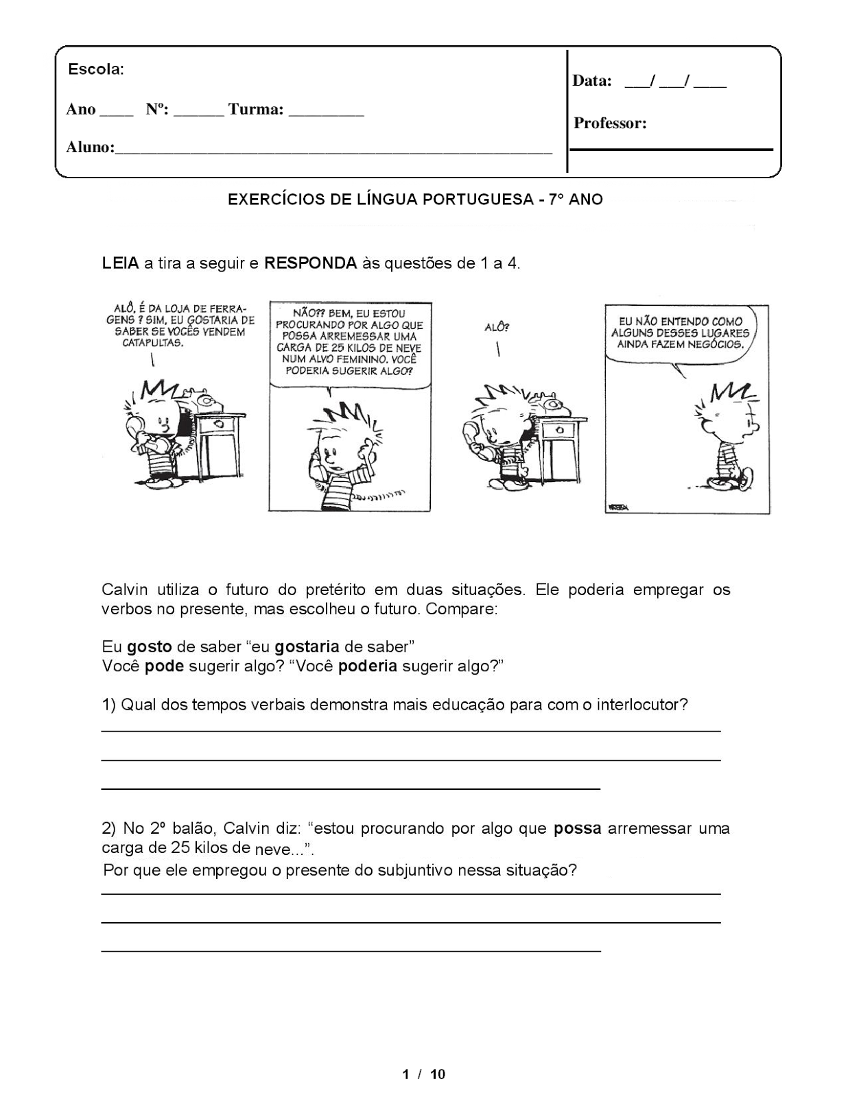 <p>Escola: Data: / / Ano Turma: Professor: Aluno: EXERCÍCIOS DE LÍNGUA PORTUGUESA - 7° ANO LEIA a tira a seguir e RESPONDA às questões de 1 a 4. AL8, É DA LOJA DE FERRA- NÃO?? BEM, EU ESTOU GENS ? SIM, EU GOSTARIA DE PROCURANDO POR ALGO QUE SABER SE VOCÊS ALO? EU NÃO ENTENDO COMO POSSA ARREMESSAR UMA ALGUNS DESSES LUGARES CARGA DE 25 KILOS DE NEVE AINDA FAZEM NUM ALVO FEMININO. PODERIA SUGERIR ALGO? Calvin utiliza o futuro do pretérito em duas situações. Ele poderia empregar os verbos no presente, mas escolheu o futuro. Compare: Eu gosto de saber "eu gostaria de saber" Você pode sugerir algo? "Você poderia sugerir algo?" 1) Qual dos tempos verbais demonstra mais educação para com o interlocutor? 2) No 2° balão, Calvin "estou procurando por algo que possa arremessar uma carga de 25 kilos de neve..." Por que ele empregou o presente do subjuntivo nessa situação? 1 / 10</p>