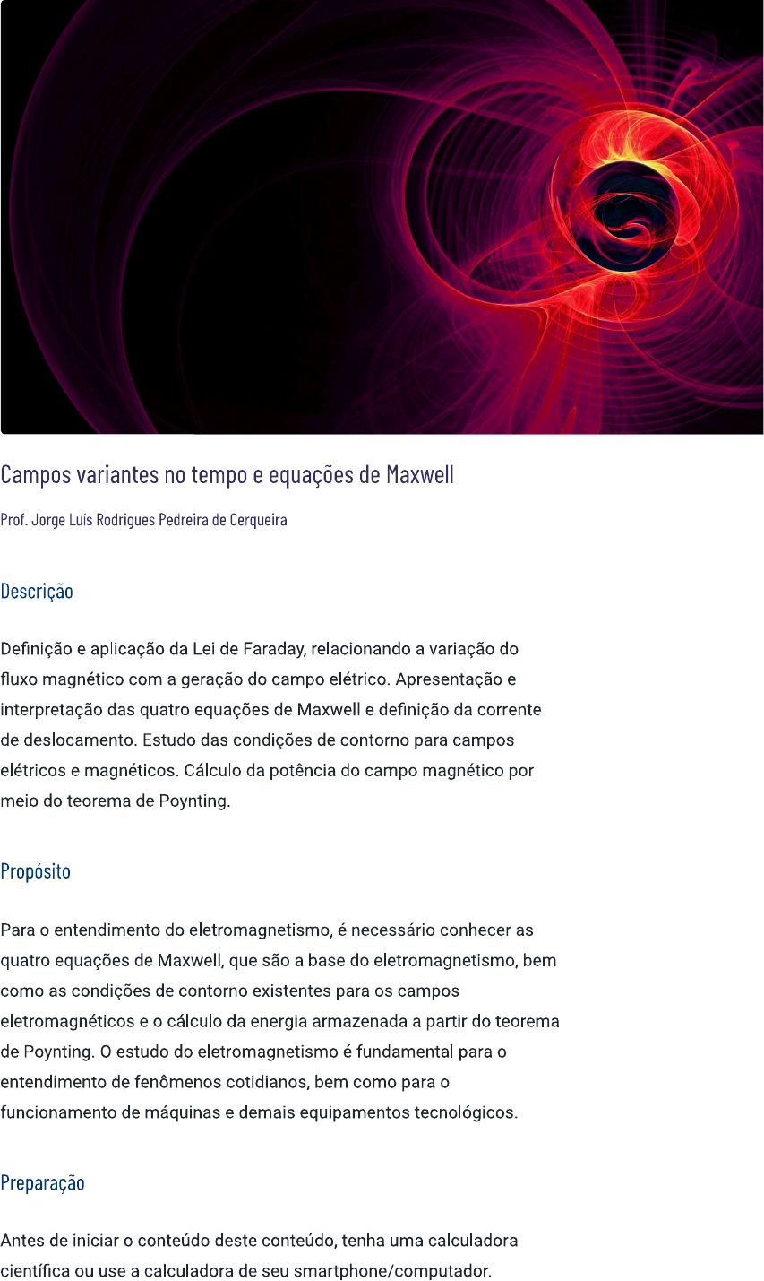 <p>Campos variantes no tempo e equações de Maxwell Prof. Jorge Rodrigues Pedreira de Cerqueira Descrição Definição e aplicação da Lei de Faraday, relacionando a variação do fluxo magnético com a geração do campo elétrico. Apresentação e interpretação das quatro equações de Maxwell e definição da corrente de deslocamento. Estudo das condições de contorno para campos elétricos e magnéticos. Cálculo da potência do campo magnético por meio do teorema de Poynting. Propósito Para o entendimento do eletromagnetismo, é necessário conhecer as quatro equações de Maxwell, que são a base do eletromagnetismo, bem como as condições de contorno existentes para os campos eletromagnéticos e o cálculo da energia armazenada a partir do teorema de Poynting. o estudo do eletromagnetismo é fundamental para o entendimento de fenômenos cotidianos, bem como para o funcionamento de máquinas e demais equipamentos tecnológicos. Preparação Antes de iniciar o conteúdo deste conteúdo, tenha uma calculadora científica ou use a calculadora de seu smartphone/computador.</p><p>Objetivos Módulo 1 Lei da indução magnética Aplicar a Lei de Faraday. Módulo 2 Equações de Maxwell - formulação diferencial e integral Definir as quatro equações de Maxwell na sua forma diferencial e integral. Módulo 3 Condições de contorno Aplicar as condições de contorno para o campo eletromagnético. Módulo 4 Teorema e vetor de Poynting Aplicar o teorema e o vetor de Poynting.</p><p>Introdução Compreenda neste vídeo os conceitos de campos variantes no tempo e as equações de Maxwell. Para assistir a um vídeo sobre o assunto, acesse a versão online deste conteúdo. 1 - Lei da indução magnética Ao final deste módulo, você será capaz de aplicar a Lei de Faraday. Vamos começar! A Lei de Faraday Conheça agora os principais pontos que serão abordados neste módulo.</p><p>Para assistir a um vídeo sobre o assunto, acesse a versão online deste conteúdo. Introdução à Lei de Faraday Até esse ponto, no estudo do eletromagnetismo, trabalhamos com campos eletrostáticos e magnetostáticos, isto é, campos invariantes no tempo. Vimos que os campos elétricos eram criados por cargas elétricas e os campos magnéticos, por cargas elétricas em movimento. Acontece que um novo fenômeno foi observado: a criação de um campo elétrico com a variação temporal do campo magnético. Na verdade, ao acontecer uma variação temporal do fluxo magnético através de uma área, verificou-se a criação de um campo elétrico. Dessa forma, foi possível vislumbrar uma nova fonte geradora de campo elétrico. Essas experiências foram conduzidas por Michael Faraday, na Inglaterra, e Joseph Henry, nos Estados Unidos, de forma independente. Elas deram origem a uma importante lei do eletromagnetismo: a Lei de Faraday. A Lei de Faraday tem diversas aplicações práticas, como o funcionamento dos geradores e transformadores. E o campo elétrico variável não vai gerar campo magnético? Isso vai ser observado posteriormente por Maxwell, cuja proposição será a criação da corrente de deslocamento (que nada mais é do que a variação do fluxo elétrico). Ele vai propor então a complementação da Lei de Ampère para incluir a variação de fluxo elétrico também como geradora de campo magnético. Comentário</p><p>A corrente de deslocamento e a Lei de Ampère complementada serão estudadas posteriormente na etapa em que abordarmos as equações de Maxwell. Lei de Faraday Desde 1820, a partir de experiências realizadas pelo físico dinamarquês Hans C. Orsted, e, posteriormente, na década de 1830, pela Lei de Ampère, já havia provas de que as correntes elétricas criavam ao redor de si um campo magnético. Isso serviu de incentivo para alguns cientistas tentarem provar o fenômeno recíproco, isto é, a criação do campo elétrico por meio do campo magnético. Um desses cientistas que acabou tendo êxito foi Michael Faraday. Inicialmente, Faraday queria provar que um campo magnético constante poderia induzir, em um enrolamento, uma diferença de potencial que consequentemente produziria uma corrente elétrica nesse circuito. Suas tentativas iniciais foram frustradas, pois isso não ocorreu. Acontece, porém, que algo chamou sua atenção: quando o circuito que gerava o campo magnético era desligado ou ligado, uma corrente elétrica era induzida no outro enrolamento. Desse modo, Faraday percebeu que, quando ele desligava ou ligava o circuito, o campo magnético estava variando no tempo e produzia um campo elétrico. Por isso, ele observou que não era o campo magnético que induzia uma nova corrente, e sim a sua variação temporal. Dessa forma, Faraday conseguiu estabelecer uma lei, denominada Lei de Faraday, que pode ser equacionada por: Em que fem é uma força eletromotriz, isto é, uma diferença de potencial. A Lei de Faraday nos mostra que, toda vez que tivermos uma variação temporal do fluxo magnético através de uma área representada por</p><p>$ B . ds , será induzida nessa área uma diferença de potencial (força S eletromotriz - fem). Essa força é denominada força eletromotriz de Faraday. Relembrando No estudo do campo elétrico, existe uma relação entre diferença de potencial e campo elétrico. Ao se criar uma diferença de potencial na área atravessada pelo fluxo magnético variante no tempo, um campo elétrico também é criado. Lembremos que a diferença de potencial pode ser representada por uma integral de linha do campo elétrico. Dessa forma, podemos apresentar a Lei de Faraday como: Se usarmos o teorema de Stokes, sairemos da forma integral e encontraremos a forma diferencial da Lei de Faraday: It ou It Em que é a permeabilidade magnética do meio. Observe que o fluxo magnético é obtido pelo produto escalar entre o vetor densidade de fluxo magnético e o vetor área. Assim: ds = ds = Ods S Em que é o ângulo formado entre o campo magnético e a nor