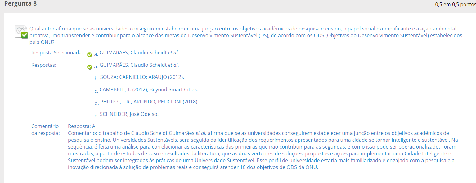 <p>Pergunta 8 0,5 em 0,5 pontos Qual autor afirma que se as universidades conseguirem estabelecer uma junção entre os objetivos acadêmicos de pesquisa e ensino, papel social exemplificante e a ação ambiental proativa, irão transcender e contribuir para alcance das metas do Desenvolvimento Sustentável (DS), de acordo com os ODS (Objetivos do Desenvolvimento Sustentável) estabelecidos pela ONU? Resposta Selecionada: a. Claudio Scheidt et al. Respostas: a. Claudio Scheidt et al. b. SOUZA; CARNIELLO; ARAUJO (2012). CAMPBELL, T. (2012), Beyond Smart Cities. d. PHILIPPI, J. R.; ARLINDO; PELICIONI (2018). e. SCHNEIDER, José Odelso Comentário Resposta: A da resposta: Comentário: trabalho de Claudio Scheidt Guimarães et al. afirma que se as universidades conseguirem estabelecer uma junção entre os objetivos acadêmicos de pesquisa e ensino, Universidades Sustentáveis, será seguida da identificação dos requerimentos apresentados para uma cidade se tornar inteligente e sustentável. Na sequência, é feita uma análise para correlacionar as características das primeiras que irão contribuir para as segundas, e como isso pode ser operacionalizado. Foram mostradas, a partir de estudos de caso e resultados da literatura, que as duas vertentes de soluções, propostas e ações para implementar uma Cidade Inteligente e Sustentável podem ser integradas às práticas de uma Universidade Sustentável. Esse perfil de universidade estaria mais familiarizado e engajado com a pesquisa e a inovação direcionada à solução de problemas reais e conseguirá atender 10 dos objetivos de ODS da ONU.</p>