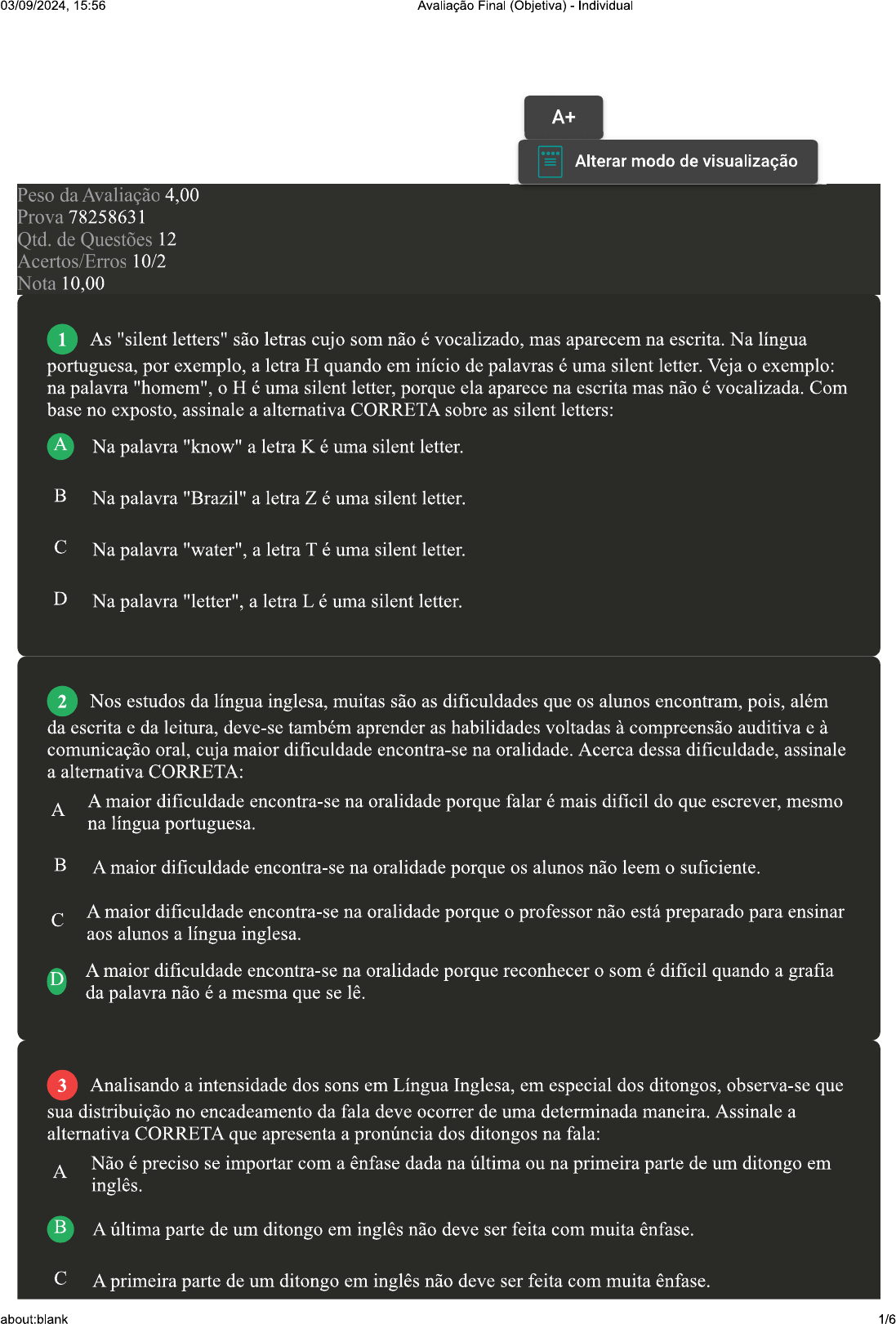 <p>03/09/2024, 15:56 Avaliação Final (Objetiva) Individual A+ Alterar modo de visualização Peso da Avaliação 4,00 Prova 78258631 Qtd. de Questões 12 Acertos/Erros 10/2 Nota 10,00 1 As "silent letters" são letras cujo som não é vocalizado, mas aparecem na escrita. Na língua portuguesa, por exemplo, a letra H quando em início de palavras é uma silent letter. Veja exemplo: na palavra "homem", H é uma silent letter, porque ela aparece na escrita mas não é vocalizada. Com base no exposto, assinale a alternativa CORRETA sobre as silent letters: A Na palavra "know" a letra K é uma silent letter. B Na palavra "Brazil" a letra Z é uma silent letter. C Na palavra "water". a letra T é uma silent letter. D Na palavra "letter". a letra L é uma silent letter. 2 Nos estudos da língua inglesa, muitas são as dificuldades que os alunos encontram, pois, além da escrita e da leitura, deve-se também aprender as habilidades voltadas à compreensão auditiva e à comunicação oral, cuja maior dificuldade encontra-se na oralidade. Acerca dessa dificuldade, assinale a alternativa CORRETA: A A maior dificuldade encontra-se na oralidade porque falar é mais difícil do que escrever, mesmo na língua portuguesa. B A maior dificuldade encontra-se na oralidade porque os alunos não leem suficiente. C A maior dificuldade encontra-se na oralidade porque professor não está preparado para ensinar aos alunos a língua inglesa. A maior dificuldade encontra-se na oralidade porque reconhecer som é difícil quando a grafia da palavra não é a mesma que se 3 Analisando a intensidade dos sons em Língua Inglesa, em especial dos ditongos, observa-se que sua distribuição no encadeamento da fala deve ocorrer de uma determinada maneira. Assinale a alternativa CORRETA que apresenta a pronúncia dos ditongos na fala: A Não é preciso se importar com a ênfase dada na última ou na primeira parte de um ditongo em B A última parte de um ditongo em inglês não deve ser feita com muita C A primeira parte de um ditongo em inglês não deve ser feita com muita ênfase. about:blank 1/6</p><p>03/09/2024, 15:56 Avaliação Final (Objetiva) Individual D A última parte de um ditongo em inglês não deve ser feita com pouca Revisar Conteúdo do Livro 4 Um erro comum das pessoas que estão buscando boa fluência em inglês ocorre com pronúncia e entonação inadequadas e a velocidade com que falam. Como a pronúncia e a entonação ocorrem fora dos padrões, muitas vezes, é difícil entender sentido do que é A fim de realizar uma comunicação eficaz e ensinar aos alunos, é importante levar alguns aspectos em consideração. Sobre exposto, assinale a alternativa INCORRETA: A Preocupar-se com acento e entonação das frases. B Manter um ritmo ou velocidade correto ao falar. C Adquirir e melhorar a fluência na Língua Inglesa. D Falar as palavras uma após a outra, sempre da mesma maneira. Revisar Conteúdo do Livro 5 Dependendo da terminação de algumas palavras, a ortografia e a terminação pode mudar na língua inglesa. As terminações das palavras em inglês com final muda para - es. Palavras terminadas em -sh, -ch ou recebem um "e" adicional antes do -S (plural ou terceira pessoa). Com base no exposto, assinale a alternativa que apresenta a sequência CORRETA: A Kiss > kisses; wash > washes; watch > watches; fix > fixes. B Love> loves; watch > watches; drive > drives; kiss > kisses. C Pay > pays; cry > cries; watch > watches; bus > buses. D Cherry > cherries; pahse > phases; watch > watches. 6 Existem na fonética, nomes para posicionamento das consoantes e vogais dentro da sílaba. Isso porque muitas vezes a letra R pode estar posicionada no início da sílaba, no meio ou mesmo no final. Tomemos por exemplo as palavras POR TA, PRO VA e A TOR. Na palavra porta, R está no final da sílaba. Na palavra prova, ele está no meio da sílaba e na palavra ator, ele está no final. Com relação à nomenclatura do posicionamento das consoantes e vogais nas sílabas, assinale a alternativa CORRETA: A O NÚCLEO da sílaba sempre será formado por uma consoante. B Chamamos de ONSET a posição inicial da sílaba. Por exemplo, na palavra DOOR a letra D está em onset. C Chamamos de CODA centro da sílaba, por exemplo, na palavra TROU BLE. as letras R e L estão em coda. about:blank 2/6</p><p>03/09/2024 15:56 Avaliação Final (Objetiva) Individual D Na língua inglesa não existem sílabas formadas por CVC (Consoante Vogal Consoante), como na língua portuguesa. 7 Os modos de articulação, na produção sonora, definem de que maneira som será emitido para a comunicação. Na produção de sons da língua inglesa, produzem-se sons diferentes dos da língua portuguesa, mas os modos de articulação são os mesmos. Com base no exposto, classifique V para as sentenças verdadeiras e F para as falsas: ( ) Quando os sons sofrem fechamento dos articuladores durante a passagem de ar, ocorrem os sons oclusivos. ( ) Nos sons fricativos, ocorre a produção do som de uma oclusão seguida de uma pequena abertura entre os articuladores. ( ) Os sons nasais ocorrem quando ar ressoa pela cavidade nasal. ( ) O som /f/, como em "fork" é lateral, pois ar passa pelas laterais da boca. Assinale a alternativa que apresenta a sequência CORRETA: A B V-F-V-V C D F-V-V-V 8 Existe, na língua inglesa, uma regra que diz que caso os substantivos e os adjetivos tenham como sílaba tônica a penúltima, foco dos verbos será a última. Sobre exposto, classifique V para as sentenças verdadeiras e F para as falsas: ( ) Na língua inglesa, sílaba forte não é mesmo que dizer sílaba tônica. ( ) Nas palavras agree, intend e achieve, a tonicidade está na parte final da palavra. ( ) Não existem palavras na língua inglesa cuja sílaba tônica seja a primeira. ( ) A sílaba forte da palavra pode ser aquela na qual a rima tem núcleo com vogal curta. Assinale a alternativa que apresenta a sequência CORRETA: A B V-V-F-V C D V. 9 Na língua i