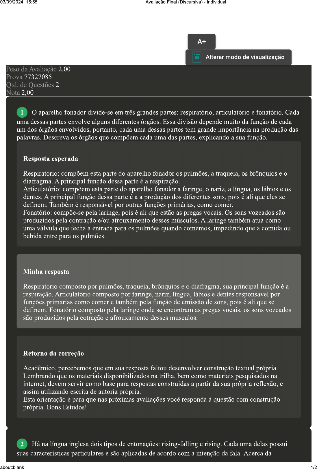 <p>15:55 Avaliação Final (Discursiva) Individual A+ Alterar modo de visualização Peso da Avaliação 2,00 Prova 77327085 Qtd. de Questões 2 Nota 2,00 1 O aparelho fonador divide-se em três grandes partes: respiratório, articulatório e fonatório. Cada uma dessas partes envolve alguns diferentes órgãos. Essa divisão depende muito da função de cada um dos órgãos envolvidos, portanto, cada uma dessas partes tem grande importância na produção das palavras. Descreva os órgãos que compõem cada uma das partes, explicando a sua função. Resposta esperada Respiratório: compõem esta parte do aparelho fonador os a traqueia, os brônquios e diafragma. A principal função dessa parte é a respiração. Articulatório: compõem esta parte do aparelho fonador a faringe, nariz, a língua, os lábios e dentes. A principal função dessa parte é a a produção dos diferentes sons, pois é ali que eles se definem. Também é responsável por outras funções primárias, como comer. Fonatório: compõe-se pela laringe, pois é ali que estão as pregas vocais. Os sons vozeados são produzidos pela contração e/ou afrouxamento desses músculos. A laringe também atua como uma válvula que fecha a entrada para os pulmões quando comemos, impedindo que a comida ou bebida entre para os pulmões. Minha resposta Respiratório composto por traqueia, brônquios e diafragma, sua principal função é a respiração. Articulatório composto por faringe, nariz, língua, lábios e dentes responsavel por funções primarias como comer e também pela função de emissão de sons, pois é ali que se definem. Fonatório composto pela laringe onde se encontram as pregas vocais, os sons vozeados são produzidos pela cotração e afrouxamento desses musculos. Retorno da correção Acadêmico, percebemos que em sua resposta faltou desenvolver construção textual própria. Lembrando que os materiais disponibilizados na trilha, bem como materiais pesquisados na internet, devem servir como base para respostas construidas a partir da sua própria reflexão, e assim utilizando escrita de autoria própria. Esta orientação é para que nas próximas avaliações você responda à questão com construção própria. Bons Estudos! 2 Há na língua inglesa dois tipos de entonações: rising-falling e rising. Cada uma delas possui suas características particulares e são aplicadas de acordo com a intenção da fala. Acerca da about:blank 1/2</p><p>03/09/2024, 15:55 Avaliação Final (Discursiva) - Individual entonação das sentenças da língua inglesa, explique que é a "rising-falling intonation" e exemplifique. Resposta esperada O rising-falling intonation também é conhecido como entonação descendente. Ocorre quando a sobe e desce. Por exemplo, na palavra "blackboard". Observe que a primeira parte da palavra é forte, ao passo que a segunda parte da palavra é fraca. Diz-se, desta maneira, BLACKboard. Minha resposta A rising-falling intonation também é conhecida como intonação descendente, que ocorre quando a sobe e desce, podemos utilizar de exemplo a palavra blackboard BLACK (rising) board (falling) Retorno da correção Acadêmico, percebemos que em sua resposta faltou desenvolver construção textual própria. Lembrando que os materiais disponibilizados na trilha, bem como materiais pesquisados na internet, devem servir como base para respostas construidas a partir da sua própria reflexão, e assim utilizando escrita de autoria própria. Esta orientação é para que nas próximas avaliações você responda à questão com construção própria. Bons Estudos! Imprimir about:blank 2/2</p>