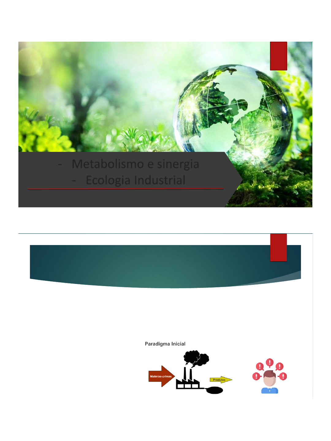 <p>21/06/2023</p><p>1</p><p>- Metabolismo e sinergia</p><p>- Ecologia Industrial</p><p>Docente: Bruna Borges Soares</p><p>• Até meados dos anos 1950, concebia-se o sistema produtivo separado do meio</p><p>ambiente, portanto, os problemas ambientais situavam-se fora das fronteiras do</p><p>sistema industrial.</p><p>• Sob esse ponto de vista, os estudos tinham como foco a consequências da poluição e</p><p>não nas causas.</p><p>21/06/2023</p><p>2</p><p>Modelo convencional da economia</p><p> Sistema aberto;</p><p> Entram continuamente recursos naturais e são liberados resíduos;</p><p> Segunda lei da termodinâmica</p><p> Degradação → Através da irreversibilidade dos processos.</p><p>Conceitos</p><p>Giannetti & Almeida, 2006</p><p>21/06/2023</p><p>3</p><p>Figura - Economia como sistema aberto: interação ambiente/economia</p><p>• A Ecologia Industrial, uma nova abordagem da relação entre a indústria e o meio</p><p>ambiente, vem sendo desenvolvida em muitos países, especialmente, nos Estados</p><p>Unidos, na comunidade Europeia e no Japão.</p><p>Ecologia Industrial</p><p>• No Brasil a Ecologia Industrial é ainda um tema relativamente desconhecido no meio</p><p>acadêmico e, principalmente, no meio empresarial.</p><p>21/06/2023</p><p>4</p><p>• Não há um consenso quanto a definição da Ecologia Industrial, porém há vários</p><p>pontos em comum entre as diversas definições encontradas na literatura:</p><p>▫ A Ecologia Industrial é sistêmica, abrangente, possui uma visão integrada de todos os</p><p>componentes do sistema industrial e seus relacionamentos com a biosfera.</p><p>• “A Ecologia Industrial baseia-se na metáfora que advém de retirar da análise do</p><p>funcionamento dos ecossistemas naturais lições úteis para gerir melhor os sistemas</p><p>industriais“.</p><p>21/06/2023</p><p>5</p><p>O conceito envolve a participação de duas ou mais empresas, com a finalidade de</p><p>desenvolver/produzir produtos, resíduos e subprodutos cujo impacto no meio ambiente</p><p>seja menor que aquele de cada empresa atuando independentemente de outras.</p><p>• Dessa forma, o sistema global, que é resultado de várias contribuições</p><p>menores causará, como um todo, menor impacto ambiental do que aquele causado</p><p>pela soma dos impactos das unidades individuais.</p><p>• O objetivo da ecologia industrial neste contexto é estabelecer o total uso/reuso de</p><p>reservas, para que o sistema não descarte nenhum resíduo, ou seja, emissão zero.</p><p>21/06/2023</p><p>6</p><p>Histórico</p><p>• A Ecologia Industrial está baseada no estudo de sistemas e na termodinâmica.</p><p>• As metodologias para o estudo de sistemas foram estudadas por Jay Forrester nos</p><p>anos 60 e 70 .</p><p>• Donella e Dennis Meadows utilizaram a análise de sistemas para simular a</p><p>degradação ambiental do planeta e enfatizaram o caminho insustentável do sistema</p><p>industrial vigente.</p><p>• Desde então, a associação indústria-ecologia tem se manifestado de forma dispersa ao</p><p>longo das últimas três décadas.</p><p>• Alguns ecologistas há tempo tinham a percepção do sistema industrial como um</p><p>subsistema da biosfera que, demandando recursos e serviços da mesma, teriam que</p><p>ser analisados conjuntamente.</p><p>21/06/2023</p><p>7</p><p>• A ideia de descrever os fluxos de material e energia, inerentes aos processos</p><p>industriais, como um sistema metabólico, foi introduzida por Robert U. Ayres, com o</p><p>termo “Metabolismo Industrial”.</p><p>• O conceito se fundamenta, basicamente, na aplicação balanços de massa</p><p>circulação de materiais e balanços de energia ao longo dos processos produtivos.</p><p>Metabolismo Industrial</p><p>• O Metabolismo Industrial trata dos fluxos de matéria e energia no sistema industrial.</p><p>• A Ecologia Industrial vai mais longe:</p><p>▫ A abordagem procura entender como o sistema industrial opera, quais são os</p><p>mecanismos reguladores e qual sua interação com a biosfera.</p><p>Metabolismo Industrial</p><p>21/06/2023</p><p>8</p><p> Metabolismo da natureza</p><p> Metabolismo da indústria</p><p>“Fechar o ciclo das substâncias de uso indústria é um dos principais desafios a</p><p>superar para conseguir tornar sustentável o atual sistema de produção”</p><p>Ecologia Industrial</p><p> Assume uma abordagem sistêmica e integradora de materiais, processo, produtos</p><p>e serviço, e as politicas desenhadas neste contexto devem ter como fim último a</p><p>sustentabilidade do sistema global;</p><p> Incorpora as práticas, ferramentas e objetivos das outras perspectivas;</p><p> Estender o âmbito da relação ambiente, economia e sociedade;</p><p>• “O sistema industrial como um todo, depende dos recursos e serviços provenientes</p><p>da biosfera, dos quais não pode estar dissociado”.</p><p>21/06/2023</p><p>9</p><p>Ecologia Industrial</p><p> Ecologia Industrial: Uma lição da Natureza</p><p> Copiar o desenvolvimento de ecossistemas sustentáveis</p><p> Fechar os ciclos dos materiais</p><p> Promover a utilização da energia em cascata</p><p> Aproximar os sistemas do “equilíbrio termodinâmico”</p><p> Minimizar a entropia</p><p> Sistemas interdependentes e altamente organizados</p><p>Simbiose Industrial</p><p> O conceito de Simbiose Industrial é uma das abordagens produtivas para a</p><p>ecologia industrial, que é baseado na sinergia entre diferentes atividades</p><p>produtivas que apresentam maior eficiência de recursos resultando em</p><p>benefícios ambientais, sociais e econômicos.</p><p> “Segundo Chertow (2000), os elementos chave para a Simbiose Industrial (SI)</p><p>são a colaboração e as possibilidades sinérgicas proporcionadas pela</p><p>proximidade geográfica entre as organizações interessadas.”</p><p>21/06/2023</p><p>10</p><p> Dado sistema industrial seja analisado em conjunto com outros sistemas que o</p><p>rodeiam, de m