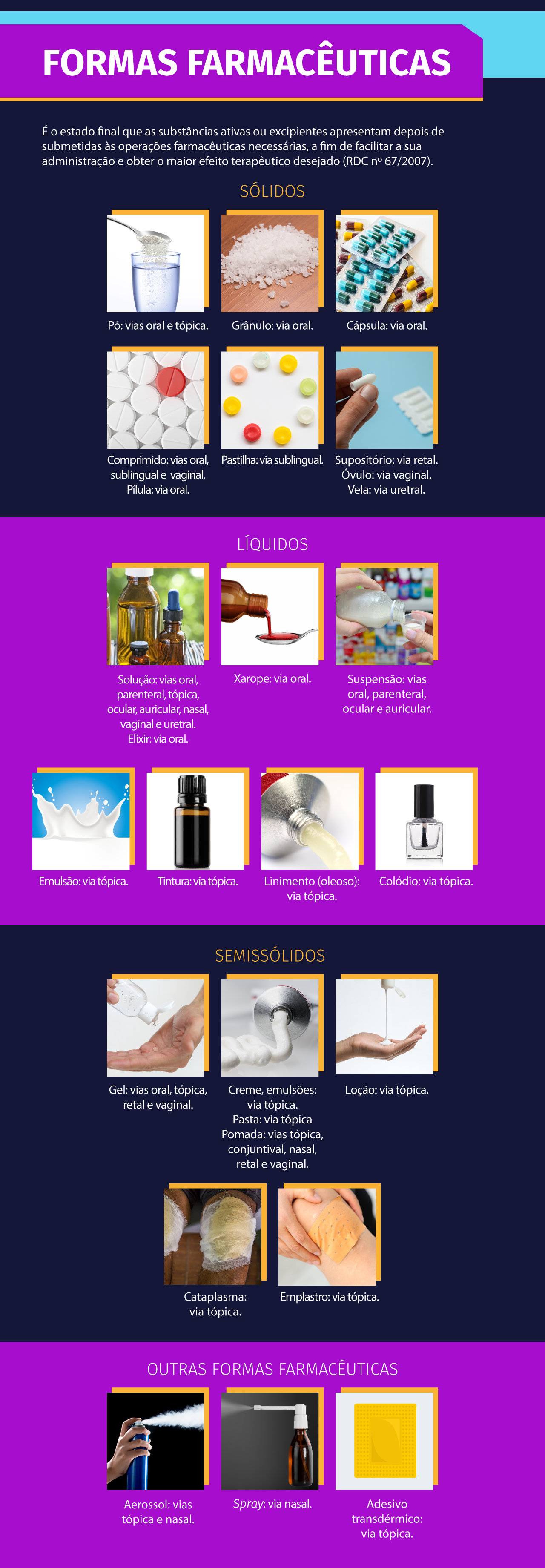 <p>FORMAS FARMACÊUTICAS É estado final que as substâncias ativas ou excipientes apresentam depois de submetidas às operações farmacêuticas necessárias, a fim de facilitar a sua administração e obter maior efeito terapêutico desejado (RDC 67/2007). SÓLIDOS Pó: vias oral e tópica. Grânulo: via Cápsula: via oral. Comprimido: vias oral, Pastilha: via sublingual. Supositório: via retal. vaginal. Óvulo: via vaginal. via oral. Vela: via uretral. LÍQUIDOS Solução: vias oral, Xarope: via oral. Suspensão: vias parenteral, tópica, parenteral, auricular. nasal, ocular e auricular. vaginal e uretral. Elixir: via oral. 1 Emulsão: via Tintura: via tópica. Linimento (oleoso): Colódio: via tópica. via tópica. SEMISSÓLIDOS Gel: vias oral, Creme, emulsões: Loção: via tópica. retal e vaginal. via tópica. Pasta: via tópica Pomada: vias tópica, conjuntival, nasal, retal vaginal. Cataplasma: Emplastro: via tópica. via tópica. OUTRAS FORMAS FARMACÊUTICAS Aerossol: vias Spray: via nasal. Adesivo transdérmico:</p>