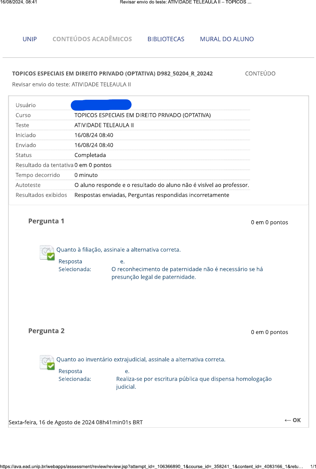 <p>16/08/2024, 08:41 Revisar envio do teste: ATIVIDADE TELEAULA II - TOPICOS UNIP CONTEÚDOS ACADÊMICOS BIBLIOTECAS MURAL DO ALUNO TOPICOS ESPECIAIS EM DIREITO PRIVADO (OPTATIVA) D982_50204_R_20242 CONTEÚDO Revisar envio do teste: ATIVIDADE TELEAULA Usuário Curso TOPICOS ESPECIAIS EM DIREITO PRIVADO (OPTATIVA) Teste ATIVIDADE TELEAULA Iniciado 16/08/24 08:40 Enviado 16/08/24 08:40 Status Completada Resultado da tentativa 0 em 0 pontos Tempo decorrido 0 minuto Autoteste O aluno responde e o resultado do aluno não é visível ao professor. Resultados exibidos Respostas enviadas, Perguntas respondidas incorretamente Pergunta 1 0 em 0 pontos Quanto à filiação, assinale a alternativa correta. Resposta e. Selecionada: reconhecimento de paternidade não é necessário se há presunção legal de paternidade. Pergunta 2 0 em 0 pontos Quanto ao inventário extrajudicial, assinale a alternativa correta. Resposta e. Selecionada: Realiza-se por escritura pública que dispensa homologação judicial. OK Sexta-feira, 16 de Agosto de 2024 08h41min01s BRT 1/1</p>