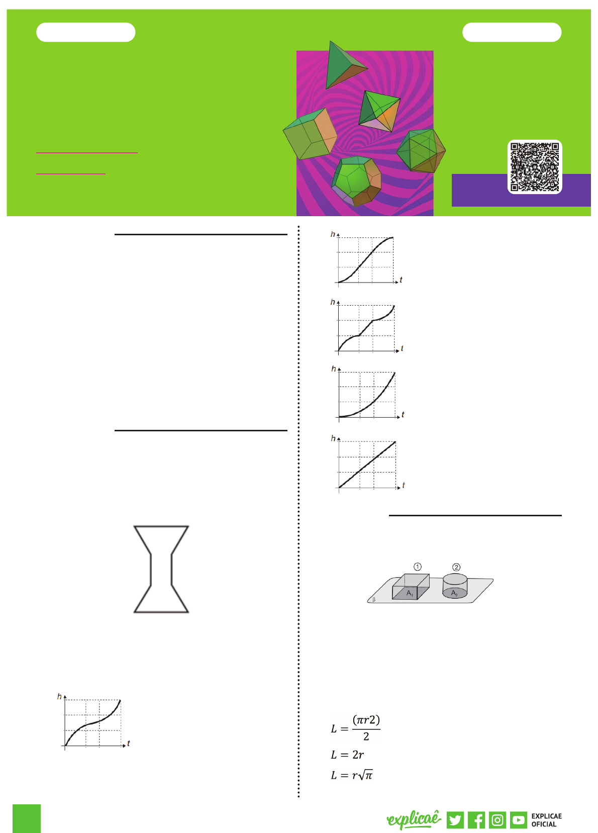 <p>860</p><p>CAPÍTULO 14.4</p><p>CILINDRO</p><p>MATEMÁTICA</p><p>ENEM MÓDULO 14</p><p>QUESTÃO 01</p><p>(ENEM 2011 2ª APLICAÇÃO) Uma cidade possui um</p><p>reservatório de água C1 na forma de um cilindro circular</p><p>reto, com 5 metros de altura e capacidade para 100 m3 de</p><p>água. Foi construído outro reservatório C2, com o mesmo</p><p>formato do anterior, com a mesma altura, cujo raio da base</p><p>é o dobro de C1.</p><p>Nessas condições, a razão entre os volumes de C1 e de C2 é</p><p>igual a</p><p>A 1/2</p><p>B 2</p><p>C 1</p><p>D 1/4</p><p>E 1/8</p><p>QUESTÃO 02</p><p>(ENEM 2014 1ª APLICAÇÃO) Para comemorar o aniversário</p><p>de uma cidade, um artista projetou uma escultura</p><p>transparente e oca, cujo formato foi inspirado em uma</p><p>ampulheta. Ela é formada por três partes de mesma altura:</p><p>duas são troncos de cone e outra é um cilindro. A fi gura é a</p><p>vista frontal dessa escultura.</p><p>No topo da escultura foi ligada uma torneira que verte água,</p><p>para dentro dela, com vazão constante. O gráfi co expressa</p><p>a altura (h) da água na escultura em função do tempo (t)</p><p>decorrido é</p><p>A</p><p>B</p><p>C</p><p>D</p><p>E</p><p>QUESTÃO 03</p><p>(ENEM 2009 CANCELADO) Em uma padaria, há dois tipos de</p><p>forma de bolo, formas 1 e 2, como mostra a fi gura abaixo.</p><p>Sejam L o lado da base da forma quadrada, r o raio da base</p><p>da forma redonda, A1 e A2 as áreas das bases das formas 1 e</p><p>2, e V1 e V2 os seus volumes, respectivamente.</p><p>Se as formas têm a mesma altura h, para que elas</p><p>comportem a mesma quantidade de massa de bolo, qual é</p><p>a relação entre r e L?</p><p>A</p><p>B</p><p>C</p><p>861</p><p>MÓDULO 14 | 14.4 CILINDRO</p><p>D</p><p>E</p><p>QUESTÃO 04</p><p>(ENEM 2009 CANCELADO) Em uma praça pública, há uma</p><p>fonte que é formada por dois cilindros, um de raio r e altura</p><p>h1, e o outro de raio R e altura h2. O cilindro do meio enche</p><p>e, após transbordar, começa a encher o outro.</p><p>Se R = r √2 e h2 = h1/3 e, para encher o cilindro do meio,</p><p>foram necessários 30 minutos, então, para se conseguir</p><p>encher essa fonte e o segundo cilindro, de modo que fi que</p><p>completamente cheio, serão necessários</p><p>A 40 minutos.</p><p>B 60 minutos.</p><p>C 30 minutos.</p><p>D 20 minutos.</p><p>E 50 minutos.</p><p>QUESTÃO 05</p><p>(ENEM 2009 2ª APLICAÇÃO) A empresa SWED celulose faz</p><p>o transporte de seus rolos em containeres num formato de</p><p>um cilindro. Em cada um deles são transportados três rolos</p><p>de celulose de raio igual a 1 m, tangentes entre si dois a dois</p><p>e os três tangentes ao cilindro que os contém. Contudo, a</p><p>empresa está interessada em descobrir o espaço que fi ca</p><p>vago entre os rolos de celulose e o container que os contém,</p><p>para preenchê-lo com resíduos de papel.</p><p>Para conhecer o espaço vago, é necessário determinar o</p><p>raio do cilindro que contém os três cilindros pequenos. Esse</p><p>raio é igual a</p><p>A</p><p>B</p><p>C</p><p>D</p><p>E</p><p>QUESTÃO 06</p><p>(ENEM 2010 1ª APLICAÇÃO) Dona Maria, diarista na casa</p><p>da famí lia Teixeira, precisa fazer café para servir as vinte</p><p>pessoas que se encontram numa reuniã o na sala. Para</p><p>fazer o café, Dona Maria dispõ e de uma leiteira cilí ndrica e</p><p>copinhos plá sticos, també m cilí ndricos.</p><p>Com o objetivo de não desperdiçar café, a diarista deseja</p><p>colocar a quantidade mínima de água na leiteira para encher</p><p>os vinte copinhos pela metade. Para que isso ocorra, Dona</p><p>Maria deverá</p><p>A encher cinco leiteiras de água, pois ela tem um volume 10</p><p>vezes maior que o volume do copo.</p><p>B encher a leiteira toda de água, pois ela tem um volume 20</p><p>vezes maior que o volume do copo.</p><p>C encher a leiteira toda de água, pois ela tem um volume 10</p><p>vezes maior que o volume do copo.</p><p>D encher a leiteira até a metade, pois ela tem um volume 20</p><p>vezes maior que o volume do copo.</p><p>E encher duas leiteiras de água, pois ela tem um volume 10</p><p>vezes maior que o volume do copo.</p><p>QUESTÃO 07</p><p>(ENEM 2010 1ª APLICAÇÃO) Para construir uma manilha de</p><p>esgoto, um cilindro com 2 m de diâ metro e 4 m de altura (de</p><p>espessura desprezível), foi envolvido homogeneamente por</p><p>uma camada de concreto, contendo 20 cm de espessura.</p><p>Supondo que cada metro cúbico de concreto custe R$ 10,00</p><p>e tomando 3,1 como valor aproximado de π, então o preço</p><p>dessa manilha é igual a</p><p>A R$104,16.</p><p>B R$49,60.</p><p>C R$ 230,40.</p><p>D R$124,00.</p><p>E R$ 54,56.</p><p>QUESTÃO 08</p><p>(ENEM 2010 1ª APLICAÇÃO) No manejo sustentável de</p><p>fl orestas, é preciso muitas vezes obter o volume da tora que</p><p>pode ser obtida a partir de uma árvore. Para isso, existe um</p><p>método prático, em que se mede a circunferência da árvore</p><p>à altura do peito de um homem (1,30m), conforme indicado</p><p>na fi gura. A essa medida denomina-se “rodo” da árvore. O</p><p>quadro a seguir indica a fórmula para se cubar, ou seja,</p><p>obter o volume da tora em m³ a partir da medida do rodo e</p><p>da altura da árvore.</p><p>O volume da tora em m3 é dado por</p><p>V = rodo2× altura × 0,06</p><p>O rodo e a altura da árvore devem ser medidos em metros.</p><p>O coefi ciente 0,06 foi obtido experimentalmente.</p><p>862</p><p>MÓDULO 14 | 14.4 CILINDRO</p><p>Um técnico em manejo fl orestal recebeu a missão de cubar,</p><p>abater e transportar cinco toras de madeira, de duas</p><p>espécies diferentes, sendo</p><p>• 3 toras da espécie I, com 3 m de rodo, 12 m de</p><p>comprimento e densidade 0,77 toneladas/m³;</p><p>• 2 toras da espécie II, com 4 m de rodo, 10 m de</p><p>comprimento e densidade 0,78 toneladas/m³.</p><p>Após realizar seus cálculos, o técnico solicitou que</p><p>enviassem caminhões para transp