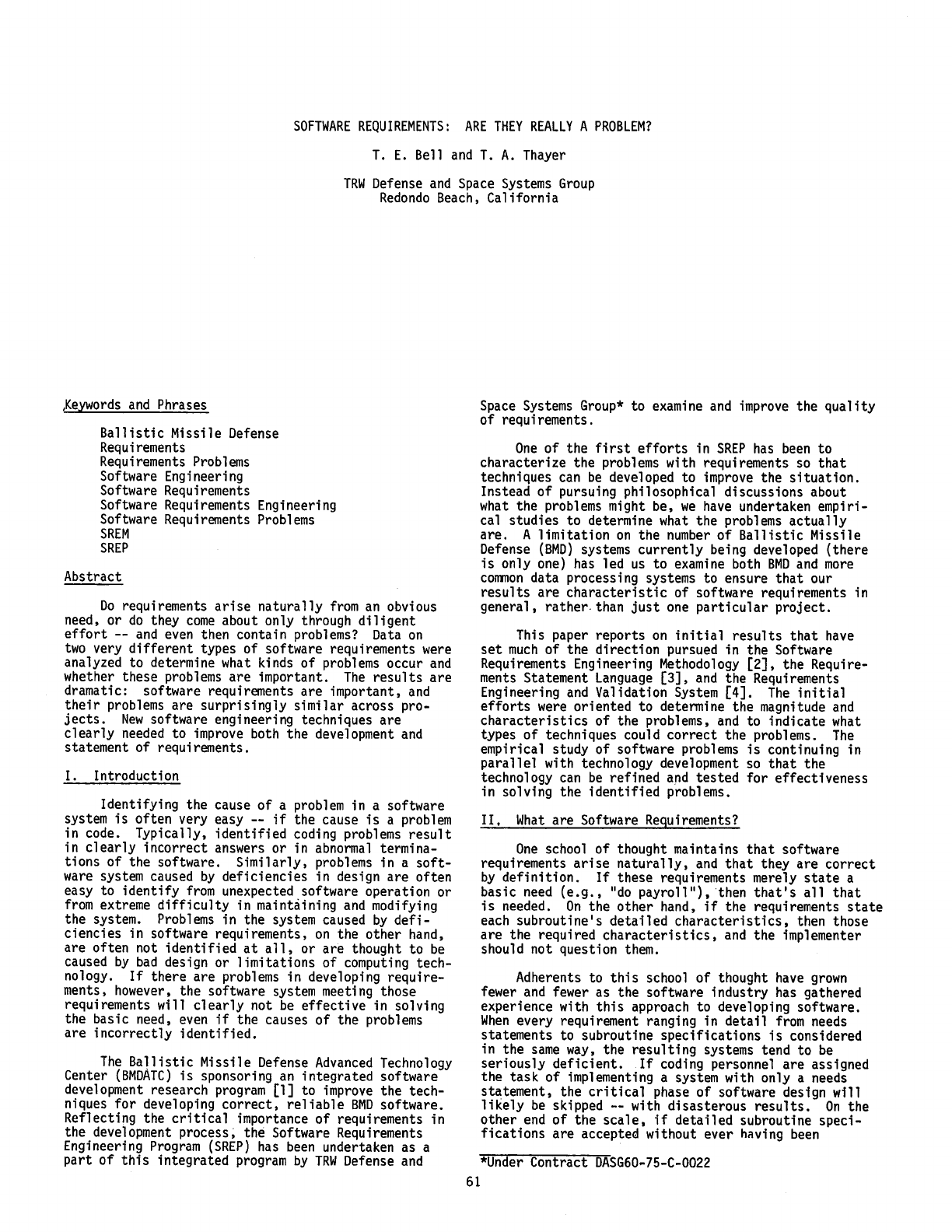 <p>SOFTWARE REQUIREMENTS: ARE THEY REALLY A PROBLEM?</p><p>T. E. Bell and T. A. Thayer</p><p>TRW Defense and Space Systems Group</p><p>Redondo Beach, California</p><p>,Keywords and Phrases</p><p>Ball ist ic Missile Defense</p><p>Requirements</p><p>Requirements Problems</p><p>Software Engineering</p><p>Software Requirements</p><p>Software Requirements Engineering</p><p>Software Requirements Problems</p><p>SREM</p><p>SREP</p><p>Abstract</p><p>Do requirements arise naturally from an obvious</p><p>need, or do they come about only through diligent</p><p>effort -- and even then contain problems? Data on</p><p>two very different types of software requirements were</p><p>analyzed to determine what kinds of problems occur and</p><p>whether these problems are important. The results are</p><p>dramatic: software requirements are important, and</p><p>their problems are surprisingly similar across pro-</p><p>jects. New software engineering techniques are</p><p>clearly needed to improve both the development and</p><p>statement of requirements.</p><p>I. Introduction</p><p>Identifying the cause of a problem in a software</p><p>system is often very easy -- i f the cause is a problem</p><p>in code. Typically, identified coding problems result</p><p>in clearly incorrect answers or in abnormal termina-</p><p>tions of the software. Similarly, problems in a soft-</p><p>ware system caused by deficiencies in design are often</p><p>easy to identify from unexpected software operation or</p><p>from extreme di f f icul ty in maintaining and modifying</p><p>the system. Problems in the system caused by defi-</p><p>ciencies in software requirements, on the other hand,</p><p>are often not identified at a l l , or are thought to be</p><p>caused by bad design or limitations of computing tech-</p><p>nology. I f there are problems in developing require-</p><p>ments, however, the software system meeting those</p><p>requirements wil l clearly not be effective in solving</p><p>the basic need, even i f the causes of the problems</p><p>are incorrectly identified.</p><p>The Ball ist ic Missile Defense Advanced Technology</p><p>Center (BMDATC) is sponsoring an integrated software</p><p>development research program I l l to improve the tech-</p><p>niques for developing correct, reliable BMD software.</p><p>Reflecting the cr i t ical importance of requirements in</p><p>the development process; the Software Requirements</p><p>Engineering Program (SREP) has been undertaken as a</p><p>part of this integrated program by TRW Defense and</p><p>Space Systems Group* to examine and improve the quality</p><p>of requirements.</p><p>One of the f i r s t efforts in SREP has been to</p><p>characterize the problems with requirements so that</p><p>techniques can be developed to improve the situation.</p><p>Instead of pursuing philosophical discussions about</p><p>what the problems might be, we have undertaken empiri-</p><p>cal studies to determine what the problems actually</p><p>are. A limitation on the number of Ball ist ic Missile</p><p>Defense (BMD) systems currently being developed (there</p><p>is only one) has led us to examine both BMD and more</p><p>common data processing systems to ensure that our</p><p>results are characteristic of software requirements in</p><p>general, rather than just one particular project.</p><p>This paper reports on in i t ia l results that have</p><p>set much of the direction pursued in the Software</p><p>Requirements Engineering Methodology [2], the Require-</p><p>ments Statement Language [3], and the Requirements</p><p>Engineering and Validation System [4]. The in i t ia l</p><p>efforts were oriented to determine the magnitude and</p><p>characteristics of the problems, and to indicate what</p><p>types of techniques could correct the problems. The</p><p>empirical study of software problems is continuing in</p><p>parallel with technology development so that the</p><p>technology can be refined and tested for effectiveness</p><p>in solving the identified problems.</p><p>I I , What are Software Requirements?</p><p>One school of thought maintains that software</p><p>requirements arise naturally, and that they are correct</p><p>by definition. I f these requirements merely state a</p><p>basic need (e.g., "do payrol l"), then that's all that</p><p>is needed. On the other hand, i f the requirements state</p><p>each subroutine's detailed characteristics, then those</p><p>are the required characteristics, and the implementer</p><p>should not question them.</p><p>Adherents to this school of thought have grown</p><p>fewer and fewer as the software industry has gathered</p><p>experience with this approach to developing software.</p><p>When every requirement ranging in detail from needs</p><p>statements to subroutine specifications is considered</p><p>in the same way, the resulting systems tend to be</p><p>seriously deficient. I f coding personnel are assigned</p><p>the task of implementing a system with only a needs</p><p>statement, the cr i t ical phase of software design will</p><p>l ikely be skipped -- with disasterous results. On the</p><p>other end of the scale, i f detailed subroutine speci-</p><p>fications are accepted without ever having been</p><p>*Under Contract DASG60-75-C-O022</p><p>61</p><p>examined for correctness, the resulting software wi l l</p><p>probably fa i l to complete execution normally, much</p><p>less produce correct results.</p><p>The evolution of approaches for the development</p><p>of software systems has generally paralleled the</p><p>evolution of ideas for the implementation of code.</p><p>Over the last ten years more structure and discipline</p><p>have been adopted, and practicioneers have concluded</p><p>that a top-down approach is superior to the bottom-up</p><p>approach of the past. The Mil i tary Standard set MIL-</p><p>STD 490/483 recognized this newer approach by speci-</p><p>fying a system requirements document, a "design-to"</p><p>requirements document that is created in response to</p><p
