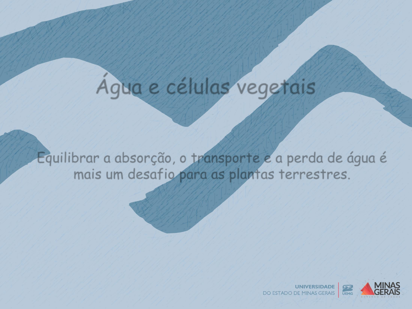<p>Água e células vegetais</p><p>5º período – Licenciatura em Ciências Biológicas</p><p>Profª Reisila Migliorini Mendes</p><p>Equilibrar a absorção, o transporte e a perda de água é</p><p>mais um desafio para as plantas terrestres.</p><p>É o ramo da botânica que estuda os processos e as funções do</p><p>vegetal, bem como as respostas das plantas às variações do meio</p><p>ambiente.</p><p>Processo: é qualquer sequência natural e contínua de acontecimentos</p><p>que possa ser observada nas plantas.</p><p>Função: é a atividade natural de uma parte qualquer do vegetal, isto é,</p><p>o papel desempenhado por um órgão, tecido, célula, organela ou</p><p>constituinte químico da planta.</p><p>Fisiologia Vegetal</p><p>Recurso mais abundante e mais limitante para o</p><p>desenvolvimento e sobrevivência das plantas</p><p>Estrutura da água e propriedades exclusivas</p><p>decorrentes dessa estrutura</p><p>Molécula polar Ligação de hidrogênio (4)</p><p>Propriedades decorrentes da ...</p><p>Polaridade: Adesão, Capilaridade, Alto poder de dissolução</p><p>Ligações de hidrogênio: Coesão, Alto calor específico, Alto calor</p><p>de vaporização, tensão superficial</p><p>../../../../../Videos/Untitled Video.mp4</p><p>A água desempenha papel-chave na fisiologia vegetal</p><p>Funções nos seres vivos ...</p><p>Reações químicas</p><p>Pelo alto calor específico Equilíbrio térmico</p><p>Pelo alto calor de vaporização: Auxilia na diminuição da temperatura do corpo</p><p>da planta</p><p>Pela capilaridade Transporta seiva bruta</p><p>Pelo alto poder de dissolução</p><p>Transporte de substâncias</p><p>Favorece a ocorrência</p><p>Reagente ou produto</p><p>Impede variações bruscas</p><p>Temperatura adequada</p><p>para reações</p><p>Tensão superficial</p><p>Energia necessária para aumentar a área de superfície de interface gás-líquido.</p><p>Adesão + Coesão + tensão superficial = Capilaridade</p><p>A célula vegetal</p><p>Distribuição da água nas</p><p>células vegetais:</p><p>- Parede celular: 50%</p><p>- Protoplasto: 95%</p><p>- Vacúolo: 98%</p><p>A célula vegetal</p><p>Água para transporte:</p><p>• Citoplasma</p><p>• Retículo endoplasmático</p><p>• Complexo de Golgi</p><p>• Vacúolo de suco celular</p><p>• Carioplasma</p><p>• ...</p><p>Água para reação químicas:</p><p>• Citoplasma</p><p>• Núcleo</p><p>• Mitocôndria</p><p>• Cloroplastos</p><p>• Complexo de Golgi</p><p>• Glioxissomo</p><p>• ...</p><p>Desafio:</p><p>O teor de água nas mitocôndrias é cerca de 60% maior que nos vacúolos, porém o</p><p>vacúolo é muito mais fluído que a mitocôndria. Você sabe explicar por quê?</p><p>Pressão de turgor</p><p>Parede celular</p><p>Pressão</p><p>hidrostática</p><p>interna</p><p>Expansão celular</p><p>Abertura estomática</p><p>Transporte no floema</p><p>Rigidez e estabilidade dos</p><p>tecidos sem lignina</p><p>Fotossíntese x Transpiração</p><p>1 molécula de CO2</p><p>400 moléculas de H2O</p><p>O gradiente motor da perda de água nas folhas é muito maior que a</p><p>absorção de CO2.</p><p>Difusão e Osmose</p><p>Os processos celulares dependem do transporte de moléculas para dentro e para fora da célula.</p><p>Difusão</p><p>Movimento espontâneo de</p><p>substâncias de regiões de</p><p>concentração mais alta para regiões</p><p>de concentração mais baixa.</p><p>Osmose</p><p>Movimento de difusão de água por</p><p>meio de uma barreira seletivamente</p><p>permeável.</p><p>Concentração uniforme de moléculas = entropia energia livre</p><p>Difusão</p><p>Osmose</p><p>Aquaporinas</p><p>São proteínas da membrana plasmática que formam canais seletivos à água através da membrana e facilitam o movimento da água</p><p>para dentro das células vegetais.</p><p>Forças de embebição</p><p>Quebra da</p><p>dormência</p><p>fisiológica</p><p>Reativação de</p><p>organelas e</p><p>quebra</p><p>macromoléculas</p><p>preexistentes</p><p>Retomada do</p><p>crescimento</p><p>do embrião</p><p>Desidratação</p><p>para abertura</p><p>das valvas</p><p>Reidratação para</p><p>início do processo de</p><p>decomposição</p><p>É um tipo especial de difusão em que o movimento da água acorre a favor</p><p>do gradiente de potencial hídrico. Entretanto, as forças responsáveis</p><p>pela retenção da água pelas macromoléculas são microcapilares e</p><p>superfícies - ligações de hidrogênio e forças eletrostáticas.</p><p>Forças de embebição</p><p>É resultante da atração eletrostática entre moléculas de água e as</p><p>superfícies dos coloides - Adsorção</p><p>Consumo de água no</p><p>ciclo de vida da planta</p><p>Potencial hídrico</p><p>É a medida de energia livre da água por unidade de volume (Pascal). Governa o transporte através de membranas, o continnum solo-</p><p>planta-atmosfera e é utilizado como medida de saúde da planta</p><p>Fatores que contribuem para o potencial hídrico celular</p><p>• Concentração - s (potencial osmótico)</p><p>Acúmulo de soluto no citoplasma ou vacúolo</p><p>• Pressão -p (potencial hidrostático)</p><p>Força que a parede celular exerce sobre a membrana, quando a célula está túrgida.</p><p>• Gravidade - g s + p + g =</p><p>A água move-se da região de maior potencial (maior energia livre)</p><p>para a região de menor potencial (menor energia livre).</p><p>O que determina o deslocamento da água na planta é o</p><p>gradiente de potencial hídrico...</p><p>Célula A: -0,4 + 0,1 = -0,3</p><p>Célula B: -0,7 + 0,5 = -0,2</p><p>ΨB > ΨA, logo a direção da água é da célula B para a célula A</p><p>A água limita a produtividade tanto de ecossistemas</p><p>agrícolas quanto de ecossistemas naturais.</p><p>Produtividade de vários ecossistemas naturais</p><p>em função da precipitação anual, estimada</p><p>pelo acúmulo líquido de matéria orgânica</p><p>acima do solo durante o crescimento e a</p><p>reprodução. (