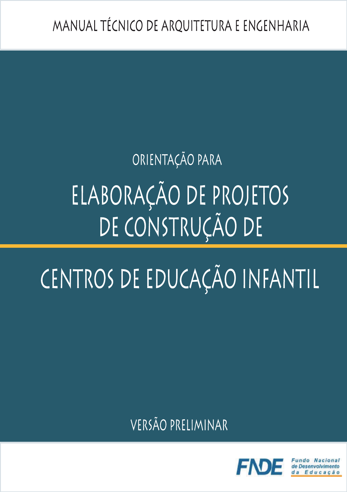<p>Ministério</p><p>da Educação</p><p>PRESIDENTE DA REPÚBLICA</p><p>MINISTRO DA EDUCAÇÃO</p><p>COORDENADOR GERAL DE INFRAESTRUTURA EDUCACIONAL</p><p>PRESIDENTE DO FNDE</p><p>DIRETOR DE PROGRAMAS E PROJETOS EDUCACIONAIS</p><p>-ESTRUTURA EDUCACIONAL</p><p>ELABORAÇÃO</p><p>Karen Gama Müller</p><p>Luiz Paulo Ferrero Filho</p><p>Débora Carvalho Diniz</p><p>Ministério Da Educação</p><p>FNDE - Fundo Nacional de Desenvolvimento da Educação</p><p>�������� �</p><p>��</p><p>���</p><p>����</p><p>��</p><p>�������� �</p><p>��</p><p>��</p><p>�������� �</p><p>����</p><p>������</p><p>�������</p><p>��</p><p>�����������</p><p>�</p><p>����������</p><p>BRASÍLIA . 2009</p><p>�������</p><p>��</p><p>������ �</p><p>��������</p><p>��</p><p>���������� �</p><p>O Programa Nacional de Reestruturação e Aparelhagem</p><p>da Rede Escolar Pública de Educação Infantil – PROINFÂNCIA</p><p>– surge com a necessidade de implementação das metas, no</p><p>que tange à Educação Infantil, definidas no Plano de</p><p>Desenvolvimento da Educação (PDE), elaborado pelo</p><p>Ministério da Educação.</p><p>O PROINFÂNCIA, embasado nos prece i tos</p><p>constitucionais do art. 208, inc. IV e art. 227 – Constituição</p><p>Federal de 1988, visa promover ações supletivas e</p><p>redistributivas para a correção progressiva das disparidades</p><p>de acesso, garantia de um padrão mínimo de qualidade de</p><p>ensino e melhoria da infra-estrutura da rede física escolar</p><p>existente no município.</p><p>O recurso financeiro utilizado pelo Programa tem caráter</p><p>de despesa de investimento do Governo Federal para a</p><p>implementação da ação de construção de escolas e</p><p>fornecimento de mobiliário e equipamento.</p><p>����</p><p>O objetivo do programa PROINFÂNCIA é promover o</p><p>atendimento à clientela de 0 meses a 06 anos que utiliza</p><p>instalações físicas precárias ou ofertar novas vagas, por meio</p><p>da construção de unidades escolares. A demanda será</p><p>distribuída conforme tabela etária definida no quadro a seguir:</p><p>Módulo Idade Atendida</p><p>Creche I 0 meses a 1 ano</p><p>Creche II 1 a 2 anos</p><p>Creche III 2 a 4 anos</p><p>Pré-escola 4 a 6 anos</p><p>��</p><p>�������</p><p>1. Objetivos do Manual</p><p>2. Premissas para Elaboração do Projeto</p><p>2.1. Demanda a ser Atendida</p><p>2.2. Programa de Necessidades</p><p>2.3. Organização Espacial</p><p>2.4. Características e Dimensionamento de Ambientes</p><p>2.4.1. Recomendações Gerais</p><p>2.4.2. Ambientes Sócio-pedagógicos</p><p>2.4.2.1.</p><p>2.4.2.2.</p><p>2.5. Acessibilidade</p><p>2.6. Padrão Mínimo Construtivo</p><p>2.6.1. Coberturas</p><p>2.6.2. Forros</p><p>2.6.3. Esquadrias</p><p>2.6.4. Ferragens</p><p>2.6.5. Revestimentos</p><p>2.6.6. Pintura</p><p>2.6.7. Divisórias</p><p>2.6.8. Pisos</p><p>2.6.9. Instalações Elétricas</p><p>2.6.10. Instalações Hidráulicas e Sanitárias</p><p>2.6.11. Quadros</p><p>2.6.12. Alvenaria</p><p>Sala para Repouso</p><p>Sala para Atividades</p><p>2.4.2.3. Sala Multiuso</p><p>2.4.2.4. Fraldário</p><p>2.4.2.5. Lactário</p><p>2.4.2.6. Solário</p><p>2.4.2.7. Pátio Coberto</p><p>2.4.2.8. Área de Recreação Descoberta</p><p>2.4.2.9. Refeitório</p><p>2.4.2.10. Banheiros</p><p>2.4.2.11. Área Externa</p><p>2.4.3. Ambientes Administrativos</p><p>2.4.3.1. Recepção</p><p>2.4.3.2. Secretaria</p><p>2.4.3.3. Almoxarifado</p><p>2.4.3.4. Sala de Professores</p><p>2.4.3.5. Sala de Direção e Coordenação</p><p>2.4.4. Ambientes de Serviços</p><p>2.4.4.1. Cozinha</p><p>2.4.4.2. Despensa</p><p>2.4.4.3. Lavanderia</p><p>2.4.4.4. Depósito de Material de Limpeza</p><p>2.4.4.5. Depósito de Lixo</p><p>05</p><p>06</p><p>07</p><p>08</p><p>10</p><p>12</p><p>12</p><p>14</p><p>14</p><p>14</p><p>16</p><p>17</p><p>18</p><p>19</p><p>20</p><p>20</p><p>20</p><p>21</p><p>22</p><p>23</p><p>23</p><p>23</p><p>23</p><p>24</p><p>24</p><p>24</p><p>24</p><p>25</p><p>26</p><p>26</p><p>26</p><p>27</p><p>28</p><p>28</p><p>29</p><p>30</p><p>31</p><p>32</p><p>33</p><p>34</p><p>34</p><p>35</p><p>35</p><p>36</p><p>36</p><p>����</p><p>�������</p><p>2.7. Elementos Padronizados</p><p>2.7.1. Castelo D’água</p><p>2.7.2. Pórtico de Entrada</p><p>2.7.3. Elemento Cúbico (Parquinho)</p><p>2.7.4. Mastro de Bandeiras</p><p>2.7.5. Portas</p><p>2.7.6. Bancos</p><p>2.7.7. Cobogós</p><p>2.7.8. Calha de Piso</p><p>2.7.9. Definição de Cores</p><p>2.8. Conforto Ambiental</p><p>2.9. Uso Consciente dos Recursos Naturais</p><p>3. Elementos para Representação de Projeto</p><p>3.1. Planta de Situação do Terreno</p><p>3.2. Planta de Locação</p><p>3.3. Planta Baixa da Proposta</p><p>3.4. Planta de Cobertura</p><p>3.5. Cortes</p><p>3.6. Elevações</p><p>3.7. Perspectivas Internas e Externas</p><p>3.8. Planilha Orçamentária</p><p>3.9. Cronograma Físico-financeiro</p><p>3.10. Memorial Descritivo e Especificações Técnicas</p><p>3.11. Projeto de Estruturas e Fundações</p><p>3.12. Projeto de Instalações Hidro-sanitárias</p><p>3.13. Projeto de Instalações Elétricas</p><p>3.14. Projeto de Rede Lógica</p><p>3.15. Projeto de Combate a Incêndios</p><p>3.16. Projeto de SPDA</p><p>4. Características do Terreno</p><p>4.1. Documento de Propriedade de Terreno</p><p>4.2. Relatório de Vistoria de Terreno</p><p>5. Viabilidade Econômica e Financeira</p><p>7. Bibliografia</p><p>8. Anexos</p><p>37</p><p>37</p><p>39</p><p>40</p><p>41</p><p>42</p><p>48</p><p>49</p><p>50</p><p>51</p><p>52</p><p>56</p><p>57</p><p>58</p><p>59</p><p>61</p><p>63</p><p>64</p><p>65</p><p>65</p><p>66</p><p>67</p><p>68</p><p>68</p><p>70</p><p>71</p><p>72</p><p>72</p><p>72</p><p>73</p><p>76</p><p>77</p><p>81</p><p>82</p><p>83</p><p>�</p><