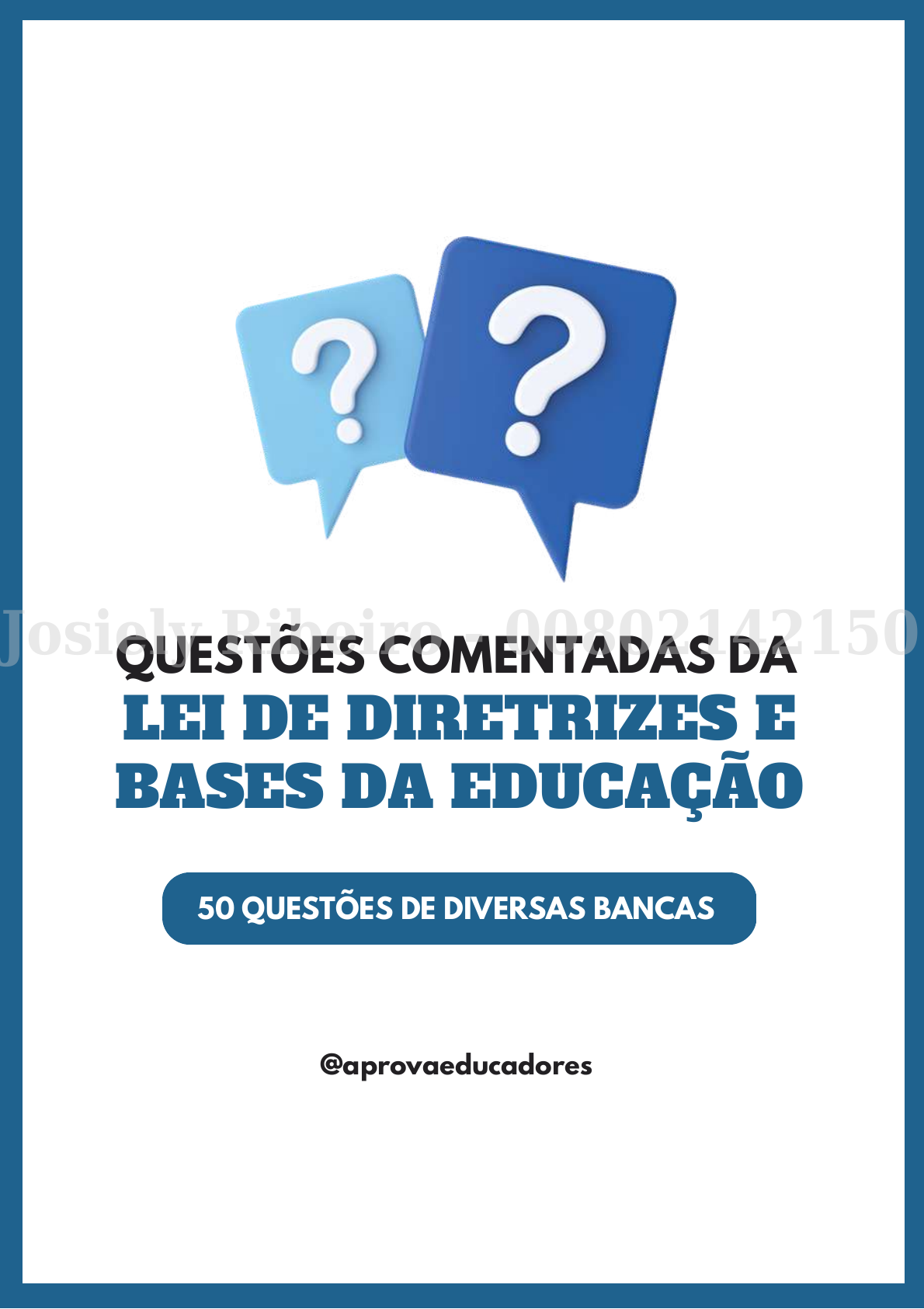 <p>50 QUESTÕES DE DIVERSAS BANCAS</p><p>LEI DE DIRETRIZES E</p><p>BASES DA EDUCAÇÃO</p><p>QUESTÕES COMENTADAS DA</p><p>@aprovaeducadores</p><p>Josiely Ribeiro - 00802142150</p><p>1) AMEOSC - 2021 | A LDB - Lei de Diretrizes e Bases</p><p>da Educação Brasileira trata, entre outras questões,</p><p>das incumbências dos docentes, sendo uma delas a</p><p>de:</p><p>A) Escolher os representantes de cada setor para</p><p>participar da elaboração da proposta pedagógica da</p><p>escola.</p><p>B) Determinar sua própria carga horária de trabalho e</p><p>seu calendário de dias letivos.</p><p>C) Colaborar com as atividades de articulação da escola</p><p>com as famílias e a comunidade.</p><p>D) Delegar a outros o zelo pela aprendizagem do aluno.</p><p>2) FUNDATEC - 2023 | De acordo com a LDBEN,</p><p>assinale a alternativa correta quanto às</p><p>incumbências dos estabelecimentos de ensino.</p><p>A) Assumir o transporte escolar dos alunos de rede</p><p>estadual e/ou municipal.</p><p>B) Velar pelo cumprimento do plano de trabalho de cada</p><p>docente.</p><p>C) Autorizar e credenciar o Projeto Político-pedagógico</p><p>junto à União.</p><p>D) Elaborar e autorizar o Plano Global de Educação junto</p><p>ao Estado.</p><p>E) Baixar normas oficiais para o seu sistema de ensino.</p><p>3) FUNDATEC - 2023 | De acordo com a Lei de</p><p>Diretrizes e Bases da Educação Nacional (LDBEN),</p><p>assinale a alternativa correta quanto ao Direito à</p><p>Educação e ao Dever de Educar.</p><p>A) Direito à educação básica obrigatória e gratuita dos 4</p><p>(quatro) aos 17 (dezessete) anos de idade.</p><p>B) A educação básica obrigatória e gratuita está</p><p>organizada em pré-escola, ensino fundamental, ensino</p><p>médio e ensino superior.</p><p>C) Direito à educação infantil gratuita às crianças até os</p><p>seis anos de idade.</p><p>D) Acesso público e gratuito aos ensinos fundamental e</p><p>médio para aqueles que concluíram até os 16 anos.</p><p>E) Atendimento ao educando, no ensino fundamental –</p><p>anos iniciais – por meio de programas suplementares de</p><p>material didático-escolar, transporte, alimentação e</p><p>assistência à saúde.</p><p>4) CESGRANRIO - 2022 | As bases legais da</p><p>educação nacional são a Constituição da República</p><p>e, em especial, a Lei de Diretrizes e Bases da</p><p>Educação Nacional (LDB), Lei n° 9.394/1996, que</p><p>sofreu atualizações ao longo dos anos.</p><p>A LDB, quando se refere à Educação Profissional e</p><p>Tecnológica, em nova redação pela Lei n°</p><p>11.741/2008, em seu Art. 39, preconiza que a</p><p>educação profissional e tecnológica se integra aos</p><p>diferentes níveis e modalidades de educação e às</p><p>dimensões do trabalho, da ciência e da tecnologia.</p><p>Para tanto, a educação profissional e tecnológica</p><p>abrange os cursos de:</p><p>A) níveis médio e fudamental</p><p>B) nível fundamental e de pós-graduação</p><p>C) formação inicial e Educação de Jovens e Adultos</p><p>(EJA)</p><p>D) graduação e pós-graduação</p><p>E) Educação de Jovens e Adultos (EJA) e qualificação</p><p>profissional</p><p>5) IMPARH - 2022 | De acordo com a Lei nº 14.121/21,</p><p>conhecida como “Lei da Educação Bilíngue na LDB”,</p><p>é correto afirmar:</p><p>A) A Educação bilíngue para surdos deve ser ofertada a</p><p>partir dos 4 anos na educação infantil.</p><p>B) O ensino bilíngue terá como um de seus objetivos</p><p>proporcionar aos surdos a recuperação de suas</p><p>memórias históricas, a reafirmação de suas identidades e</p><p>especificidades e a valorização de sua língua e cultura.</p><p>C) Entende-se por “Educação bilíngue” apenas a</p><p>modalidade de educação escolar ofertada em “escolas</p><p>de surdos”, não considerando a escolarização ofertada</p><p>em “escolas comuns”.</p><p>D) A modalidade de Educação bilíngue dispensa o apoio</p><p>do Atendimento Educacional Especializado, visto que</p><p>essa é uma estratégia para apoio à escola regular.</p><p>Josiely Ribeiro - 00802142150</p><p>https://questoes.grancursosonline.com.br/concursos/avanca-sp</p><p>https://questoes.grancursosonline.com.br/concursos/fundatec</p><p>https://questoes.grancursosonline.com.br/concursos/fundatec</p><p>https://questoes.grancursosonline.com.br/concursos/cesgranrio</p><p>6) Avanca SP - 2022 | Entre os princípios pelos quais</p><p>o Ensino deverá ser ministrado, de acordo com a Lei</p><p>de Diretrizes e Bases da Educação - LDB, encontra-</p><p>se o RESPEITO:</p><p>A) do ensino público em estabelecimentos oficiais.</p><p>B) das pessoas surdas, surdo-cegas e com deficiência</p><p>auditiva.</p><p>C) à liberdade e apreço à tolerância.</p><p>D) do ensino público, na forma desta Lei e da legislação</p><p>dos sistemas de ensino.</p><p>E) da experiência extraescolar.</p><p>7) GUALIMP - 2022 | Várias modificações, no decorrer</p><p>dos anos, foram feitas à seção de Currículo Escolar</p><p>previsto na LDB. Estão vigentes as seguintes</p><p>especificações, EXCETO:</p><p>A) O ensino da arte, especialmente em suas expressões</p><p>regionais, constituirá componente curricular obrigatório</p><p>da educação básica.</p><p>B) A educação física, integrada à proposta pedagógica</p><p>da escola, é componente curricular obrigatório da</p><p>educação básica, sendo sua prática facultativa ao aluno</p><p>que cumpra jornada de trabalho igual ou superior a seis</p><p>horas.</p><p>C) No currículo do ensino fundamental, a partir do quinto</p><p>ano, será ofertada a língua inglesa.</p><p>D) A educação alimentar e nutricional será incluída entre</p><p>os temas transversais.</p><p>8) CETREDE - 2022 | Qual a finalidade da Educação</p><p>de acordo com a Lei de Diretrizes e Bases da</p><p>Educação Nacional (LDB) – Lei nº 9.394, de 20 de</p><p>dezembro de 1996?</p><p>A) O pleno desenvolvimento do educando, seu preparo</p>
