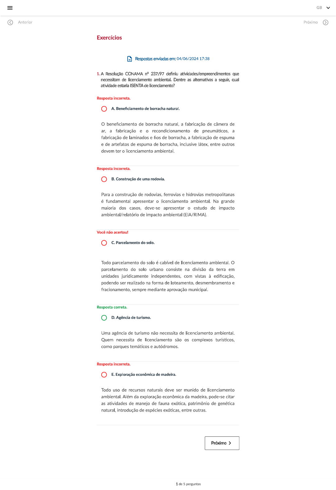 <p>GB Anterior Próximo > Exercícios Respostas enviadas em: 04/06/2024 17:38 1. A Resolução CONAMA n° 237/97 definiu atividades/empreendimentos que necessitam de licenciamento ambiental. Dentre as alternativas a seguir, qual atividade estaria ISENTA de licenciamento? Resposta incorreta. A. Beneficiamento de borracha natural. beneficiamento de borracha natural, a fabricação de câmera de ar, a fabricação e o recondicionamento de pneumáticos, a fabricação de laminados e fios de a fabricação de espuma e de artefatos de espuma de borracha, inclusive entre outros devem ter o licenciamento ambiental. Resposta incorreta. B. Construção de uma rodovia. Para a construção de rodovias, ferrovias e hidrovias metropolitanas é fundamental apresentar o licenciamento ambiental. Na grande maioria dos casos, deve-se apresentar o estudo de impacto ambiental/relatório de impacto ambiental (EIA/RIMA). Você não acertou! C. Parcelamento do solo. Todo parcelamento do solo é cabível de licenciamento ambiental. parcelamento do solo urbano consiste na divisão da terra em unidades juridicamente independentes, com vistas à edificação, podendo ser realizado na forma de loteamento, desmembramento e fracionamento, sempre mediante aprovação municipal. Resposta correta. D. Agência de turismo. Uma agência de turismo não necessita de licenciamento ambiental. Quem necessita de licenciamento são os complexos turísticos, como parques temáticos e autódromos. Resposta incorreta. E. Exploração econômica de madeira. Todo uso de recursos naturais deve ser munido de licenciamento ambiental. Além da exploração econômica da madeira, pode-se citar as atividades de manejo de fauna exótica, patrimônio de genética natural, introdução de espécies exóticas, entre outras. Próximo > 1 de perguntas</p><p>GB < Anterior Próximo 1 de 5 perguntas</p>