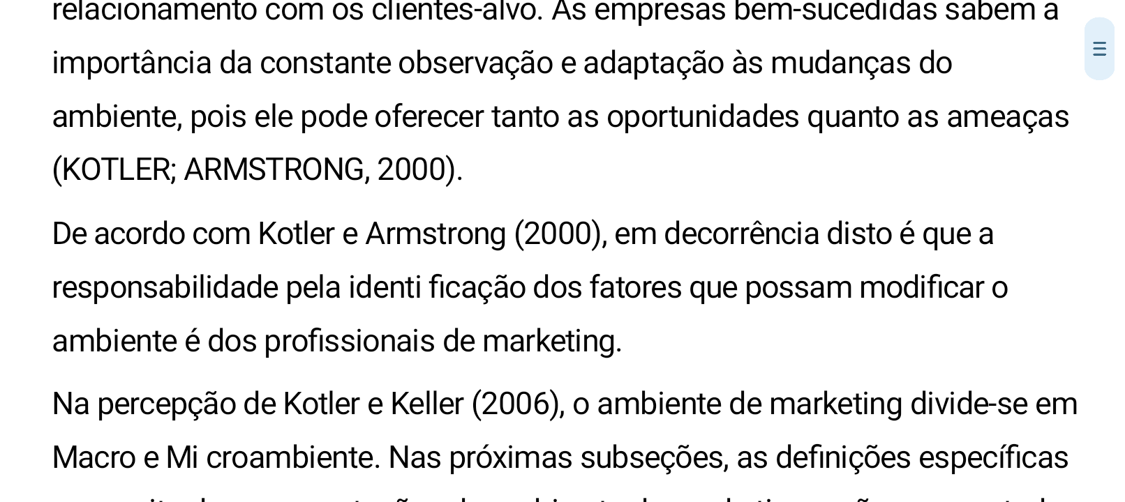 <p>relacionamento com os clientes-alvo. As empresas bem-sucedidas sabem a importância da constante observação e adaptação às mudanças do ambiente, pois ele pode oferecer tanto as oportunidades quanto as ameaças (KOTLER; ARMSTRONG, 2000). De acordo com Kotler e Armstrong (2000), em decorrência disto é que a responsabilidade pela identi ficação dos fatores que possam modificar o ambiente é dos profissionais de marketing. Na percepção de Kotler e Keller (2006), o ambiente de marketing divide-se em Macro e Mi croambiente. Nas próximas subseções, as definições específicas</p>