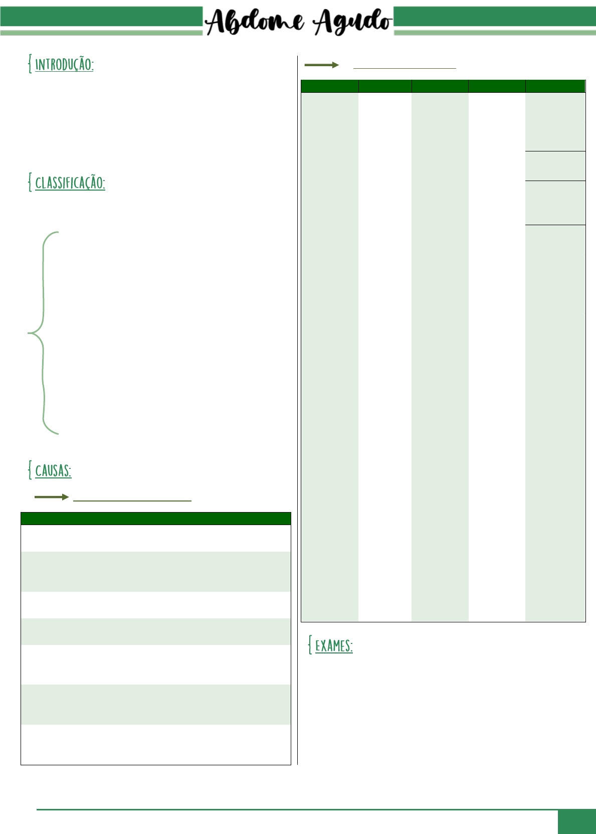 <p>1 ❙❘❙❙❘❙❚ Ana Beatriz Bandeira Fragoso | TURMA 3 ❚❙❘❙❙❙</p><p>• Síndrome clínica caracterizada por dor</p><p>abdominal que se instala no período de algumas</p><p>horas;</p><p>• Requer tratamento clínico ou cirúrgico de</p><p>emergência.</p><p>• Sua classificação mais utilizada é de acordo com</p><p>seu processo desencadeante:</p><p>⎯ Obstrutivo: obstáculo mecânico ou</p><p>funcional que leve a interrupção do</p><p>conteúdo intestinal. Ex.: Hérnia</p><p>estrangulada;</p><p>⎯ Perfurativo: ocorre em virtude de</p><p>perfuração das vísceras ocas do trato</p><p>gastrointestinal;</p><p>⎯ Inflamatório: Consequência de processos</p><p>inflamatórios. Ex.: Apendicite aguda;</p><p>⎯ Vascular: redução ou ausência de perfusão</p><p>tissular intestinal. Ex.: Embolia da artéria</p><p>mesentérica superior;</p><p>⎯ Ginecológico.</p><p>Quanto a classificação patológica:</p><p>INFLAMATÓRIO OBSTRUTIVO PERFURATIVO VASCULAR GINECOLÓGICO</p><p>Apendicite</p><p>Aguda</p><p>Corpo Estranho Infarto</p><p>intestinal</p><p>Rotura do</p><p>baço</p><p>Gravidez</p><p>tubária</p><p>Colicistite</p><p>Aguda</p><p>Doença</p><p>Inflamatória</p><p>Intestinal</p><p>Aneurisma</p><p>de aorta</p><p>abdominal</p><p>Rotura de</p><p>tumor</p><p>hepático</p><p>Cisto de</p><p>ovário</p><p>hemorrágico</p><p>Colangite</p><p>Aguda</p><p>Hérnia de</p><p>Parede abdominal</p><p>Úlcera</p><p>perfurada</p><p>Rotura de</p><p>aneurisma</p><p>DIP</p><p>Diverticulite</p><p>Colônica</p><p>Hérnia Interna Trauma Rotura</p><p>uterina</p><p>Diverticulite</p><p>de Mackel</p><p>Tumor Doença</p><p>inflamatória</p><p>intestinal</p><p>Rotura de</p><p>cisto de</p><p>ovário</p><p>DIP: Doença</p><p>Inflamatória</p><p>Pélvica</p><p>Fecaloma Corpo</p><p>estranho</p><p>Pancreatite</p><p>Aguda</p><p>Úlcera Perfurada</p><p>e Trauma</p><p>Obstrutivo</p><p>Quanto a localização da dor:</p><p>QSD QSE QID QIE DIFUSO</p><p>Hepatite</p><p>aguda</p><p>Pancreatite</p><p>aguda</p><p>Apendicite</p><p>aguda</p><p>Obstrução</p><p>intestinal</p><p>Pancreatite</p><p>aguda</p><p>Pancreatite</p><p>Aguda</p><p>Úlcera</p><p>duodenal</p><p>Obstrução</p><p>intestinal</p><p>Diverticulite Obstrução</p><p>intestinal</p><p>Colangite Úlcera</p><p>gástrica</p><p>Diverticulite Gravidez</p><p>ectópica</p><p>Dissecção de</p><p>aorta</p><p>Colelitíase IAM Gravidez</p><p>ectópica</p><p>Endometriose Apendicite</p><p>aguda (fase</p><p>inicial)</p><p>Colicistite</p><p>aguda</p><p>Pericardite Endometriose Hérnia Infarto</p><p>mesentérico</p><p>Abcesso</p><p>hepático</p><p>Pneumonia Hérnia Adenite</p><p>mesentérica</p><p>Ruptura de</p><p>aneurisma de</p><p>aorta</p><p>abdominal</p><p>Pneumonia Abcesso</p><p>esplênico</p><p>Doença</p><p>intestinal</p><p>inflamatória</p><p>Litíase renal Crise</p><p>falcêmica</p><p>Úlcera</p><p>Duodenal</p><p>Infarto</p><p>esplênico</p><p>Síndrome do</p><p>cólon</p><p>irritável</p><p>Doença</p><p>intestinal</p><p>inflamatória</p><p>Hepatopatia</p><p>por ICC</p><p>Ruptura</p><p>esplênica</p><p>Litíase renal Torsão de</p><p>ovário</p><p>Herpes</p><p>zoster</p><p>Adenite</p><p>mesentérica</p><p>DIP</p><p>IAM Diverticulite</p><p>de Meckel</p><p>Abcesso</p><p>tubo-</p><p>ovariano</p><p>Pericardite Torsão de</p><p>ovário</p><p>Abcesso do</p><p>pssoas</p><p>Apendicite</p><p>retrocecal</p><p>DIP</p><p>Abcesso</p><p>tubo-</p><p>ovariano</p><p>Abcesso dos</p><p>psoas</p><p>• Radiografia: obstrução intestinal, perfuração de</p><p>vísceras ocas (pneumoperitôneo);</p><p>• USG: emergências ginecológicas, litíase na via</p><p>biliar, colecistite, dilatação de vias biliares, litíase</p><p>na via urinária, apendicite;</p><p>2 ❙❘❙❙❘❙❚ Ana Beatriz Bandeira Fragoso | TURMA 3 ❚❙❘❙❙❙</p><p>• TC: diverticulite, pancreatite aguda, apendicite,</p><p>infarto omental, apendagite epiplóica, avaliação</p><p>vascular, aneurisma, litíase via urinária.</p><p>• Distribuição de gases intestinais;</p><p>• Posicionamento das imagens dos órgãos</p><p>sólidos;</p><p>• Presença de calcificações patológicas e ascite;</p><p>Figura 1 – Pneumoperitônio, bolha de ar</p><p>entre o diafragma e o fígado.</p><p>Figura 2 – Alças intestinais, abdômen agudo</p><p>obstrutivo pós operatório</p><p>• Pneumoperitônio – perfuração de víscera oca;</p><p>• Ausência de gás na ampola retal – obstrução;</p><p>• Distensão de alça intestinal;</p><p>• Aça sentinela – alça fixa;</p><p>• Volvo ou sinal do “grão de café” – torção de</p><p>alça intestinal;</p><p>• Apagamento das lojas renais – alterações</p><p>retroperitôneo;</p><p>• Velamento da borda externa do musculo psoas</p><p>– alteração do retroperitôneo.</p><p>• Protocolos sem e com uso de contraste iodado,</p><p>assim como número de fases após contraste EV,</p><p>dependem da suspeita clínica;</p><p>• Cólica renal – sem contraste;</p><p>• Rotina de dor abdominal – com e sem</p><p>contraste;</p><p>• Dor abdominal suspeita de patologias</p><p>vasculares como isquemia mesentérica – sem e</p><p>com contraste EV (fase arterial, portal e</p><p>excretora);</p><p>• Suspeita de aneurisma roto ou dissecção de</p><p>aorta – angiotomografia de aorta abdominal.</p><p>• Paciente pode relatar dos abdominal difusa,</p><p>periumbilical ou na fossa ilíaca direita;</p><p>• Náuseas, vômito e anorexia.</p><p>Principais achados radiográficos:</p><p>• Apendicolito – estruturas calcificadas no</p><p>interior do apêndice, compostos de fezes</p><p>endurecidas e depósito mineral;</p><p>• Alça sentinela – alça hipotônica com nível</p><p>líquido na fossa ilíaca direita;</p><p>• Efeito de massa sobre a borda inferior do ceco;</p><p>• Espessamento pariental, com aumento do</p><p>diâmetro apendicular, superior a 7-8mm;</p><p>• Densificação dos planos adiposos</p><p>periapendiculares;</p><p>•