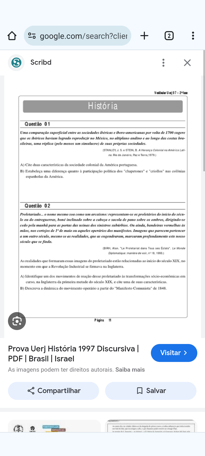 <p>+ 2 S Scribd X Vestibular - História Questão 01 Uma comparação superficial entre as sociedades ibéricas ibero-americanas por volta de 1700 sugere que os ibéricos haviam logrado reproduzir no no altiplano andino e ao longo das costas bra- sileiras, uma réplica (pelo menos um de suas próprias J STEIN A Herança Colonial na America Rio de Janeiro Paz e Terra A) Cite duas características da sociedade colonial da America B) Estabeleça uma diferença quanto à participação dos "chapetones" e "criollos" nas espanholas da Questão 02 nome mesmo como representam-se os proletários do início do sécu- ou do entreguerras, boné inclinado sobre a cabeça e sacola de pano sobre ombros, dirigindo-se cedo pela manha para as portas das usinas dos sinistros Ou bandeiras vermelhas às mãos, cortejos de maio ou aqueles operários dos manifestos. Imagens que parecem pertencer a um outro século, mesmo se as que as engendraram, marcaram profundamente este século que se finda. Alan dans Tous Le Monde de n° 1993.) As realidades que formaram essas imagens do proletariado estão relacionadas ao do século no momento em que a Revolução Industrial se firmava na Inglaterra A) Identifique um dos movimentos de reação desse proletariado às transformações em curso, na Inglaterra da primeira metade do século e cite uma de suas B) Descreva a do movimento operário a partir do "Manifesto Comunista" de 1848 Página 11 Prova Uerj História 1997 Discursiva Visitar > PDF Brasil Israel As imagens podem ter direitos autorais. Saiba mais Compartilhar Salvar</p>