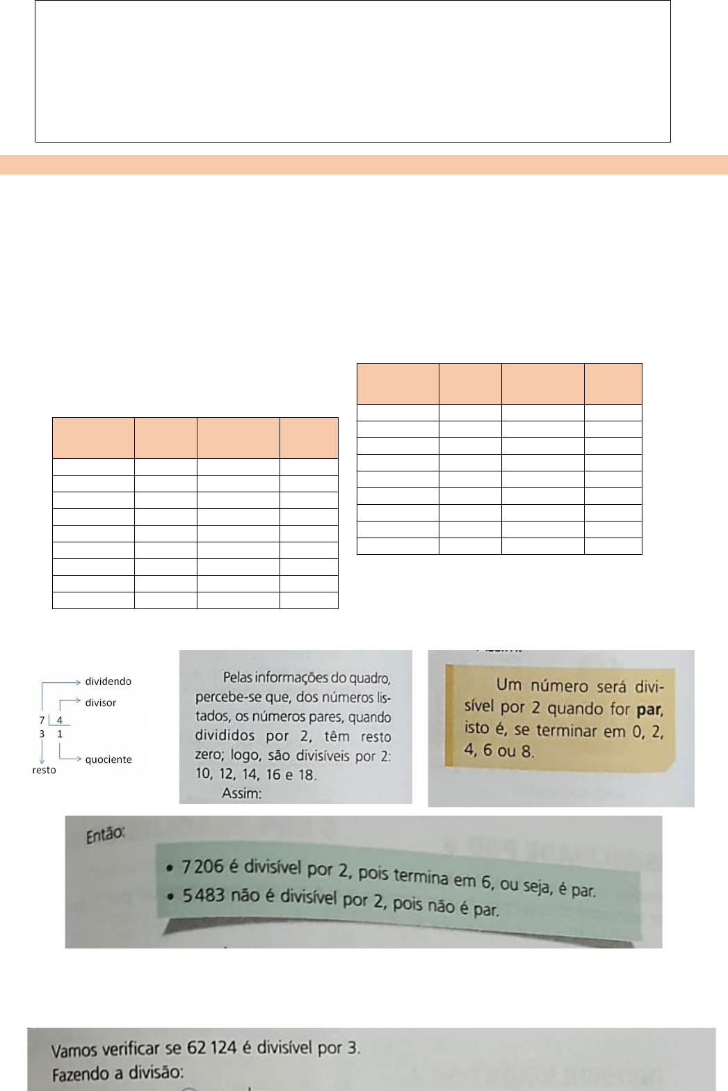 <p>Escola Estadual Barão do Rio Branco</p><p>Professor: Idelfonso Almeida Estagiária: Walkiria Cardoso</p><p>Aluno (a): ___________________________________________________</p><p>___________________________________________________</p><p>Turma: Turno: 2° Data: 13/08/2024</p><p>CRITÉRIOS DE DIVISIBILIDADE</p><p>O que é divisibilidade?</p><p>Ser divisível significa que quando dividimos os números, o resultado será um número natural e o resto será igual a zero.</p><p>Os critérios de divisibilidade são regras para saber, de uma forma rápida, se um número é ou não divisível por outro, isto é, se a divisão será exata. Essas propriedades são úteis para realizarmos exercícios.</p><p>Divisibilidade por 2</p><p>Dividendo</p><p>Divisor</p><p>Quociente</p><p>Resto</p><p>2</p><p>2</p><p>1</p><p>0</p><p>3</p><p>2</p><p>2</p><p>1</p><p>4</p><p>2</p><p>2</p><p>0</p><p>5</p><p>2</p><p>2</p><p>1</p><p>6</p><p>2</p><p>3</p><p>0</p><p>7</p><p>2</p><p>3</p><p>1</p><p>8</p><p>2</p><p>4</p><p>0</p><p>9</p><p>2</p><p>4</p><p>1</p><p>10</p><p>2</p><p>5</p><p>0</p><p>Dividendo</p><p>Divisor</p><p>Quociente</p><p>Resto</p><p>11</p><p>2</p><p>5</p><p>1</p><p>12</p><p>2</p><p>6</p><p>0</p><p>13</p><p>2</p><p>6</p><p>1</p><p>14</p><p>2</p><p>7</p><p>0</p><p>15</p><p>2</p><p>7</p><p>1</p><p>16</p><p>2</p><p>8</p><p>0</p><p>17</p><p>2</p><p>4</p><p>1</p><p>18</p><p>2</p><p>9</p><p>0</p><p>19</p><p>2</p><p>9</p><p>1</p><p>RESULTADO 3603</p><p>Divisibilidade por 3</p><p>Divisibilidade por 4</p><p>ATIVIDADE</p><p>1) Das alternativas a seguir, a única que traz um número divisível por 3 é</p><p>a) 275.</p><p>b) 483.</p><p>c) 646.</p><p>d) 782</p><p>2) Sem efetuar a divisão, assinale com um X os números que são divisíveis por 2.</p><p>a) 111 ( ) b) 128 ( ) c) 306 ( ) d) 517 ( ) e) 250 ( ) f) 305 ( )</p><p>3) Sem efetuar a divisão, assinale com um X os números que são divisíveis por 3.</p><p>a) 129 ( ) b) 101 ( ) c) 401 ( ) d) 902 ( ) e) 333 ( ) f) 209 ( )</p><p>4) Identifique fazendo um círculo em torno do número que é divisível por 4:</p><p>a) 136 b) 104 c) 1 430 d) 482 e) 218 f ) 800</p><p>5) Usando os critérios de divisibilidade, assinale os números que são divisíveis por 2.</p><p>a) 107 b) 210 c) 328 d) 506 e) 1101 f) 4004 g) 555 h) 3030 i) 10101</p><p>GABARITO:</p><p>b) 210, c) 328, d) 506, f) 4004, h) 3030</p><p>6) Usando os critérios da divisibilidade, assinale os números que são divisíveis por 3.</p><p>a) 207 b) 403 c) 504 d) 837 d) 913 e) 913 f) 1026 g) 3103 h) 1011 i) 10101</p><p>GABARITO:</p><p>a) 207, c) 504, d) 837, f) 1026, h) 1011, i) 10101</p><p>7) Sem efetuar a divisão, identifique quais dos seguintes números são divisíveis por 3:</p><p>a) 23 b) 48 c) 120 d) 576 e) 8223 f) 9075</p><p>GABARITO:</p><p>b,c,d,e,f</p><p>image3.png</p><p>image4.png</p><p>image1.png</p><p>image2.png</p>