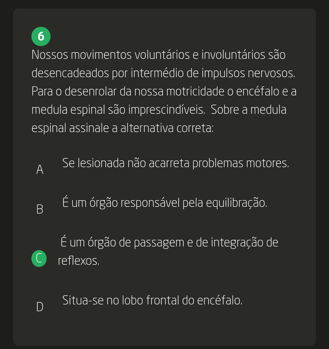 <p>6 Nossos movimentos voluntários e involuntários são desencadeados por intermédio de impulsos nervosos. Para desenrolar da nossa motricidade O encéfalo e a medula espinal são imprescindíveis. Sobre a medula espinal assinale a alternativa correta: A Se lesionada não acarreta problemas motores. É um órgão responsável pela equilibração. É um órgão de passagem e de integração de C reflexos. Situa-se no lobo frontal do encéfalo. D</p>