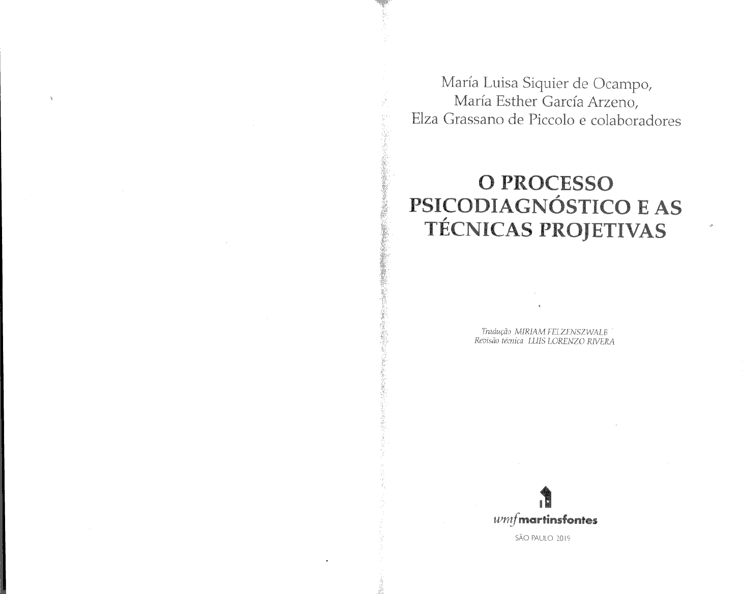 <p>María Luisa Siquier de Ocampo, María Esther García Arzeno, Elza Grassano de Piccolo e colaboradores O PROCESSO PSICODIAGNÓSTICO EAS TÉCNICAS PROJETIVAS Tradução MIRIAM FELZENSZWALB Revisão LUIS LORENZO RIVERA wmfmartinsfontes SÃO PAULO 2019</p><p>Capítulo I processo psicodiagnóstico Caracterização. Objetivos. Momentos do Processo. Enquadramento. María L. S. de Ocampo e María E. Arzeno</p><p>A concepção do processo psicodiagnóstico, tal como o postulamos nesta obra, é relativamente nova. Tradicionalmente era considerado "a partir de fora", como uma situação em que o psicólogo aplica um teste em alguém, e era nestes termos que se fazia o encaminhamento. Em alguns casos especificava-se, inclusive, que teste, ou testes, se deve- ria aplicar. A indicação era formulada então como "fazer um Rorschach" ou "aplicar um desiderativo" em alguém. De outro ponto de vista, "a partir de dentro", o psicólogo tradicionalmente sentia sua tarefa como o cumprimento de uma solicitação com as características de uma demanda a ser satisfeita seguindo os passos e utilizando os instrumentos indi- cados por outros (psiquiatra, psicanalista, pediatra, neurolo- gista, etc.). objetivo fundamental de seu contato com o pa- ciente era, então, a investigação do que este faz diante dos estí- mulos apresentados. Deste modo, o psicólogo atuava como al- guém que aprendeu, o melhor que pôde, a aplicar um teste. O paciente, por seu lado, representava alguém cuja presença é imprescindível; alguém de quem se espera que colabore docil- mente, mas que só interessa como objeto parcial, isto é, como "aquele que deve fazer o Rorschach ou o Teste das Duas Pes- soas". Tudo que se desviasse deste propósito ou interferisse</p><p>6 o processo psicodiagnóstico e as projetivas processo psicodiagnóstico 7 em seu sucesso era considerado como uma perturbação que aspectos. Por um lado, tomou emprestada uma pseudo-identi- afeta e complica o trabalho. dade, negando as diferenças e não pensando para não distin- Terminada a aplicação do último teste, em geral, despe- guir e ficar, de novo, desprotegido. O preço deste alívio, além dia-se o paciente e enviava-se ao remetente um informe elabo- da imposição externa, foi a submissão interior que o empobre- rado com enfoque atomizado, isto é, teste por teste, e com uma cia sob todos os pontos de vista, ainda que lhe evitasse um ampla gama de detalhes, a ponto de incluir, em alguns casos, questionamento sobre quem era e como deveria trabalhar. A o protocolo de registro dos testes aplicados, sem levar em conta não-indagação de tudo o que se referia ao sistema comunica- que o profissional remetente não tinha conhecimentos especí- dinâmico aumentava a distância entre o psicólogo e o ficos suficientes para extrair alguma informação útil de todo paciente e diminuía a possibilidade de vivenciar a angústia que este material. Este tipo de informe psicológico funciona como pode despertar. Assim, utilizavam-se os testes uma prestação de contas do psicólogo ao outro profissional, como se eles constituíssem em si mesmos o objetivo do psico- que é sentido como um superego exigente e inquisidor. Atrás diagnóstico e como um escudo entre o profissional e o pacien- desse desejo de mostrar detalhadamente o que aconteceu entre para evitar pensamentos e sentimentos que mobilizassem seu paciente e ele, esconde-se uma grande insegurança, fruto afetos (pena, rejeição, compaixão, medo, etc.). de sua frágil identidade profissional. Surge, então, uma neces- Mas nem todos os psicólogos agiram de acordo com esta sidade imperiosa de justificar-se e provar (e provar para si) que Muitos experimentaram o desejo de uma aproxima- procedeu corretamente, detalhando excessivamente o que acon- ção autêntica com o paciente. Para pô-lo em prática, tiveram teceu, por medo de não mostrar nada que seja essencial e cli- de abandonar o modelo médico enfrentando por um lado a nicamente útil. Esses informes psicológicos são, à luz de nos- desproteção e, por outro, a sobrecarga afetiva pelos depósitos* SOS conhecimentos atuais, uma fria enumeração de dados, traços, de que eram objeto, sem estarem preparados para isso. Podia fórmulas, etc., não integrados numa Gestalt acontecer então que atuassem de acordo com os papéis indu- que apreenda o essencial da personalidade do paciente e per- zidos pelo paciente: que se deixassem invadir, seduzir, que o mita superprotegessem, o abandonassem, etc. O resultado era uma O psicólogo trabalhou durante muito tempo com um mo- contra-identificação projetiva com o paciente, inconveniente delo similar ao do médico clínico que, para proceder com efi- porque interferia em seu trabalho. Devemos levar em conta ciência e objetividade, toma a maior distância possível em re- que é escassa a confiança que podemos ter em um diagnósti- lação a seu paciente a fim de estabelecer um vínculo afetivo em que tenha operado este mecanismo, sem possibilidades que não lhe impeça de trabalhar com a tranqüilidade e a obje- de correção posterior. Devido à difusão crescente da psicaná- tividade necessárias. lise no âmbito universitário e sua adoção como marco de refe- Em nossa opinião, o psicólogo agia assim rência, os psicólogos optaram por aceitá-la como modelo de e ainda age por carecer de uma identidade sólida que lhe trabalho, diante da necessidade de achar uma imagem de iden- permita saber quem é e qual é seu verdadeiro trabalho dentro tificação que lhes permitisse crescer e se fortalecer. Esta aqui- das ocupações ligadas à saúde mental. Por isso tomou empres- tado, passivamente, o modelo de trabalho do médico clínico (pe- diatra, neurologista, etc.) que lhe dava um pseudo-alívio sob dois * Depositar será usado no sentido de colocar no outro e deixar. (N. do E.)</p><p>o processo psicodiagnóstico e as técnicas projetivas processo psicodiagnóstico 9 significou um progresso de valor
