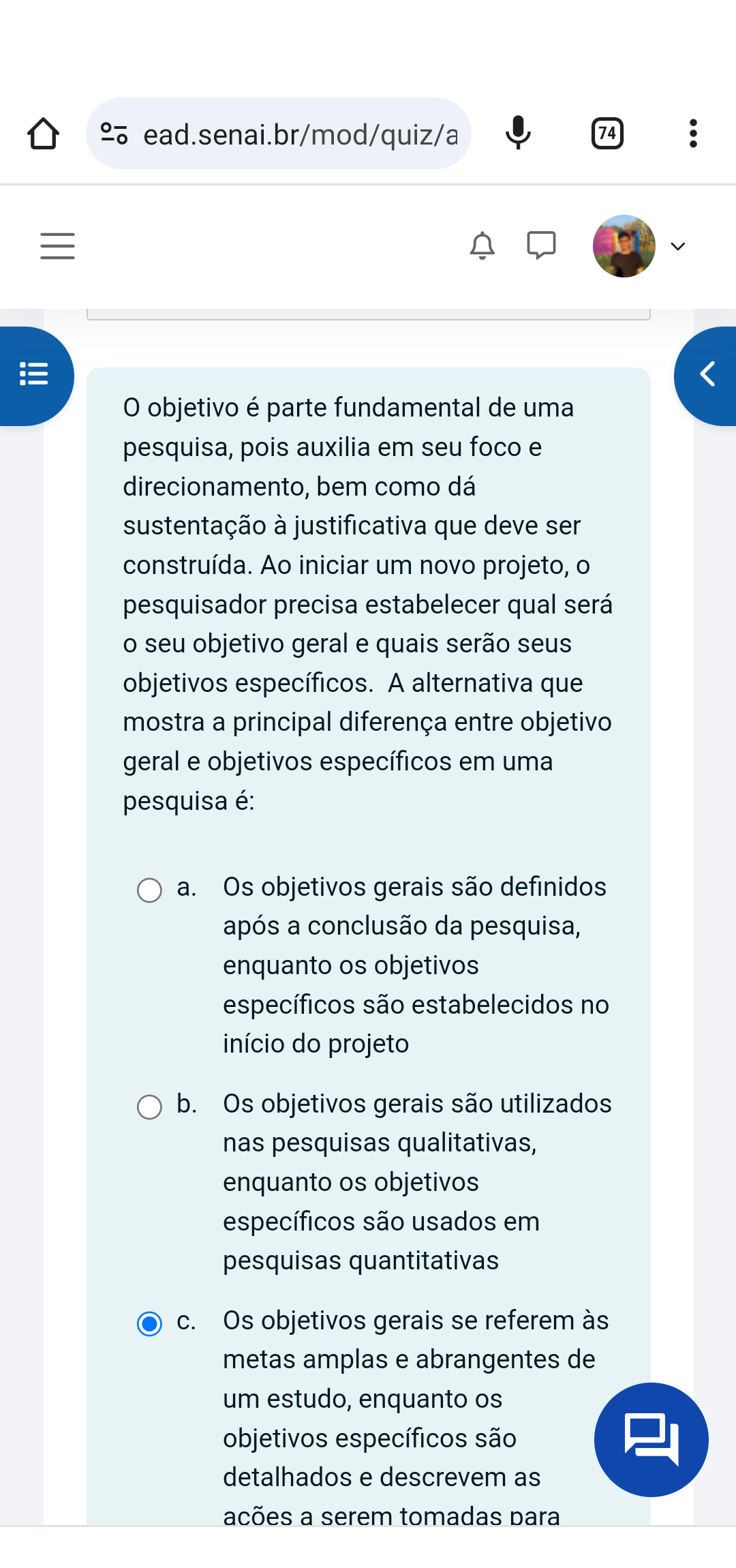 <p>ead.senai.br/mod/quiz/a 74 objetivo é parte fundamental de uma pesquisa, pois auxilia em seu foco e direcionamento, bem como dá sustentação à justificativa que deve ser construída. Ao iniciar um novo projeto, o pesquisador precisa estabelecer qual será o seu objetivo geral e quais serão seus objetivos específicos. A alternativa que mostra a principal diferença entre objetivo geral e objetivos específicos em uma pesquisa é: a. Os objetivos gerais são definidos após a conclusão da pesquisa, enquanto os objetivos específicos são estabelecidos no início do projeto b. Os objetivos gerais são utilizados nas pesquisas qualitativas, enquanto os objetivos específicos são usados em pesquisas quantitativas C. Os objetivos gerais se referem às metas amplas e abrangentes de um estudo, enquanto os objetivos específicos são detalhados e descrevem as a serem tomadas para</p>