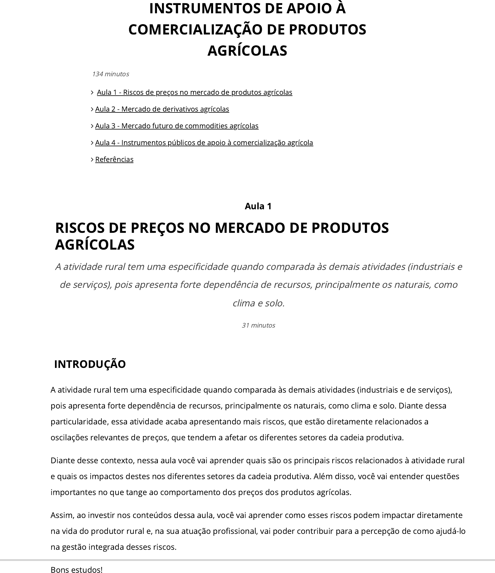 <p>14/09/2023, 18:17 wlldd_231_u3_com_pro_agr</p><p>https://www.colaboraread.com.br/integracaoAlgetec/index?usuarioEmail=julio-nc%40hotmail.com&usuarioNome=JÚLIO+CÉSAR+PAIXÃO+PEREIRA&disciplinaDescricao=&atividadeId=3658064&atividadeDescrica… 1/24</p><p>INTRODUÇÃO</p><p>A atividade rural tem uma especi�cidade quando comparada às demais atividades (industriais e de serviços),</p><p>pois apresenta forte dependência de recursos, principalmente os naturais, como clima e solo. Diante dessa</p><p>particularidade, essa atividade acaba apresentando mais riscos, que estão diretamente relacionados a</p><p>oscilações relevantes de preços, que tendem a afetar os diferentes setores da cadeia produtiva.</p><p>Diante desse contexto, nessa aula você vai aprender quais são os principais riscos relacionados à atividade rural</p><p>e quais os impactos destes nos diferentes setores da cadeia produtiva. Além disso, você vai entender questões</p><p>importantes no que tange ao comportamento dos preços dos produtos agrícolas.</p><p>Assim, ao investir nos conteúdos dessa aula, você vai aprender como esses riscos podem impactar diretamente</p><p>na vida do produtor rural e, na sua atuação pro�ssional, vai poder contribuir para a percepção de como ajudá-lo</p><p>na gestão integrada desses riscos.</p><p>Bons estudos!</p><p>Aula 1</p><p>RISCOS DE PREÇOS NO MERCADO DE PRODUTOS</p><p>AGRÍCOLAS</p><p>A atividade rural tem uma especi�cidade quando comparada às demais atividades (industriais e</p><p>de serviços), pois apresenta forte dependência de recursos, principalmente os naturais, como</p><p>clima e solo.</p><p>31 minutos</p><p>INSTRUMENTOS DE APOIO À</p><p>COMERCIALIZAÇÃO DE PRODUTOS</p><p>AGRÍCOLAS</p><p> Aula 1 - Riscos de preços no mercado de produtos agrícolas</p><p> Aula 2 - Mercado de derivativos agrícolas</p><p> Aula 3 - Mercado futuro de commodities agrícolas</p><p> Aula 4 - Instrumentos públicos de apoio à comercialização agrícola</p><p> Referências</p><p>134 minutos</p><p>14/09/2023, 18:17 wlldd_231_u3_com_pro_agr</p><p>https://www.colaboraread.com.br/integracaoAlgetec/index?usuarioEmail=julio-nc%40hotmail.com&usuarioNome=JÚLIO+CÉSAR+PAIXÃO+PEREIRA&disciplinaDescricao=&atividadeId=3658064&atividadeDescrica… 2/24</p><p>Imprimir</p><p>CONHECENDO OS RISCOS (E SEUS IMPACTOS) E O COMPORTAMENTO DOS</p><p>PREÇOS NO MERCADO AGRÍCOLA</p><p>Vamos iniciar a nossa aula, primeiramente, entendendo que a agricultura apresenta diversos riscos inerentes à</p><p>atividade, pois é diretamente dependente de insumos naturais. Esses riscos causam impactos diretos nos</p><p>custos produtivos, no retorno econômico do produtor e em toda a cadeia de lucratividade do negócio. Ou seja,</p><p>o impacto pode atingir desde os fornecedores de insumos (sementes, adubos, agroquímicos), até os preços de</p><p>venda ao consumidor �nal.</p><p>Diante desse cenário, podemos de�nir e dividir os riscos em grupos, da seguinte forma (EMBRAPA, 2018):</p><p>Grupo 1: Riscos de produção</p><p>Corresponde aos riscos relacionados às variações das condições de clima, problemas �tossanitários e manejo</p><p>incorreto.</p><p>Grupo 2: Riscos de mercado (ou de crédito)</p><p>Correspondem aos riscos relacionados à falta de linhas de �nanciamento e falta de condições de pagamento.</p><p>Grupo 3: Riscos de ambiente de negócios (ou de preços)</p><p>Correspondem aos riscos ligados às oscilações dos preços devido aos deslocamentos da demanda e/ou oferta</p><p>dos produtos.</p><p>Com esses riscos associados aos preços dos produtos agrícolas, os impactos surgem como resposta às</p><p>variações que podem surgir. E estes podem afetar todos os setores da cadeia produtiva, principalmente de</p><p>commodities agrícolas, visto que estas estão diretamente expostas às incertezas com relação às �utuações de</p><p>preços, pois são dependentes fortemente da oferta e demanda e, também, do mercado externo.</p><p>Diante disso, podemos observar que os riscos in�uenciam de forma direta as margens de lucro dos produtos</p><p>agrícolas e, com isso, é importante que o produtor busque proteger a sua rentabilidade, utilizando ferramentas</p><p>que contribuam para reduzir as incertezas e riscos.</p><p>Além disso, é importante conhecer quais são as características do comportamento dos preços dos produtos</p><p>agrícolas, que ocorrem em virtude das oscilações entre demanda e oferta dos produtos agrícolas no mercado.</p><p>Diante desse cenário, os principais comportamentos dos preços e suas características estão detalhados no</p><p>Quadro 1 (WAQUIL; MIELE; SCHULTZ, 2010; EMBRAPA, 2018).</p><p>Quadro 1 | Comportamento dos preços e suas características (ou de�nições)</p><p>Comportamento Característica</p><p>14/09/2023, 18:17 wlldd_231_u3_com_pro_agr</p><p>https://www.colaboraread.com.br/integracaoAlgetec/index?usuarioEmail=julio-nc%40hotmail.com&usuarioNome=JÚLIO+CÉSAR+PAIXÃO+PEREIRA&disciplinaDescricao=&atividadeId=3658064&atividadeDescrica… 3/24</p><p>Tendência</p><p>Observada a longo prazo, apresentando trajetória de alta, queda ou preço estável.</p><p>Pode sofrer in�uência de alguns fatores, como inovação tecnológica e alterações na</p><p>oferta e procura.</p><p>Ciclo Observado em períodos relativamente longos, que podem englobar alguns anos.</p><p>Sazonalidade</p><p>Observada ao longo do período de um ano, englobando a safra e a entressafra,</p><p>contribuindo para as variações de preço (baixa na safra e alta na entressafra).</p><p>Movimento brusco</p><p>Observado em período curto, normalmente dias ou semanas. Sinaliza as oscilações no</p><p>mercado de diminuição ou elevação dos preços.</p><p>Fonte: WAQUIL; MIELE; SCHULTZ (2010).</p><p>Agora que conhecemos os conceitos, vamos seguir nos aprofundando no assunto, visando entender como os</p><p>riscos podem afetar a produção e, consequentemente, os preços no mercado. Além