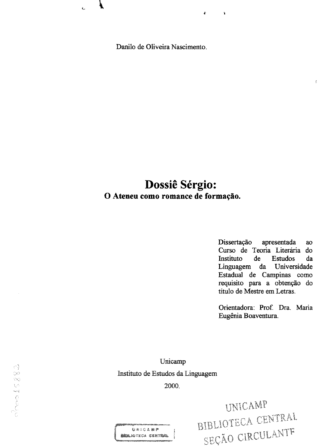 <p>Danilo de Oliveira Nascimento.</p><p>Dossiê Sérgio:</p><p>O Ateneu como romance de formação.</p><p>Unicamp</p><p>Instituto de Estudos da Linguagem</p><p>2000.</p><p>Dissertação apresentada ao</p><p>Curso de Teoria Literária do</p><p>Instituto de Estudos da</p><p>Linguagem da Universidade</p><p>Estadual de Campinas como</p><p>requisito para a obtenção do</p><p>título de Mestre em Letras.</p><p>Orientadora: Prof. Dra. Maria</p><p>Eugênia Boaventura.</p><p>11 Nl7d</p><p>::</p><p>" I!</p><p>I!</p><p>li ,,</p><p>I!</p><p>H</p><p>'I</p><p>li</p><p>li</p><p>li</p><p>li</p><p>11</p><p>!!</p><p>i'</p><p>\\</p><p>11</p><p>li</p><p>J •</p><p>'</p><p>FICHA CATALOGRÁFICA ELABORADA PELA</p><p>BIBLIOTECA IEL- UNICA.MP</p><p>Nascimento, Danilo de Oliveira</p><p>Dossiê Sérgio: o Ateneu como romance de formação I Danilo de</p><p>Oliveira Nascimento. --Campinas, SP: [s.n.], 2000.</p><p>Orientador: Maria Eugênia Boaventura</p><p>Dissertação (mestrado) - Universidade Estadual de Campinas,</p><p>lnsututo c!e Estudos c!a Lmguagem.</p><p>1. Pompeia, Raul, 1863-1895. 2. Literatura brasileira- Romance. 3.</p><p>Crítica literária - Ficção - Brasil - Sec. XIX. 4. Adolescentes na</p><p>literatura. I. Boaventura, Maria Eugênia. II. Universidade Estadual de</p><p>Campinas. Instituto de Estudos da Linguagem. III. Título.</p><p>Prof". Dr •. Maria Eugênia Boaventura.</p><p>Prof". Dr •. Orna Messer Levin.</p><p>Prof' Dr • Isabel Margato.</p><p>Prof". Dr •. Vilma Arêas.</p><p>Campinas, 23 de março de 2000.</p><p>;·</p><p>B apra~&:•.l t-~L~' ~o~issãD</p><p>L</p><p>Dedicatória:</p><p>A Hehalot.</p><p>Especialmente aos meus pais Daniel e Dalva, e aos meus innãos Alessandra,</p><p>Marcelo e João Marcos (in memorian).</p><p>A Raul Pompéia, na esperança de não ter deformado sua obra-prima.</p><p>Agradecimentos:</p><p>A CAPES, pela concessão da bolsa de estudos;</p><p>As profossoras Maria Eugênia Boaventura, Orna Messer Levin e Vi/ma</p><p>Arêas (fEL - UNfCAMP) pelas criticas e orientações no desenvolvimento</p><p>dessa dissertação;</p><p>Ao Departamento de Letras da Campus Universitário de Rondonópolis</p><p>(UFMT), especialmente aos professores Deusa Fonseca Raposo, Soraia</p><p>Lima Arabi, Laércio Pulzatto, Maria Rosa Petroni e Francel/i;</p><p>A todos os meus colegas de graduação, especialmente Rosiane Cristina</p><p>Gonçalves Braga e Vi/ma Campos que acreditaram na realização desse</p><p>projeto, oferecendo todo apoio possível e necessário;</p><p>A todos colegas do fEL que direta ou indiretamente me auxiliaram na</p><p>realização do mesmo: Ana Cláudia Fidelis, Adriana Si/ene, Alixandra</p><p>Gomes, Milena Ribeiro Martins, Marco Fontanel/a, Ce/dom, e com ajéição a</p><p>Valéria Augusti.</p><p>A Aurora Reis Silva e famllia;</p><p>A. Angélica Fernandes;</p><p>Sumário</p><p>Apresentação .................................................................................................................................. 07</p><p>Capítulo 1: Sérgio, colega de Wilhelm Meister?</p><p>1.1. O legado de Wilhelrn Meister ................................................................................................... 14</p><p>1.2.A apropriação do termo Bildungsrornan .................................................................................. 15</p><p>1.3.0 Ateneu e a tradição do Bildungsrornan ................................................................................. 22</p><p>Capítulo 2: A Fina flor da sociedade brasileira.</p><p>2.1. Conspiração contra os inocentes ............................................................................................... 29</p><p>2.2.Sérgio de Pornpéia ou os vários sentidos de Sérgio ................................................................ .36</p><p>Capítulo 3: Colégio para meninos.</p><p>3.l.De um desejo, o rudimento de um rito .................................................................................... .43</p><p>3.2.A simbologia do rito de passagem de Sérgio .......................................................................... .46</p><p>3.3.Laços de Farnília ...................................................................................................................... 48</p><p>3.4.0 Teatro do Mundo ................................................................................................................. 54</p><p>3.4.1.Urn reino corno representação e vontade .......................................................................... 56</p><p>Capítulo 4: Programa do Pequeno mártir ad majorem gloriam.</p><p>4.1.AGlória do Ateneu ................................................................................................................... 71</p><p>4.2.As mãos da Minerva Benigna .................................................................................................. 76</p><p>4.3.0s cem olhos de Aristarco ........................................................................................................ 80</p><p>4.4.A função do colégio e fazer esquecer o próprio sexo ............................................................... 84</p><p>4.5.Urn indivíduo !asso e solitário .................................................................................................. 91</p><p>O Monopólio da mágoa .............................................................................................................. 1 02</p><p>Bibliografia ................................................................................................................................ .. 1 07</p><p>Abstract .... ................................................................................................................................... 120</p><p>< T . ' l l..J</p><p>AMP</p><p>Resumo.</p><p>O trabalho analisa O Ateneu baseado na acepção tradicional do Bildungsroman ( romance de</p><p>formação), cujo paradigma é Os anos de aprendizado de Wilhel