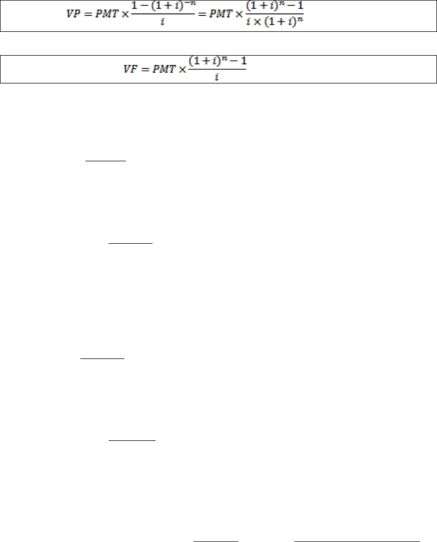 <p>1</p><p>Tema 3: Séries de Pagamento Homogêneas</p><p>São Paulo, 22/09/2013, Prof. Fábio Goto</p><p>Seguem alguns exercícios sobre Séries de Pagamento Homogêneas.</p><p>Fórmulas</p><p>(1)</p><p>(2)</p><p>Exercícios</p><p>1. (Dutra, p. 86) Qual o montante, no final de 8 meses, referente a uma aplicação de R$ 1</p><p>000,00 por mês, à taxa de 3% a.m.?</p><p>34,8892</p><p>03,0</p><p>103,11000</p><p>8</p><p>=</p><p>−</p><p>×=VF</p><p>2. (Dutra, p. 87) Quanto deverá ser aplicado, a cada 2 meses, em um fundo e renda fixa, à</p><p>taxa de 5% ao bimestre, durante 3 anos e meio, para que se obtenha, no final desse prazo,</p><p>um montante de R$ 175 000,00?</p><p>31,4899</p><p>105,1</p><p>05,0175000 21 =</p><p>−</p><p>×=PMT</p><p>3. (Dutra, p. 88) Uma pessoa depositou, anualmente, R$ 500,00 numa conta de poupança,</p><p>em nome de seu filho, a juros de 6% a.a. O primeiro depósito foi feito no dia em que o</p><p>filho completou 1 ano, e o último por ocasião de seu 18º aniversário. O dinheiro ficou</p><p>depositado até o dia em que o filho completou 21 anos, ocasião em que o montante foi</p><p>sacado. Quanto recebeu o filho?</p><p>( ) 56,1840406,01</p><p>06,0</p><p>106,1500 3</p><p>18</p><p>=+×</p><p>−</p><p>×=VF</p><p>4. (Dutra, p. 100) Que valor de prestação uma financeira receberá, trimestralmente, se</p><p>financiar R$ 100 00,00 para serem pagos em 10 trimestres, sabendo-se que a taxa é de</p><p>3,22801% a.m. (ou 10% a.t.)?</p><p>5394,16274</p><p>10,11</p><p>10,0100000 10 =</p><p>−</p><p>×= −PMT</p><p>5. (Dutra, p. 103) Uma empresa obtém um empréstimo de R$ 100 000,00 para ser quitado</p><p>em cinco prestações mensais iguais. Sabendo-se que a primeira prestação tem seu</p><p>vencimento 90 dias após a data do contrato e que a taxa de juros cobrada pelo banco é de</p><p>6% a.m., calcular o valor das prestações.</p><p>( ) ( ) 86,26673</p><p>06,11</p><p>06,006,01100000</p><p>06,0</p><p>06,1106,01100000 5</p><p>25</p><p>2 =</p><p>−</p><p>×+×</p><p>=→</p><p>−</p><p>×=+×= −</p><p>−</p><p>PMTPMTVP</p><p>2</p><p>6. (Dutra, p. 104) o sr. Alfredo adquire um aparelho de som para ser pago em 12 prestações</p><p>iguais de R$ 2 200,00. Sabendo-se que a primeira prestação vence a 120 dias da data do</p><p>contrato, que as demais têm vencimentos mensais sucessivos, e que a taxa cobrada pela</p><p>loja é de 5% a.m., calcular o valor financiado pelo Sr. Alfredo. [R$ 19 499,15]</p><p>10,16844</p><p>05,0</p><p>05,1105,12200</p><p>05,0</p><p>05,1105,12200</p><p>12</p><p>3</p><p>12</p><p>3 =</p><p>−</p><p>××=→</p><p>−</p><p>××=</p><p>−</p><p>−</p><p>−</p><p>− VPVP</p><p>7. (AFRF/2000/ESAF) Uma pessoa faz uma compra financiada em doze prestações mensais e</p><p>iguais de R$ 210,00. Obtenha o valor financiado, desprezando os centavos, a uma taxa de</p><p>juros compostos de 4% a.m., considerando que o financiamento equivale a uma anuidade</p><p>e que a primeira prestação evence depois de efetuada a compra.</p><p>a) R$ 2 048</p><p>b) R$ 1 970</p><p>c) R$ 3 155</p><p>d) R$ 2 530</p><p>e) R$ 2 4</p><p>86,1970</p><p>04,0</p><p>04,11210</p><p>12</p><p>=</p><p>−</p><p>×=</p><p>−</p><p>VP</p><p>8. (Previdência) Suponha que um funcionário queira se aposentar aos 60 anos e receber durante</p><p>20 anos (até completar 80 anos) uma renda de R$ 5 000 por mês. Se esse funcionário possui</p><p>no momento 30 anos, qual o aporte mensal que esse funcionário precisa fazer até os 60 anos</p><p>em um fundo de investimento que renda 10% a.a.? Qual o valor que esse funcionário terá no</p><p>fundo ao completar 60 anos?</p><p>..%79,0007974,01)10,01(1)1( 12/112/1</p><p>.... maii aama ==−+=−+=</p><p>3070,533823</p><p>0079,0</p><p>0079,115000</p><p>240</p><p>=</p><p>−</p><p>×=</p><p>−</p><p>VP</p><p>7804,258</p><p>10079,1</p><p>0079,03070,533823</p><p>0079,0</p><p>10079,13070,533823 360</p><p>360</p><p>=</p><p>−</p><p>×=→</p><p>−</p><p>×== PMTPMTVF</p><p>9. (Financiamento Estudantil) Suponha que um estudante pense em financiar os dois últimos</p><p>anos do seu curso utilizando um financiamento estudantil. A mensalidade do curso é de</p><p>R$ 750,00 mensais e a taxa de juros do financiamento é de 4% a.a. Ao final do curso, o</p><p>estudante começa a pagar o financiamento em parcelas mensais iguais por 4 anos. Qual o</p><p>valor que o estudante deverá ao se formar? Qual o valor das parcelas mensais que o estudante</p><p>pagará para amortizar o financiamento?</p><p>..%33,0003274,01)04,01(1)1( 12/112/1</p><p>.... maii aama ==−+=−+=</p><p>2165,18694</p><p>0033,0</p><p>10033,1750</p><p>24</p><p>=</p><p>−</p><p>×=VF</p><p>4998,421</p><p>0033,11</p><p>0033,02165,18694</p><p>0033,0</p><p>0033,112165,18697 48</p><p>48</p><p>=</p><p>−</p><p>×</p><p>=→</p><p>−</p><p>×== −</p><p>−</p><p>PMTPMTVP</p><p>Tema 3: Séries de Pagamento Homogêneas</p><p>Fórmulas</p><p>Exercícios</p>
