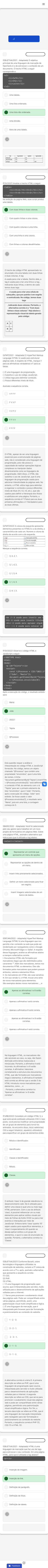 <p>Você acertou 0 de 10</p><p>questões</p><p>Verifique o seu desempenho e continue</p><p>treinando! Você pode refazer o exercício</p><p>quantas vezes quiser.</p><p>Verificar Desempenho</p><p>A</p><p>B</p><p>C</p><p>D</p><p>E</p><p>A</p><p>B</p><p>C</p><p>D</p><p>E</p><p>A</p><p>B</p><p>C</p><p>D</p><p>E</p><p>A</p><p>B</p><p>C</p><p>D</p><p>E</p><p>A</p><p>B</p><p>C</p><p>D</p><p>E</p><p>A</p><p>B</p><p>C</p><p>D</p><p>E</p><p>A</p><p>B</p><p>C</p><p>D</p><p>E</p><p>A</p><p>B</p><p>C</p><p>D</p><p>E</p><p>A</p><p>B</p><p>C</p><p>D</p><p>E</p><p>A</p><p>B</p><p>C</p><p>D</p><p>E</p><p>1 Marcar para revisão</p><p>(OBJETIVA/2021 - Adaptada) O objetivo</p><p>principal de uma linguagem de marcação de</p><p>hipertexto é o de estruturar o conteúdo de um</p><p>documento. O trecho HTML a seguir</p><p>corresponde a:</p><p><ul></p><p><li>Café</li></p><p><li>Chá</li></p><p><li>Leite</li></p><p></ul></p><p>Uma tabela.</p><p>Uma lista ordenada.</p><p>Uma lista não ordenada.</p><p>Uma divisão.</p><p>Itens de uma tabela.</p><p>Questão não respondida</p><p>Opa! A alternativa correta é a letra C.</p><p>Confira o gabarito comentado!</p><p>Gabarito Comentado</p><p>2 Marcar para revisão</p><p>(FGV/2021) Analise o trecho HTML a seguir.</p><p><table></p><p><tr><th>A</th><th>C</th></tr></p><p><tr><th>B</th><th>D</th></tr></p><p></table></p><p>Na exibição da página Web, esse script produz</p><p>uma tabela.</p><p>Com duas linhas e duas colunas.</p><p>Com quatro linhas e uma coluna.</p><p>Com quatro colunas e uma linha.</p><p>Com uma linha e uma coluna.</p><p>Com linhas e colunas desalinhadas.</p><p>Questão não respondida</p><p>Opa! A alternativa correta é a letra A.</p><p>Confira o gabarito comentado!</p><p>Gabarito Comentado</p><p>O trecho de código HTML apresentado no</p><p>enunciado cria uma tabela com duas linhas</p><p>e duas colunas. A tag</p><p>é usada para criar a tabela. Dentro dela, a</p><p>tag é usada para criar uma linha e a tag ,</p><p>indicando duas linhas, e dentro de cada</p><p>temos duas tags</p><p>é usada para criar uma célula de</p><p>cabeçalho, que por padrão é em negrito</p><p>e centralizada. No código, temos duas</p><p>tags</p><p>, indicando duas colunas. Portanto, a</p><p>alternativa correta é a: "Com duas</p><p>linhas e duas colunas". Veja abaixo a</p><p>representação visual da tabela gerada</p><p>pelo código:</p><p>A C</p><p>B D</p><p>3 Marcar para revisão</p><p>(UFMT/2021 - Adaptada) O HyperText Markup</p><p>Language (HTML) é usado para estruturar</p><p>páginas web. A respeito de HTML, marque V</p><p>para as afirmativas verdadeiras e F para as</p><p>falsas.</p><p>( ) É uma linguagem de programação.</p><p>( ) Substitui o uso de código JavaScript.</p><p>( ) Utiliza tags para delimitar conteúdo.</p><p>( ) Possui diferentes níveis de título.</p><p>Assinale a sequência correta.</p><p>V F F F</p><p>F V V F</p><p>V V F V</p><p>F F V V</p><p>F F F F</p><p>Questão não respondida</p><p>Opa! A alternativa correta é a letra D.</p><p>Confira o gabarito comentado!</p><p>Gabarito Comentado</p><p>O HTML, apesar de ser uma linguagem</p><p>essencial para a estruturação de páginas</p><p>web, não é considerado uma linguagem de</p><p>programação, pois não possui a</p><p>capacidade de realizar operações lógicas</p><p>complexas ou manipular dados</p><p>dinamicamente como as linguagens de</p><p>programação. Além disso, o HTML não</p><p>substitui o uso de JavaScript, que é uma</p><p>linguagem de programação usada para</p><p>adicionar interatividade às páginas web. No</p><p>entanto, o HTML utiliza tags para delimitar</p><p>e organizar o conteúdo e possui diferentes</p><p>níveis de título (h1, h2, h3, etc.), que são</p><p>usados para definir a hierarquia dos títulos</p><p>e subtítulos em uma página. Portanto, a</p><p>sequência correta é F (Falso) para as duas</p><p>primeiras afirmações e V (Verdadeiro) para</p><p>as duas últimas.</p><p>4 Marcar para revisão</p><p>(UFMT/2022) A coluna da esquerda apresenta</p><p>elementos presentes no HTML5 e a da direita, a</p><p>característica de cada um. Numere a coluna da</p><p>direita de acordo com a da esquerda.</p><p>Marque a sequência correta.</p><p>3, 4, 2, 1.</p><p>3, 1, 4, 2.</p><p>2, 1, 3, 4.</p><p>2, 1, 4, 3.</p><p>2, 4, 1, 3.</p><p>Questão não respondida</p><p>Opa! A alternativa correta é a letra D.</p><p>Confira o gabarito comentado!</p><p>Gabarito Comentado</p><p><br /> é usada para inserir uma quebra de linha.</p><p><h1> é usada para inserir títulos ao longo da página</p><p><div> é usada para agrupar algum tipo de conteúdo que não tenha nenhuma semântica específica ou que não se encaixe bem dentro de uma tag semântica.</p><p><!-- --> é usada para colocar um comentário.</p><p>5 Marcar para revisão</p><p>(FGV/2022) Observe o código HTML e</p><p>JavaScript a seguir:</p><p>Após a execução do código, o resultado exibido</p><p>será:</p><p><!DOCTYPE html></p><p><html></p><p><body></p><p><p id="Tejota"></p></p><p><script></p><p>const tjProcesso = {ID:"2022.1", envolvidos:</p><p>["João", "Maria"]};</p><p>document.getElementById("Tejota").innerHTML</p><p>= tjProcesso.envolvidos[0];</p><p></script></p><p></body></p><p></html></p><p>Maria</p><p>João</p><p>2022.1</p><p>Tejota</p><p>tjProcesso</p><p>Questão não respondida</p><p>Opa! A alternativa correta é a letra B.</p><p>Confira o gabarito comentado!</p><p>Gabarito Comentado</p><p>Esta questão requer a análise e</p><p>interpretação do código HTML e JavaScript</p><p>fornecido. No código, temos um objeto</p><p>chamado "tjProcesso" que contém uma</p><p>propriedade "envolvidos", que é uma lista</p><p>de nomes. A linha</p><p>"document.getElementById("Tejota").innerHTML</p><p>= tjProcesso.envolvidos[0];" está definindo</p><p>o conteúdo HTML do elemento com o id</p><p>"Tejota" para ser o primeiro elemento da</p><p>lista "envolvidos", que é "João". Portanto,</p><p>após a execução do código, "João" será</p><