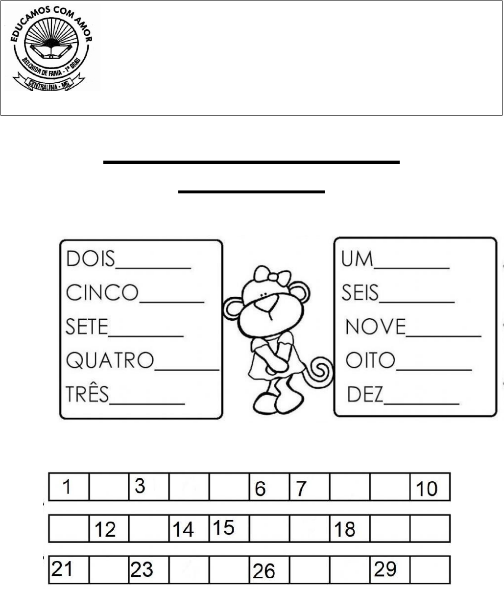 <p>ESCOLA ESTADUAL "BELCHIOR DE FARIA" 1º GRAU</p><p>ALUNO(A): ______________________________________________</p><p>PROFESSORA: _______________________ SÉRIE: ___________</p><p>AVALIAÇÃO BIMESTRAL DE MATEMÁTICA</p><p>1) Escreva os números:</p><p>2) Complete a sequência com os números faltosos</p><p>3) Quem vem antes e quem vem depois:</p><p>4) Pinte o numeral correspondente à quantidade de elementos de cada conjunto:</p><p>5) Ligue cada numeral ao seu nome:</p><p>9 cinco</p><p>2 sete</p><p>8 nove</p><p>5 um</p><p>7 três</p><p>4 quatro</p><p>1 dois</p><p>3 zero</p><p>6 oito</p><p>0 seis</p><p>6) Observe o gráfico de brinquedos do Maurício e responda as perguntas:</p><p>image4.jpeg</p><p>image1.png</p><p>image2.jpeg</p><p>image3.jpeg</p>