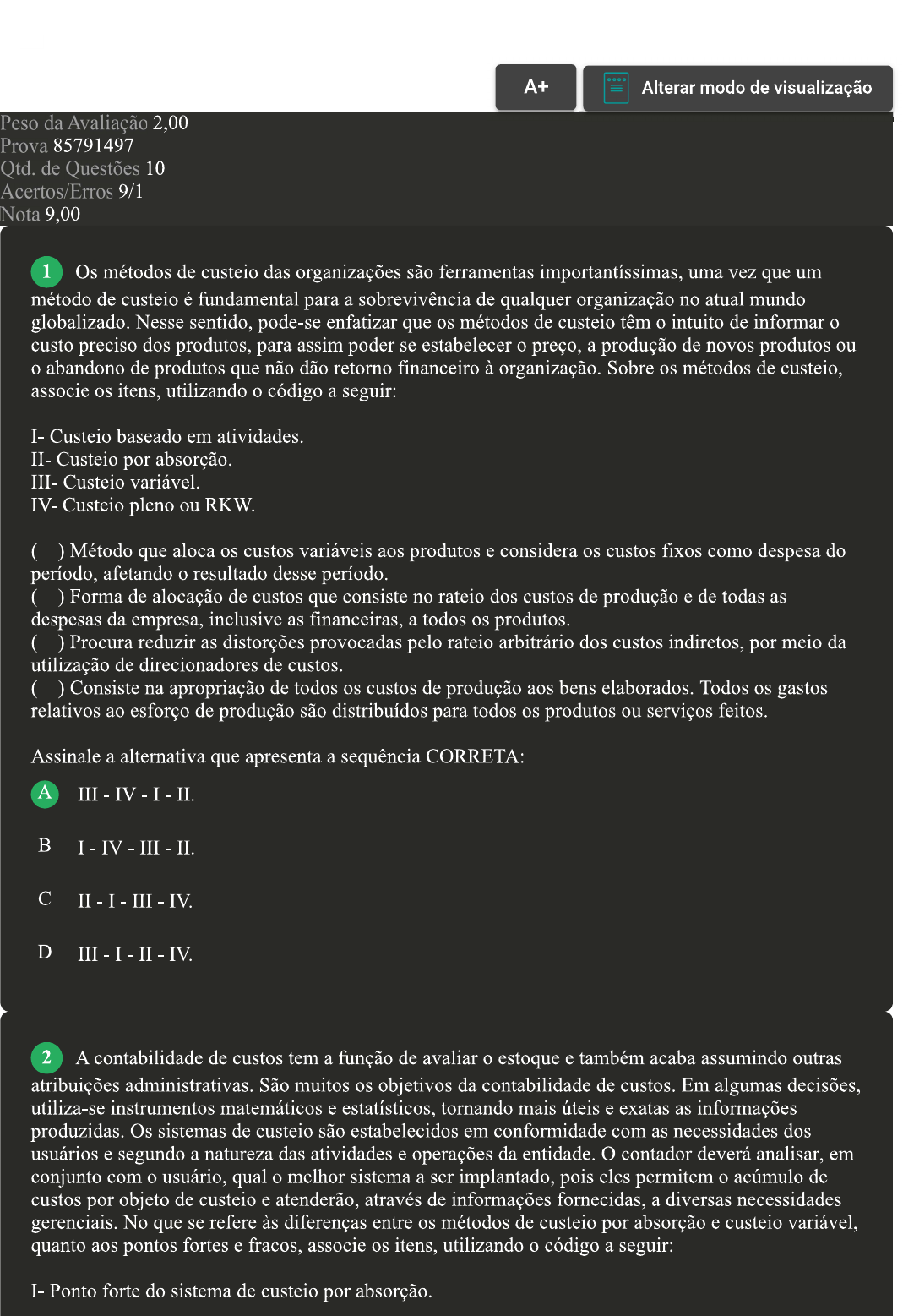 <p>A+ Alterar modo de visualização Peso da Avaliação 2,00 Prova 85791497 Qtd. de Questões 10 Acertos/Erros 9/1 Nota 9,00 1 Os métodos de custeio das organizações são ferramentas importantissimas, uma vez que um método de custeio é fundamental para a sobrevivência de qualquer organização no atual mundo globalizado. Nesse sentido, pode-se enfatizar que os métodos de custeio têm intuito de informar custo preciso dos produtos, para assim poder se estabelecer preço, a produção de novos produtos ou abandono de produtos que não dão retorno financeiro à organização. Sobre os métodos de custeio, associe os itens, utilizando código a seguir: I- Custeio baseado em atividades. II- Custeio por absorção. III- Custeio variável. IV- Custeio pleno ou RKW. ( ) Método que aloca os custos variáveis aos produtos e considera os custos fixos como despesa do período, afetando resultado desse período. ( ) Forma de alocação de custos que consiste no rateio dos custos de produção e de todas as despesas da empresa, inclusive as financeiras, a todos os produtos. ) Procura reduzir as distorções provocadas pelo rateio arbitrário dos custos indiretos, por meio da utilização de direcionadores de custos. ( ) Consiste na apropriação de todos os custos de produção aos bens elaborados. Todos os gastos relativos ao esforço de produção são distribuídos para todos os produtos ou serviços feitos. Assinale a alternativa que apresenta a sequência CORRETA: A III IV - I II. B II. C II - I - III IV. D II - I - II IV. 2 A contabilidade de custos tem a função de avaliar estoque e também acaba assumindo outras atribuições administrativas. São muitos os objetivos da contabilidade de custos. Em algumas utiliza-se instrumentos matemáticos e estatísticos, tornando mais úteis e exatas as informações produzidas. Os sistemas de custeio são estabelecidos em conformidade com as necessidades dos usuários e segundo a natureza das atividades e operações da entidade. O contador deverá analisar, em conjunto com usuário, qual melhor sistema a ser implantado, pois eles permitem acúmulo de custos por objeto de custeio e atenderão, através de informações fornecidas, a diversas necessidades gerenciais. No que se refere às diferenças entre os métodos de custeio por absorção e custeio variável, quanto aos pontos fortes e fracos, associe os itens, utilizando código a seguir: I- Ponto forte do sistema de custeio por absorção.</p><p>II- Ponto fraco do sistema de custeio por absorção. III- Ponto forte do sistema de custeio variável. ( ) Nesta situação, não há como prever qual é montante que contribui para os departamentos indiretos de produção para a formação dos custos dos produtos e qual é sua participação para a sua real formação. ( ) O custo fixo não possui relação direta ao processo fabril, e por não ser alocado ao custo do produto não necessita de complexas formas de rateio aos produtos. ( ) O sistema considera total dos custos por produto, que aqui são demonstrados pelos Custos Fixos e Assinale a alternativa que apresenta a sequência CORRETA: A I II III. B III I II. C II - III - I. D I III 3 O método de custeio por absorção possui fatores positivos e negativos quando da apuração dos custos. O custo por absorção reconhece os custos diretos de acordo com consumo desses custos, e os custos indiretos são reconhecidos de acordo com algum critério de rateio. Um dos fatores positivos do método de custeio por absorção é a fixação de preços de venda mais reais, pois engloba todos os custos da empresa nos custos unitários dos produtos. Sobre os outros fatores positivos desse método, classifique V para as sentenças verdadeiras e F para as falsas: ( ) Atende à legislação fiscal ( ) Não evidencia a capacidade ociosa da entidade. ( ) Os critérios de rateio nem sempre são justos. Assinale a alternativa que apresenta a sequência CORRETA: A B C D 4 O custo que contempla de maneira efetiva que acontece no processo de produção, leva em conta desempenho da mão de obra, do desperdício e dos custos de matéria-prima, além de todas as características envolvidas no processo produtivo. Sobre nome dado a esse tipo de custo, assinale a alternativa CORRETA: A Custo padrão. B Custo de capital.</p><p>C Custo real. D Custo de financiamento. 5 O sistema de custeio é, na sua essência, um sistema de informação e de suporte à tomada de decisão. As diversas abordagens, tradicionais e contemporâneas, continuam a levantar algumas questões, nomeadamente quanto à escolha do sistema de custeio a aplicar. Analise as afirmativas a seguir: I- O custeio baseado em atividades procura reduzir as distorções provocadas pelo rateio arbitrário dos custos indiretos, por meio da utilização de direcionadores de custos. II- O custeio por absorção consiste na apropriação de alguns custos de produção aos bens elaborados, os demais são apropriados como despesas. Nem todos os gastos relativos ao esforço de produção são distribuídos para todos os produtos ou serviços feitos. III- O custeio variável é método que aloca os custos variáveis nos produtos e considera os custos fixos como despesa do período, afetando resultado desse período. Assinale a alternativa CORRETA: A As afirmativas I e II estão corretas. B Somente a afirmativa II está correta. C As afirmativas II e III estão corretas. D As afirmativas I e III estão corretas. 6 Saber como diferenciar despesas e custo pode ser um desafio para muitas pessoas na hora de classificar seus gastos. Saber que consiste cada um destes termos, no entanto, é essencial para uma gestão eficaz dos negócios e para não ter problemas na contabilidade. Sobre os custos e as despesas de uma empresa que produz dois tipos de tecido de algodão, assinale a alternativa CORRETA: A A depreciação do prédio onde funciona a fábrica é um custo fixo indireto de cada metro de tecido e deve compor valor do estoq