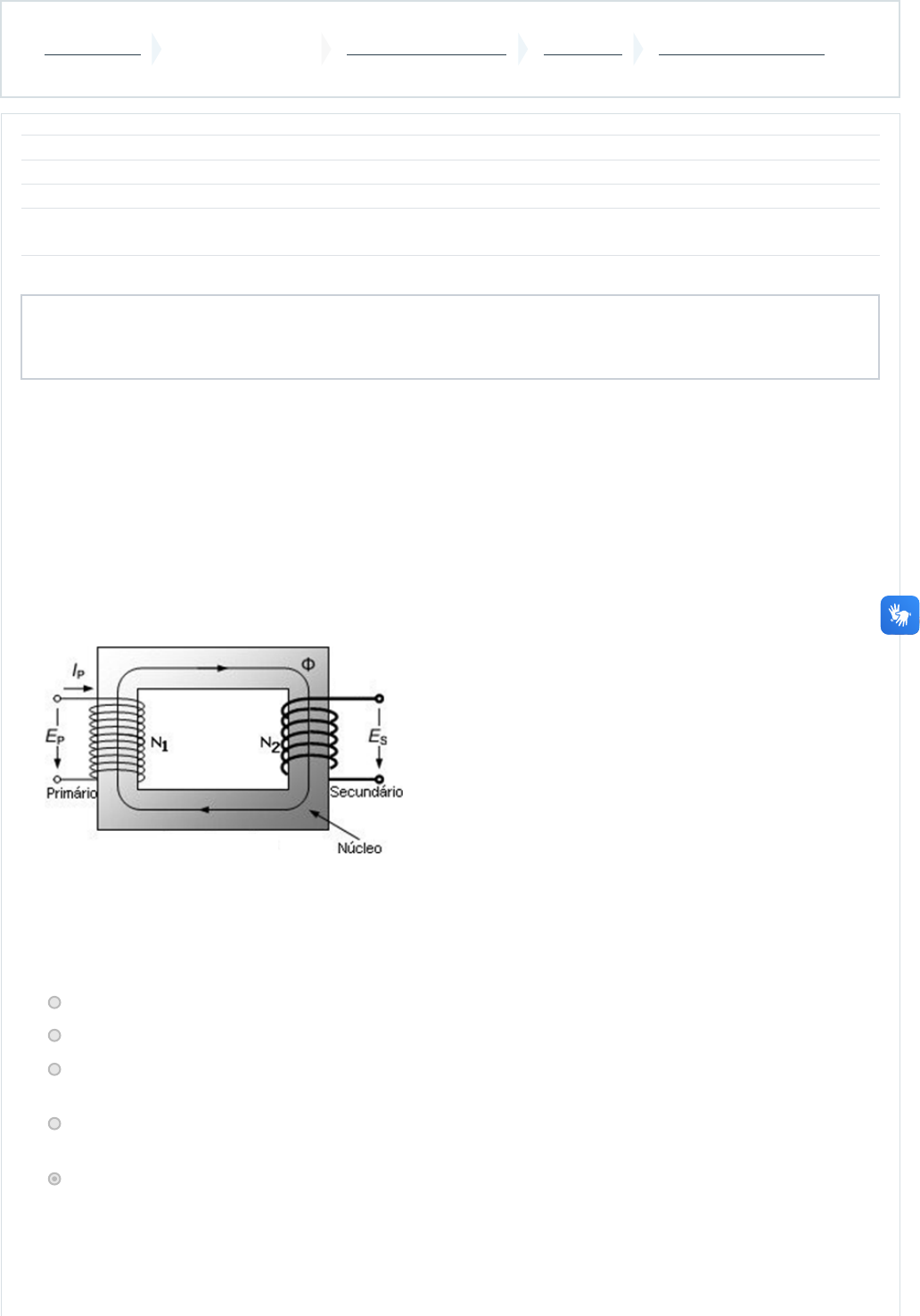 <p>Página inicial Minhas disciplinas 2024/3 - Eletrotécnica UNIDADE IV Avaliação - Unidade IV</p><p>Iniciado em set 2024</p><p>Estado Finalizada</p><p>Concluída em set 2024</p><p>Tempo</p><p>empregado</p><p>minutos segundos</p><p>Avaliar 0,50 de um máximo de 0,50(100%)</p><p>Questão 1</p><p>Completo</p><p>Atingiu 0,05 de 0,05</p><p>A indução eletromagnética comprovada por Faraday, conhecida por lei de Faraday, é deduzida da descoberta</p><p>de Oersted, e posteriormente foi formulada pela lei circuital de Ampère, que tem como conceito que a</p><p>passagem de corrente em um condutor produz um campo magnético que circunda este condutor. A partir das</p><p>observações de Oersted, a dedicação de Faraday foi em obter uma corrente induzida a partir de um campo</p><p>magnético, o que foi verificado e ficou conhecido como lei de indução de Faraday, em que é comprovado que</p><p>um campo magnético variável no tempo é capaz de induzir uma tensão elétrica e, consequentemente, uma</p><p>corrente elétrica no momento em que este circuito elétrico esteja fechado. Estas premissas podem todas ser</p><p>verificadas no funcionamento do transformador de potência, este dispõe de enrolamentos de primário (N1) e</p><p>enrolamentos de secundário (N2) conectados magneticamente por meio de um núcleo ferromagnético, como</p><p>pode ser visto na figura:</p><p>A tensão (Ep) aplicada nos enrolamentos de primário faz com que uma corrente de primário (Ip) produza um</p><p>fluxo magnético (ϕ) que vai ficar restrito ao núcleo ferromagnético (considerando um transformador ideal). O</p><p>fluxo magnético induz uma tensão elétrica (Es) no secundário do transformador. De acordo com o que</p><p>conhecemos da lei de indução de Faraday e dos outros fenômenos eletromagnéticos que estão presentes no</p><p>funcionamento do transformador, é correto afirmar que:</p><p>a. Nenhuma das alternativas é correta.</p><p>b. O fluxo magnético (ϕ) que flui no núcleo ferromagnético deve ser constante.</p><p>c. Se no enrolamento de primário é aplicada uma tensão e corrente contínuas, o fluxo magnético resultante</p><p>é variável e induz uma tensão no secundário.</p><p>d. Se no enrolamento de primário é aplicada uma tensão e corrente contínuas, o fluxo magnético resultante</p><p>é constante e induz uma tensão no secundário.</p><p>e. O fluxo magnético (ϕ) que flui no núcleo ferromagnético deve ser variável.</p><p>A resposta correta é: O fluxo magnético (ϕ) que flui no núcleo ferromagnético deve ser variável.</p><p>Avaliação - Unidade IV: Revisão da tentativa</p><p>1/6</p><p>https://ambienteonline.uninga.br/</p><p>https://ambienteonline.uninga.br/course/view.php?id=27850</p><p>https://ambienteonline.uninga.br/course/view.php?id=27850§ion=6</p><p>https://ambienteonline.uninga.br/mod/quiz/view.php?id=793991</p><p>Questão 2</p><p>Completo</p><p>Atingiu 0,05 de 0,05</p><p>Questão 3</p><p>Completo</p><p>Atingiu 0,05 de 0,05</p><p>A máquina síncrona é assim denominada por ter uma sincronia entre a tensão induzida ou aplicada e a</p><p>velocidade de rotação mecânica da máquina. Um gerador síncrono de 4 polos, com velocidade de 1500 rpm,</p><p>induz em seus terminais de armadura uma tensão com frequência de:</p><p>a. 50 Hz.</p><p>b. 55 Hz.</p><p>c. 65 Hz.</p><p>d. 45 Hz.</p><p>e. 60 Hz.</p><p>A resposta correta é: 50 Hz.</p><p>Analise as seguintes afirmativas a respeito de máquinas de corrente contínua:</p><p>I. Na operação como motor, tanto o estator como o rotor da máquina CC é excitada em corrente contínua.</p><p>II. Diferentemente da máquina síncrona, o enrolamento de armadura da máquina CC está localizado no rotor.</p><p>III. Diferentemente da máquina síncrona o enrolamento de campo da máquina CC está localizado no estator.</p><p>IV. A máquina CC foi amplamente empregada onde era necessário um ótimo controle de velocidade.</p><p>Assinale a alternativa que contém a(s) afirmativa(s) correta(s):</p><p>a. Apenas I.</p><p>b. I, II e III.</p><p>c. I, II, III e IV.</p><p>d. II e IV.</p><p>e. II e III.</p><p>A resposta correta é: I, II, III e IV.</p><p>Avaliação - Unidade IV: Revisão da tentativa</p><p>2/6</p><p>Questão 4</p><p>Completo</p><p>Atingiu 0,05 de 0,05</p><p>Questão 5</p><p>Completo</p><p>Atingiu 0,05 de 0,05</p><p>Analise as seguintes afirmativas a respeito de motores de indução de rotor tipo gaiola de esquilo:</p><p>I. No motor de indução a corrente alternada é fornecida por meio de escovas ao rotor e, por meio da indução, o</p><p>estator também é energizado.</p><p>II. No motor de indução a corrente alternada é fornecida ao enrolamento de estator e, por indução, o rotor tem</p><p>uma tensão induzida.</p><p>III. Os motores de indução são também conhecidos como máquinas assíncronas, pois a velocidade de rotação</p><p>da máquina não estará em sincronia com a frequência da tensão aplicada.</p><p>Assinale a alternativa que contém a(s) afirmativa(s) correta(s):</p><p>a. II e III.</p><p>b. I e III.</p><p>c. Apenas II</p><p>d. Apenas I.</p><p>e. I, II e III.</p><p>A resposta correta é: II e III.</p><p>Assinale a alternativa que apresenta a velocidade de um motor síncrono que tem uma tensão de alimentação</p><p>com frequência de operação de 60 Hz e 8 polos, acionada em 380 V.</p><p>a. 5000 rpm.</p><p>b. 900 rpm.</p><p>c. 300 rpm.</p><p>d. 3000 rpm.</p><p>e. 1800 rpm.</p><p>A resposta correta é: 900 rpm.</p><p>Avaliação - Unidade IV: Revisão da tentativa</p><p>3/6</p><p>Questão 6</p><p>Completo</p><p>Atingiu 0,05 de 0,05</p><p>Questão 7</p><p>Completo</p><p>Atingiu 0,05 de 0,05</p><p>Assinale a opção que não apresenta uma característica correta relativa às máquinas síncronas.</p><p>a. Uma máquina síncrona é uma máquina de corrente alternada.</p><p>b. O motor síncrono é uma máquina que tem excitação do campo em CC e excitação da armadura em CA.</p><p>c. Os polos do rotor de