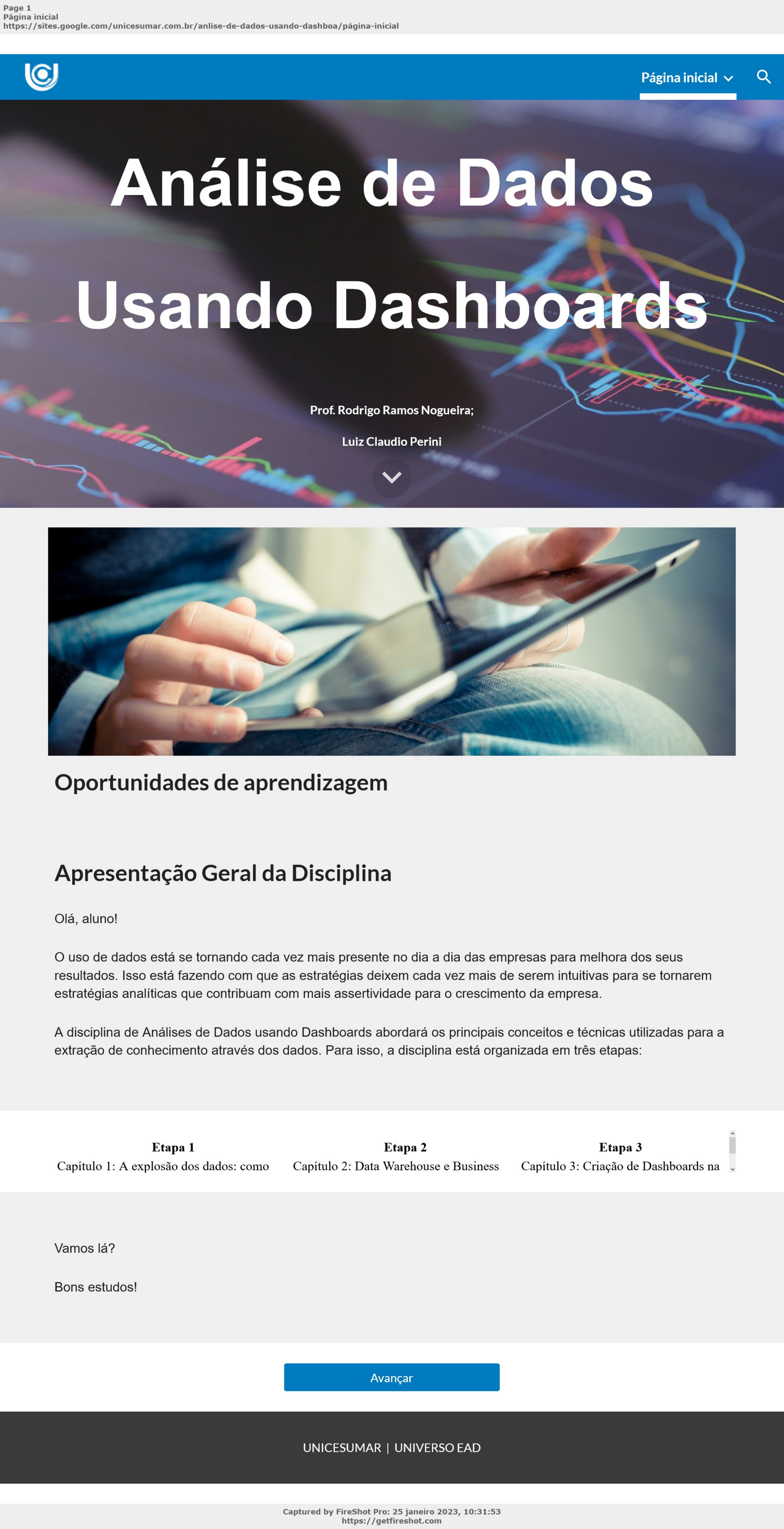<p>Página inicial</p><p>Pular para o conteúdo principal Pular para a navegação</p><p>Análise de Dados</p><p>Usando Dashboards</p><p>Prof. Rodrigo Ramos Nogueira;</p><p>Luiz Claudio Perini</p><p>Oportunidades de aprendizagem</p><p>Apresentação Geral da Disciplina</p><p>Olá, aluno!</p><p>O uso de dados está se tornando cada vez mais presente no dia a dia das empresas para melhora dos seus</p><p>resultados. Isso está fazendo com que as estratégias deixem cada vez mais de serem intuitivas para se tornarem</p><p>estratégias analíticas que contribuam com mais assertividade para o crescimento da empresa.</p><p>A disciplina de Análises de Dados usando Dashboards abordará os principais conceitos e técnicas utilizadas para a</p><p>extração de conhecimento através dos dados. Para isso, a disciplina está organizada em três etapas:</p><p>Vamos lá?</p><p>Bons estudos!</p><p>Avançar</p><p>UNICESUMAR | UNIVERSO EAD</p><p>https://sites.google.com/unicesumar.com.br/anlise-de-dados-usando-dashboa/p�gina-inicial</p><p>https://getfireshot.com</p><p>https://sites.google.com/unicesumar.com.br/anlise-de-dados-usando-dashboa/p%C3%A1gina-inicial</p><p>https://sites.google.com/unicesumar.com.br/anlise-de-dados-usando-dashboa/p%C3%A1gina-inicial</p><p>https://sites.google.com/unicesumar.com.br/anlise-de-dados-usando-dashboa/p%C3%A1gina-inicial/unidade-1</p><p>Página inicial</p><p>Pular para o conteúdo principal Pular para a navegação</p><p>Avançar</p><p>UNIDADE 1</p><p>Produzimos diariamente uma quantidade enorme de dados. A proliferação do uso de dispositivos móveis e das</p><p>mídias sociais impulsionam novas formas e fontes de dados, gerando um aglomerado de dados que chamamos de</p><p>Big Data. Porém, o avanço das tecnologias e a capacidade de processamento dos computadores intensificaram</p><p>também as análises desses dados, afinal, para as organizações não basta ter dados, é preciso gerar informação e</p><p>conhecimento.</p><p>Vamos começar tratando sobre dados. Essa grande quantidade de dados está distribuída de acordo com o seu</p><p>formato e estrutura de armazenamento. Assim, podem ser classificados como estruturados, semiestruturados e não</p><p>estruturados.</p><p>Semiestruturados Estruturados Não estruturados</p><p>São aqueles que têm uma São armazenados em uma Não é possível obter uma</p><p>estrutura, ou seja, consegue-se estrutura previamente definida. estrutura, e para extrair</p><p>reconhecer um significado, mas conhecimento sobre tais dados, é</p><p>não há uma estrutura definida necessário realizar um pré- SGBDR (Sistemas Gerenciadores</p><p>previamente. processamento. de Bancos de dados Relacionais)</p><p>ou BDR (Banco de dados</p><p>São: planilhas de Excel, arquivos relacionais). São: textos, imagens, arquivos de</p><p>CVS, documentos XML, som etc.</p><p>documentos JSON. Apenas 20% dos dados são</p><p>estruturados.</p><p>https://sites.google.com/unicesumar.com.br/anlise-de-dados-usando-dashboa/p�gina-inicial/unidade-1</p><p>https://getfireshot.com</p><p>https://sites.google.com/unicesumar.com.br/anlise-de-dados-usando-dashboa/p%C3%A1gina-inicial</p><p>https://sites.google.com/unicesumar.com.br/anlise-de-dados-usando-dashboa/p%C3%A1gina-inicial</p><p>Uma vez coletados e armazenados, esses dados podem gerar informação e conhecimento que poderão ser</p><p>utilizados como suporte à tomada de decisão nas organizações. Assim, coletar dados é a primeira etapa para</p><p>transformá-los em conhecimento. Para podermos avançar, vamos entender a diferença entre informação e</p><p>conhecimento?</p><p>Informação : são os dados contextualizados, categorizados, calculados e condensados. Informação são os dados</p><p>organizados.</p><p>Conhecimento : é quando se dá à informação um contexto, um significado, uma interpretação, ou seja, alguém</p><p>refletiu sobre o conhecimento, acrescentou a ele sua própria sabedoria e considerou suas implicações mais amplas.</p><p>No vídeo Informação, dados e conhecimento , você pode entender a relação entre esses três conceitos e como</p><p>eles são tratados e aplicados a sistemas de informação.</p><p>Informação, dados e conecimento</p><p>Com essa “explosão” de conteúdo, a Big Data é a área do conhecimento que estuda como tratar, analisar e obter</p><p>informações a partir de conjuntos de grande número de dados, que não seriam capazes de serem analisados por</p><p>sistemas tradicionais. No artigo Big Data Marketing: a importância dos dados para uma nova gestão de estratégias ,</p><p>você pode entender melhor o que é Big Data e acompanhar como o Big Data pode viabilizar o uso dessas</p><p>informações para melhorar as estratégias de marketing, dentro de uma organização, por exemplo.</p><p>Vamos ver alguns importantes conceitos que irão ajudar na compreensão de como analisar dados, principalmente</p><p>uma grande quantidade de dados.</p><p>Data mining É o processo de lapidar dados brutos e extrair conhecimento a partir deles.</p><p>SGBD Ou Sistema gerenciador de Bancos de Dados, é um software que é responsável por</p><p>gerenciar o acesso aos dados. É responsável por fazer a interface entre os dados</p><p>com aplicações e usuários, encapsulando-os, garantindo sua segurança e</p><p>integridade. Ex. SQL Server, MySQL e Oracle.</p><p>Data Warehouse São bancos de dados analíticos, projetados para armazenar os dados de fontes</p><p>diversas, já transformados e preparados para serem explorados por aplicações de</p><p>tomada de decisão</p><p>NOSQL São banco de dados onde os dados podem ser distribuídos de maneira</p><p>independente, sem que seja necessário enviar todo um conjunto para um</p><p>determinado nó ou disco.</p><p>https://sites.google.com/unicesumar.com.br/anlise-de-dados-usando-dashboa/p�gina-inicial/unidade-1</p><p>https://getfireshot.com</p><p>https://youtu.be/IuKRI06m018</p><p>https://www.google.com/url?q=https%3A%2F%2Fint