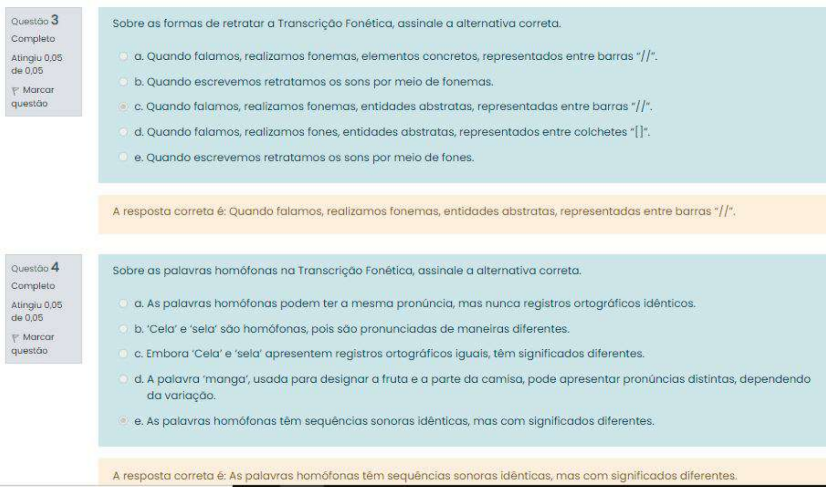 <p>Questão 3 Sobre as formas de retratar a Transcrição Fonética, assinale a alternativa Completo Atingiu 0,05 a. Quando falamos, realizamos fonemas, elementos concretos, representados entre barras de 0,05 b. Quando escrevemos retratamos os sons por meio de fonemas. Marcar questão Quando falamos, realizamos fonemas, entidades abstratas, representadas entre barras d. Quando falamos, realizamos fones, entidades abstratas, representados entre colchetes "[]". e. Quando escrevemos retratamos os sons por meio de fones. A correta é: Quando falamos, realizamos fonemas, entidades abstratas, representadas entre barras Questão 4 Sobre as palavras na Transcrição a alternativa Completo Atingiu 0,05 a. As palavras podem ter a mesma mas nunca registros ortográficos idênticos. de 0,05 b. e são pois são pronunciadas de maneiras Marcar questão Embora e 'sela' apresentem registros ortográficos iguais, têm significados diferentes. d. A palavra usada para designar a fruta e a parte da camisa, pode apresentar distintas, dependendo da variação. e. As palavras têm sequências sonoras idênticas, mas com significados diferentes. A resposta correta é: As palavras sequências sonoras idênticas, mas com significados diferentes.</p>