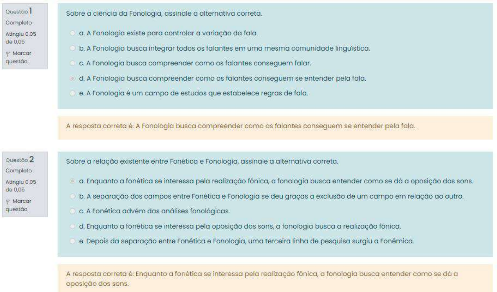 <p>Questão 1 Sobre a ciência da Fonologia, a alternativa Completo Atingiu 0,05 a. A Fonologia existe para controlar a variação da de 0,05 b. A Fonologia busca integrar todos os falantes em uma mesma comunidade Marcar questão A Fonologia busca compreender como os falantes conseguem falar. d. A Fonologia busca compreender como os falantes conseguem se entender fala. e. A Fonologia é um campo de estudos que estabelece regras de A correto é: A Fonologia busca compreender como os falantes conseguem se entender pela fala. Questão 2 Sobre a relação existente entre Fonética e Fonologia, assinale a alternativa Completo Atingiu 0,05 a. Enquanto a fonética se interessa pela realização fônica, a fonologia entender como se dá a oposição dos sons. de 0,05 b. A separação dos campos entre Fonética e Fonologia se deu graças a exclusão de um campo em relação ao outro. Marcar questão A Fonética advém das análises d. Enquanto a fonética se interessa pela oposição dos sons, a fonologia busca a realização e. Depois da separação entre Fonética e Fonologia, uma terceira linha de surgiu a A resposta é: Enquanto a se realização fônica, a fonologia busca entender como se dá a oposição dos</p>