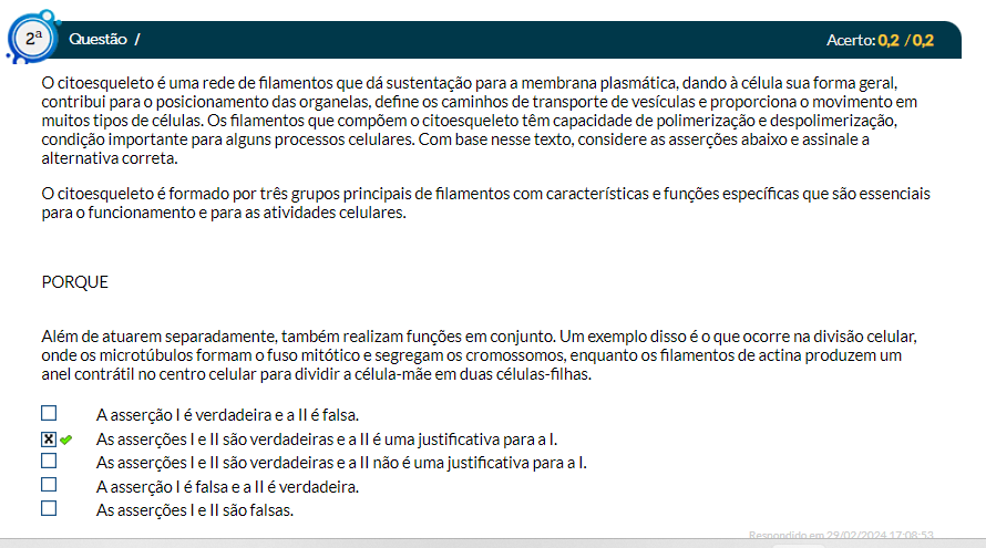 <p>Questão / Acerto: 0,2 citoesqueleto é uma rede de filamentos que dá sustentação para a membrana plasmática, dando à célula sua forma geral, contribui para posicionamento das organelas, define os caminhos de transporte de e proporciona movimento em muitos tipos de células. Os filamentos que compõem o citoesqueleto têm capacidade de polimerização e condição importante para alguns processos celulares. Com base nesse texto, considere as asserções abaixo e assinale a alternativa correta. citoesqueleto é formado por três grupos principais de filamentos com características e funções específicas que são essenciais para funcionamento e para as atividades celulares. PORQUE Além de atuarem separadamente, também realizam funções em conjunto. Um exemplo disso é que ocorre na divisão celular, onde os microtúbulos formam fuso mitótico e segregam os cromossomos, enquanto os filamentos de actina produzem um anel no centro celular para dividir a célula-mãe em duas células-filhas. A asserção I é verdadeira e a II é falsa. As asserções e II são verdadeiras e a II é uma justificativa para a I. As asserções e II são verdadeiras e a II não é uma justificativa para a I. A asserção I é falsa e a II é verdadeira. As asserções e II são falsas. Respondido em 29/02/2024 17:08:53</p>