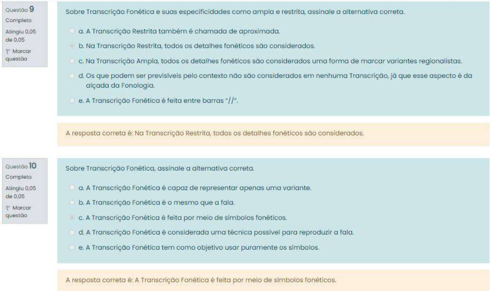 <p>9 Sobre Transcrição Fonética e suas especificidades como ampla e restrita, assinale a alternativa Completo Atingiu 0,05 A Transcrição também é chamada de aproximada. de 0,05 b. Na Transcrição Restrita, todos os detalhes fonéticos são considerados. P Marcar questão Na Transcrição Ampla, todos os detalhes fonéticos são considerados uma forma de marcar variantes regionalistas. d. Os que podem ser previsíveis pelo contexto não são considerados em nenhuma Transcrição, já que esse aspecto é da alçada da Fonologia. e. A Transcrição Fonética é feita entre barras A resposta correta é: Na Transcrição Restrita, todos os detalhes fonéticos são considerados. Questão 10 Sobre Transcrição assinale a alternativa correta. Completo Atingiu 0,05 A Transcrição Fonética é capaz de representar apenas uma variante. de b. A Transcrição Fonética é o mesmo que a fala. Marcar questão C. A Transcrição Fonética é feita por meio de simbolos fonéticos. d. A Transcrição Fonética é considerada uma técnica para reproduzir a fala. e. A Transcrição Fonética tem como objetivo usar puramente os simbolos. A resposta correta é: A Transcrição Fonética é feita por meio de</p>