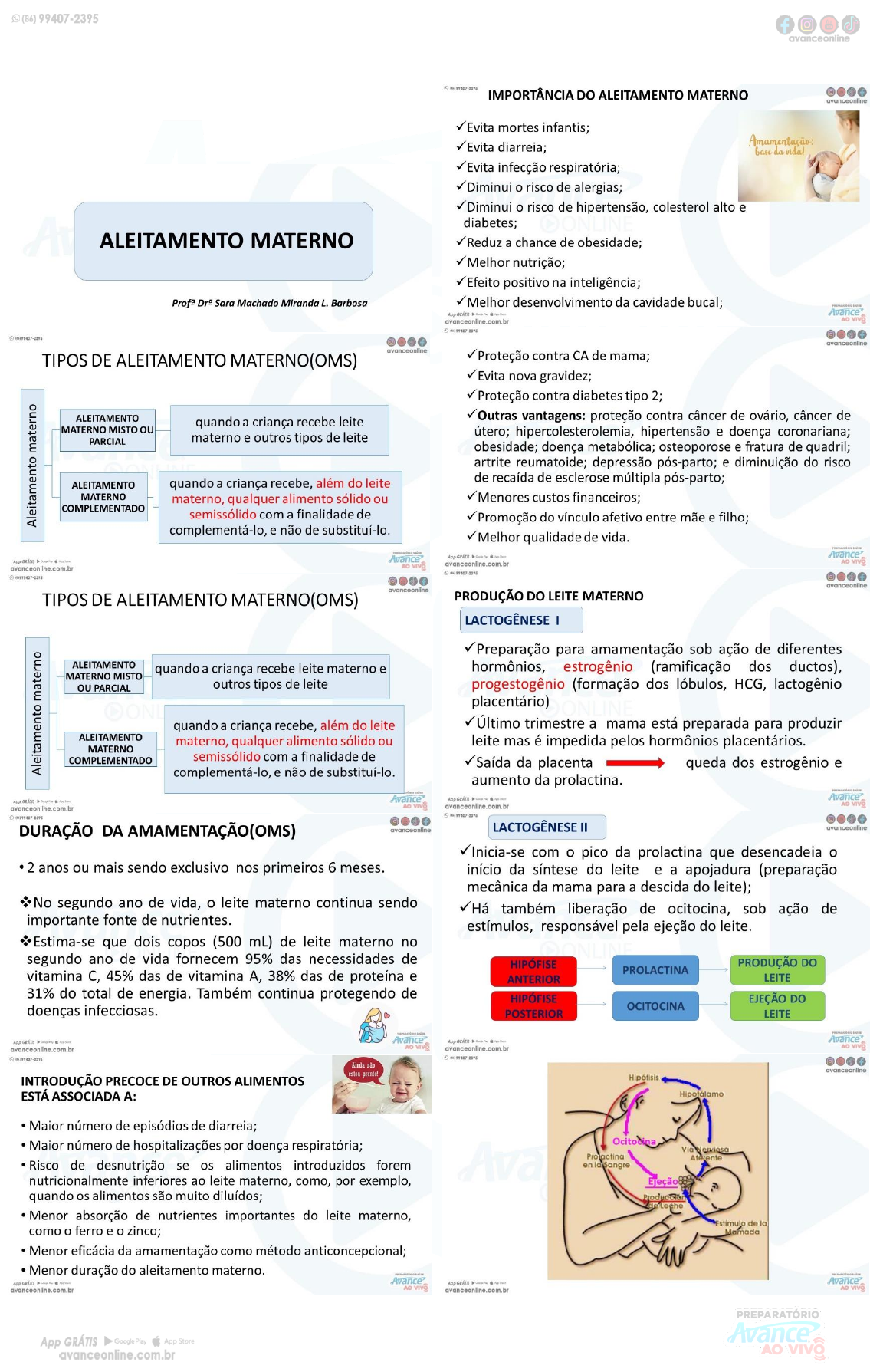 <p>TURMA DA POSSE – 09/02/2023 a 02/06/2023 - EXCLUSIVIDADE ALUNO AVANCE ONLINE</p><p>151</p><p>SAÚDE DA CRIANÇA</p><p>Profª Drª Sara Machado Miranda L.</p><p>Barbosa</p><p>TURMA DA POSSE – 09/02/2023 a 02/06/2023 - EXCLUSIVIDADE ALUNO AVANCE ONLINE</p><p>152</p><p>TURMA DA POSSE – 09/02/2023 a 02/06/2023 - EXCLUSIVIDADE ALUNO AVANCE ONLINE</p><p>153</p><p>TURMA DA POSSE – 09/02/2023 a 02/06/2023 - EXCLUSIVIDADE ALUNO AVANCE ONLINE</p><p>154</p><p>TURMA DA POSSE – 09/02/2023 a 02/06/2023 - EXCLUSIVIDADE ALUNO AVANCE ONLINE</p><p>155</p><p>TURMA DA POSSE – 09/02/2023 a 02/06/2023 - EXCLUSIVIDADE ALUNO AVANCE ONLINE</p><p>156</p><p>TURMA DA POSSE – 09/02/2023 a 02/06/2023 - EXCLUSIVIDADE ALUNO AVANCE ONLINE</p><p>157</p><p>TURMA DA POSSE – 09/02/2023 a 02/06/2023 - EXCLUSIVIDADE ALUNO AVANCE ONLINE</p><p>158</p><p>TURMA DA POSSE – 09/02/2023 a 02/06/2023 - EXCLUSIVIDADE ALUNO AVANCE ONLINE</p><p>159</p><p>TURMA DA POSSE – 09/02/2023 a 02/06/2023 - EXCLUSIVIDADE ALUNO AVANCE ONLINE</p><p>160</p><p>TURMA DA POSSE – 09/02/2023 a 02/06/2023 - EXCLUSIVIDADE ALUNO AVANCE ONLINE</p><p>161</p><p>TURMA DA POSSE – 09/02/2023 a 02/06/2023 - EXCLUSIVIDADE ALUNO AVANCE ONLINE</p><p>162</p><p>TURMA DA POSSE – 09/02/2023 a 02/06/2023 - EXCLUSIVIDADE ALUNO AVANCE ONLINE</p><p>163</p><p>TURMA DA POSSE – 09/02/2023 a 02/06/2023 - EXCLUSIVIDADE ALUNO AVANCE ONLINE</p><p>164</p><p>TURMA DA POSSE – 09/02/2023 a 02/06/2023 - EXCLUSIVIDADE ALUNO AVANCE ONLINE</p><p>165</p><p>TURMA DA POSSE – 09/02/2023 a 02/06/2023 - EXCLUSIVIDADE ALUNO AVANCE ONLINE</p><p>166</p><p>TURMA DA POSSE – 09/02/2023 a 02/06/2023 - EXCLUSIVIDADE ALUNO AVANCE ONLINE</p><p>167</p><p>TURMA DA POSSE – 09/02/2023 a 02/06/2023 - EXCLUSIVIDADE ALUNO AVANCE ONLINE</p><p>168</p><p>TURMA DA POSSE – 09/02/2023 a 02/06/2023 - EXCLUSIVIDADE ALUNO AVANCE ONLINE</p><p>169</p><p>TURMA DA POSSE – 09/02/2023 a 02/06/2023 - EXCLUSIVIDADE ALUNO AVANCE ONLINE</p><p>170</p><p>TURMA DA POSSE – 09/02/2023 a 02/06/2023 - EXCLUSIVIDADE ALUNO AVANCE ONLINE</p><p>171</p><p>TURMA DA POSSE – 09/02/2023 a 02/06/2023 - EXCLUSIVIDADE ALUNO AVANCE ONLINE</p><p>172</p><p>TURMA DA POSSE – 09/02/2023 a 02/06/2023 - EXCLUSIVIDADE ALUNO AVANCE ONLINE</p><p>173</p><p>TURMA DA POSSE – 09/02/2023 a 02/06/2023 - EXCLUSIVIDADE ALUNO AVANCE ONLINE</p><p>174</p><p>TURMA DA POSSE – 09/02/2023 a 02/06/2023 - EXCLUSIVIDADE ALUNO AVANCE ONLINE</p><p>175</p><p>TURMA DA POSSE – 09/02/2023 a 02/06/2023 - EXCLUSIVIDADE ALUNO AVANCE ONLINE</p><p>176</p><p>TURMA DA POSSE – 09/02/2023 a 02/06/2023 - EXCLUSIVIDADE ALUNO AVANCE ONLINE</p><p>177</p><p>TURMA DA POSSE – 09/02/2023 a 02/06/2023 - EXCLUSIVIDADE ALUNO AVANCE ONLINE</p><p>178</p><p>TURMA DA POSSE – 09/02/2023 a 02/06/2023 - EXCLUSIVIDADE ALUNO AVANCE ONLINE</p><p>179</p><p>TURMA DA POSSE – 09/02/2023 a 02/06/2023 - EXCLUSIVIDADE ALUNO AVANCE ONLINE</p><p>180</p><p>TURMA DA POSSE – 09/02/2023 a 02/06/2023 - EXCLUSIVIDADE ALUNO AVANCE ONLINE</p><p>181</p><p>AMAMENTAÇÃO</p><p>1- Conforme a Portaria nº 1.459/2011, a rede</p><p>cegonha organiza-se a partir de quatro</p><p>componentes. São eles, EXCETO:</p><p>a) Pré-Natal.</p><p>b) Puerpério e Atenção Integral à Saúde da</p><p>Criança.</p><p>c) Aleitamento Materno.</p><p>d) Parto e Nascimento.</p><p>e) Sistema Logístico: Transporte Sanitário e</p><p>Regulação.</p><p>2- Recomenda-se que o aleitamento materno</p><p>seja exclusivo até os:</p><p>a) 3 meses de vida da criança;</p><p>b) 6 meses de vida da criança;</p><p>c) 12 meses de vida da criança;</p><p>d) 2 anos de vida da criança;</p><p>3- A Organização Mundial de Saúde- OMS</p><p>destaca 4 pontos- chave, que caracterizam a</p><p>pega e o posicionamento adequados para</p><p>amamentação, exceto:</p><p>a) Bochechas do bebê encovadas a cada sucção;</p><p>b) Mais aréola visível acima da do bebê;</p><p>c) Lábio inferior virado para fora;</p><p>d) Cabeça e tronco do bebê alinhados;</p><p>e) Rosto do bebê de frente para a mama, com o</p><p>nariz na altura do mamilo.</p><p>4- São poucas as situações em que pode haver</p><p>indicação médica para substituição parcial ou</p><p>total do aleitamento materno. Assinale a</p><p>alternativa em que o aleitamento materno NÃO</p><p>deve ser recomendado.</p><p>a) Lactante que contraiu dengue.</p><p>b) Criança com refluxo gastroesofágico.</p><p>c) Lactante que faz uso de cigarro.</p><p>d) Nova gravidez, sem intercorrências.</p><p>e) Criança portadora de galactosemia.</p><p>5- A amamentação traz benefícios não só</p><p>nutritivos para o bebê, mas também para a</p><p>mulher que amamenta. São benefícios</p><p>maternos, EXCETO:</p><p>a) Proteção contra o câncer de mama.</p><p>b) Reduz a perda de sangue pós-parto.</p><p>c) Redução de peso e realização pessoal.</p><p>d) Evita nova gestação.</p><p>e) Redução da probabilidade de problemas futuros</p><p>como diabetes, obesidade e hipertensão.</p><p>6- O Ministério da Saúde lançou em 2020 uma</p><p>campanha de incentivo ao Aleitamento</p><p>Materno. Apresentou que em relação ao</p><p>aleitamento materno continuado até os dois</p><p>anos, o aumento foi de 22,7 vezes no primeiro</p><p>ano de vida e de 23,5 em menores de dois anos,</p><p>em comparação com os dados de pesquisa</p><p>realizada em 1986. Analise as assertivas e</p><p>assinale a alternativa correta.</p><p>I. Amamentar é um direito da mãe, o aleitamento</p><p>materno colabora com o desenvolvimento infantil,</p><p>pelos diversos estímulos que a criança é</p><p>submetida, como a troca de calor, sons, cheiros,</p><p>olho no olho e toques.</p><p>II. A recomendação é que a criança seja</p><p>amamentada na primeira hora de vida, sendo</p><p>exclusivo até os 6 meses de idade, podendo ser</p><p>estendida por 2 anos ou mais.</p><p>III. A oferta de alimentos antes dos 6 meses, além</p><p>de desnecessário pode ser prejudicial, porque</p><p>aumenta o risco da criança fic
